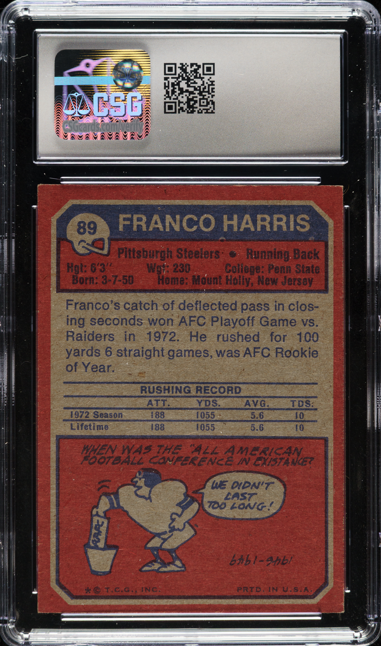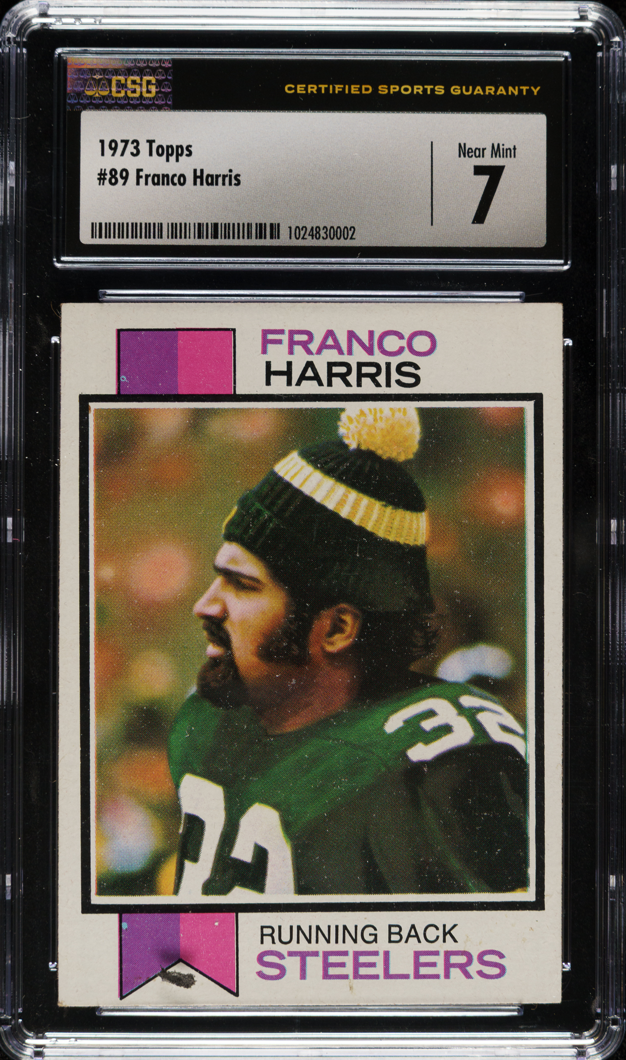 Graded NM 7 by CSG. Pittsburgh Steelers football Hall of Famer Franco Harris.