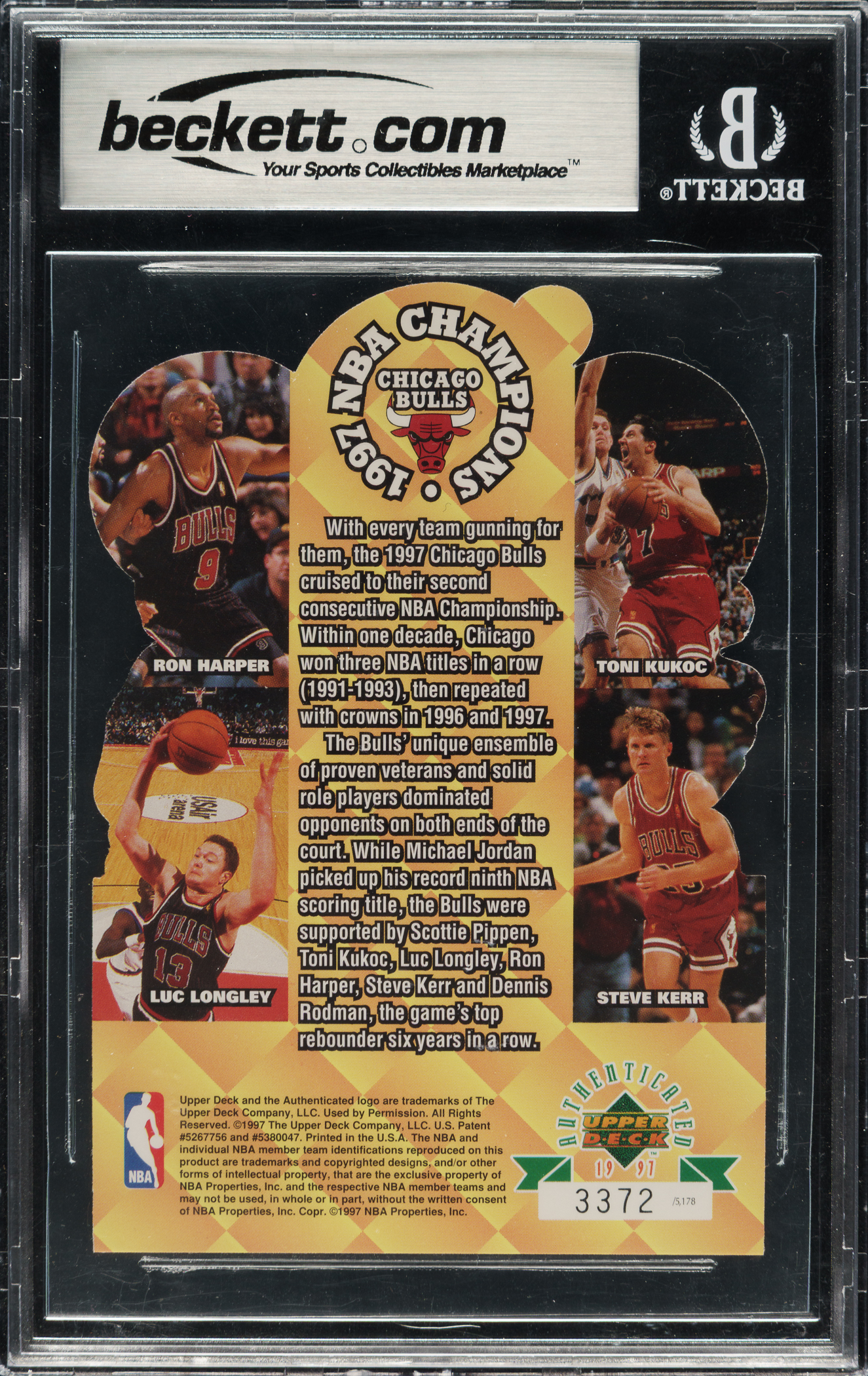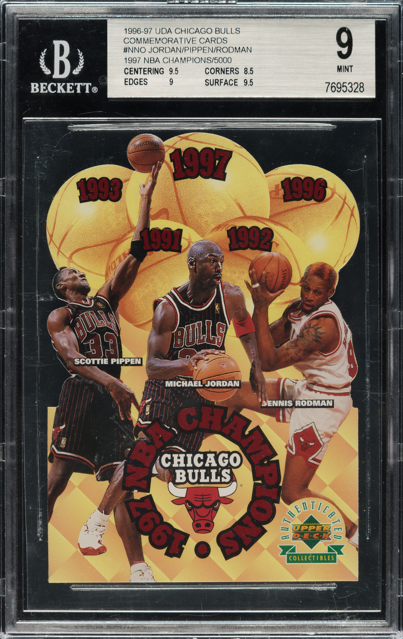 Graded MINT 9 by BGS. Chicago Bulls basketball Hall of Famers Michael Jordan, Scottie Pippen and Dennis Rodman.