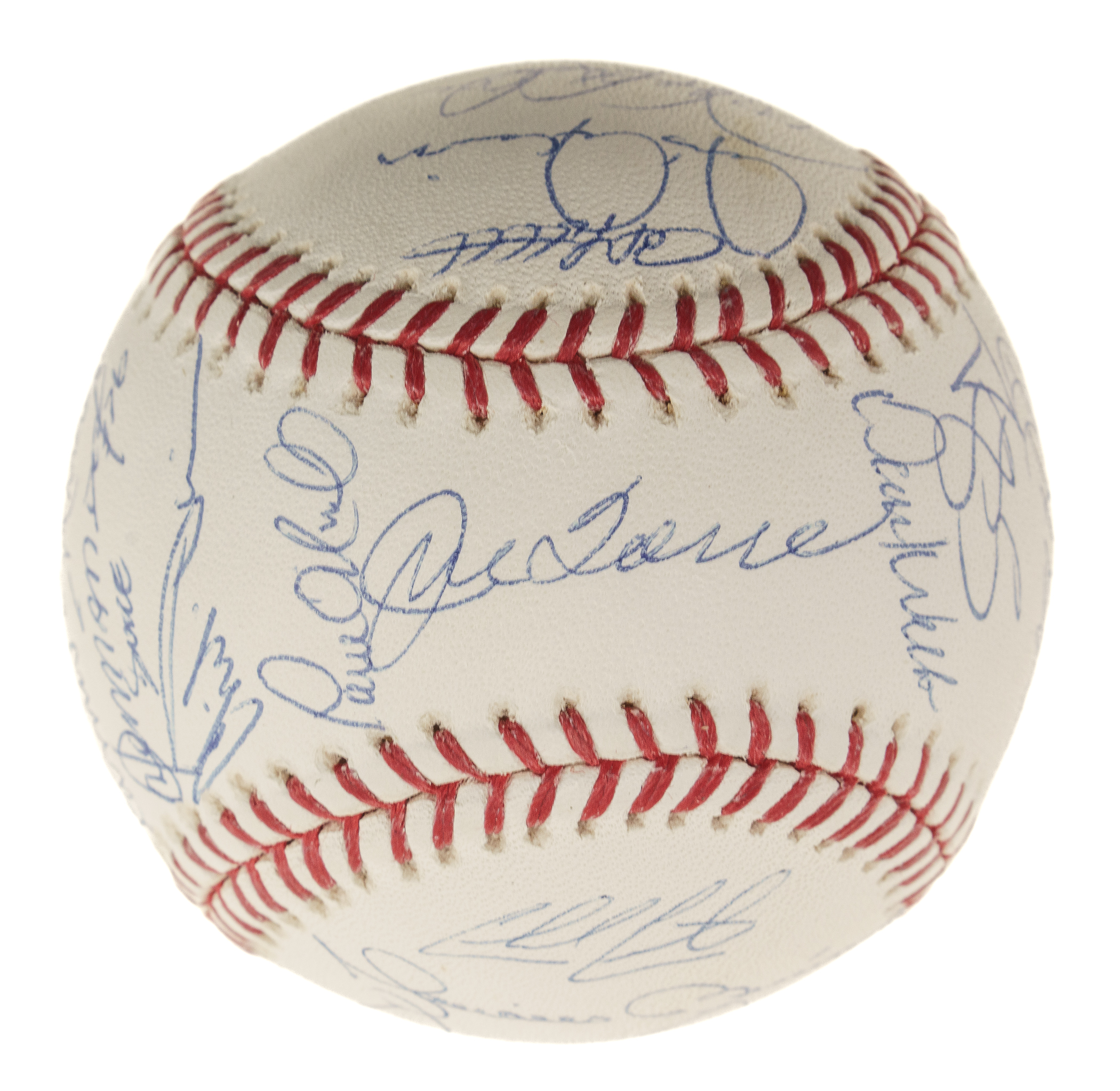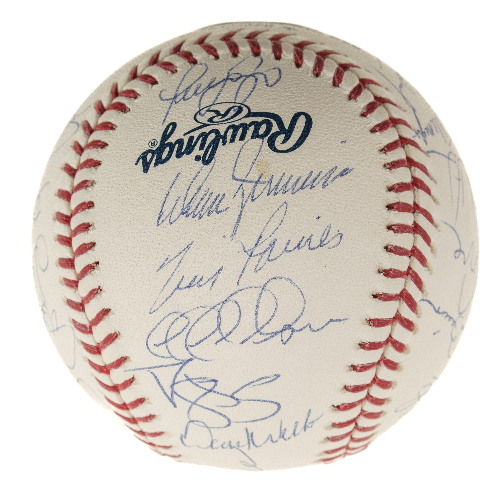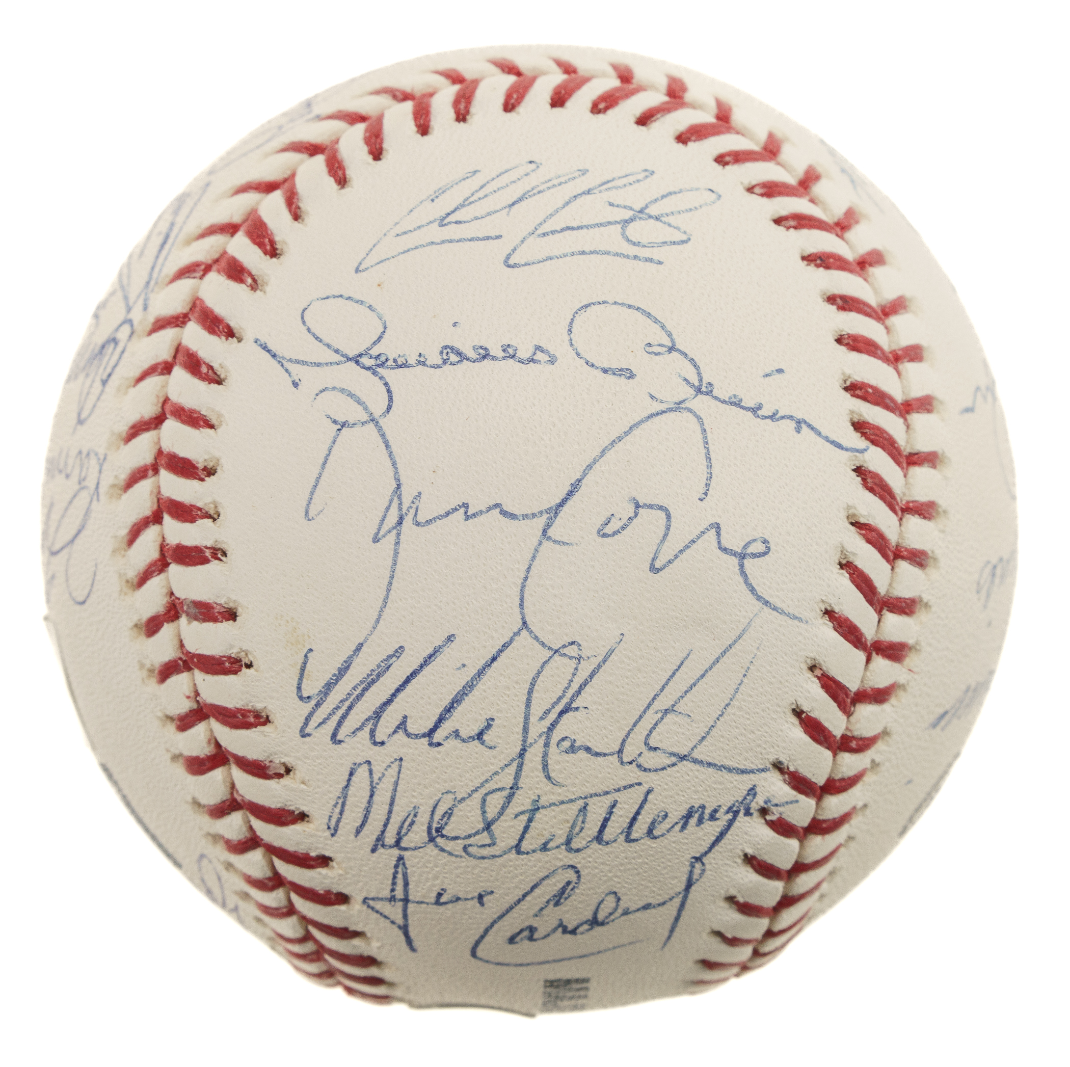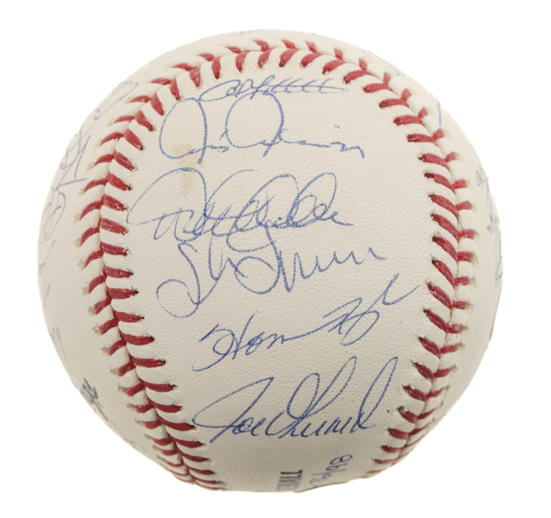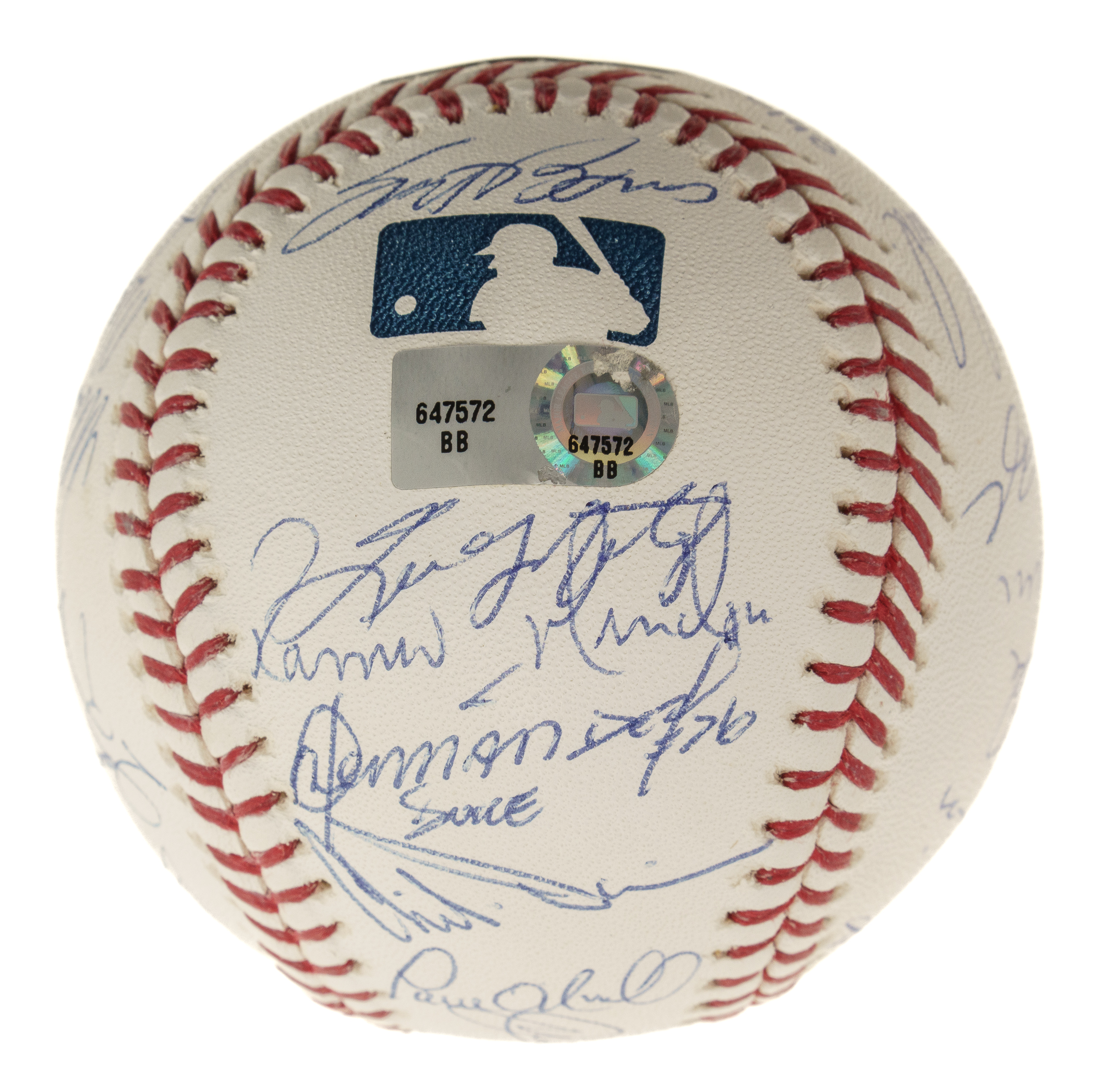Official Major League baseball (Selig) signed in blue ink by 25 members of the 1998 World Champion New York Yankees. Notable signatures include Torre (mgr., sweet spot), Brosius, Davis, O'Neill, Raines, Strawberry, Wells, Rivera, Cone, Stottlemyre (coach), Pettitte, Jeter, and Girardi. The ball bears a "76/98" limitation number. The ball displays a few tiny spots of light toning but is otherwise in Near Mint condition overall. MLB and Steiner certification stickers are affixed to the ball. Auction LOA from James Spence/JSA.