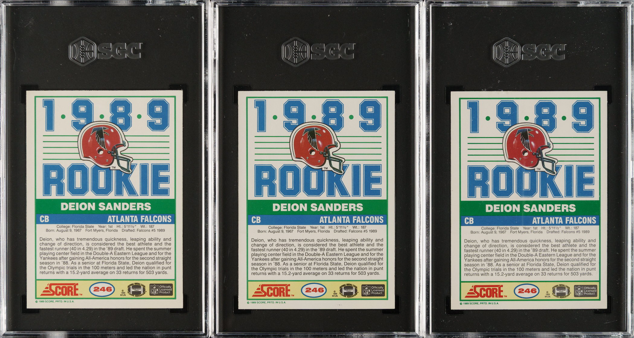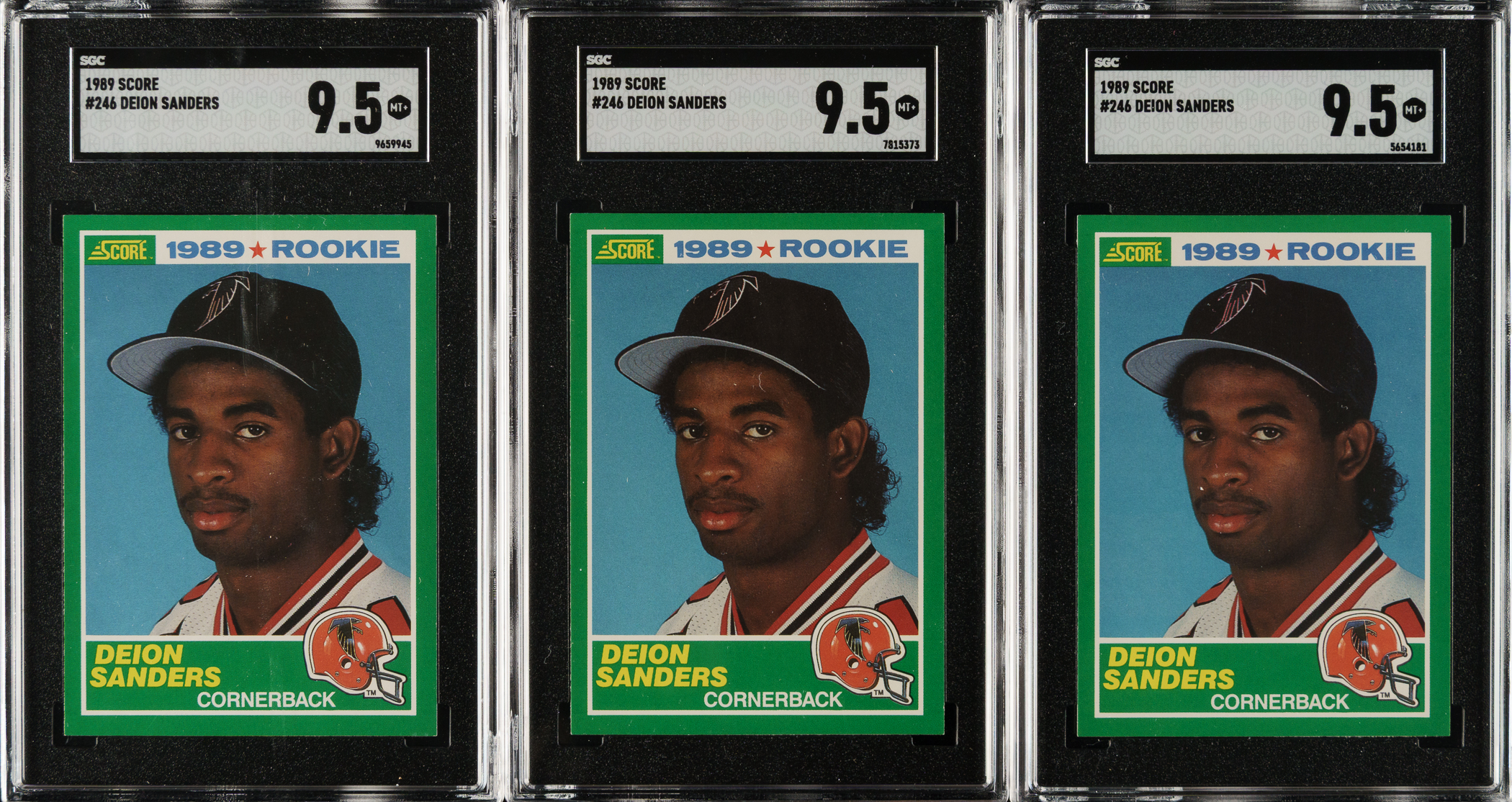 Trio of 1989 Score Football cards, featuring Atlanta Falcons football Hall of Famer Deion Sanders. Each card has been graded and encapsulated MINT+ 9.5 by SGC. Total: 3 cards.