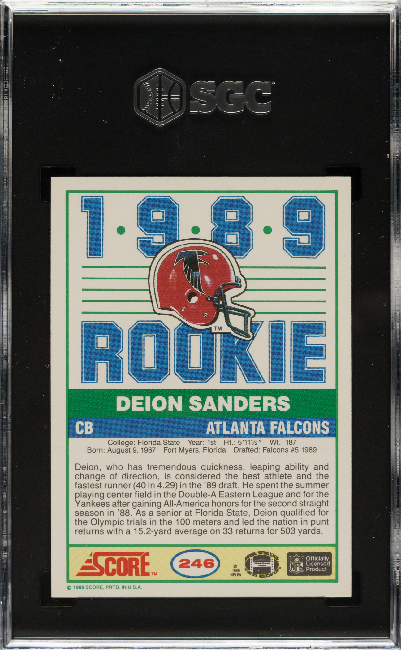 Lot # 3092: 1989 Score Football #246 Deion Sanders Rookie SGC GEM MINT 10