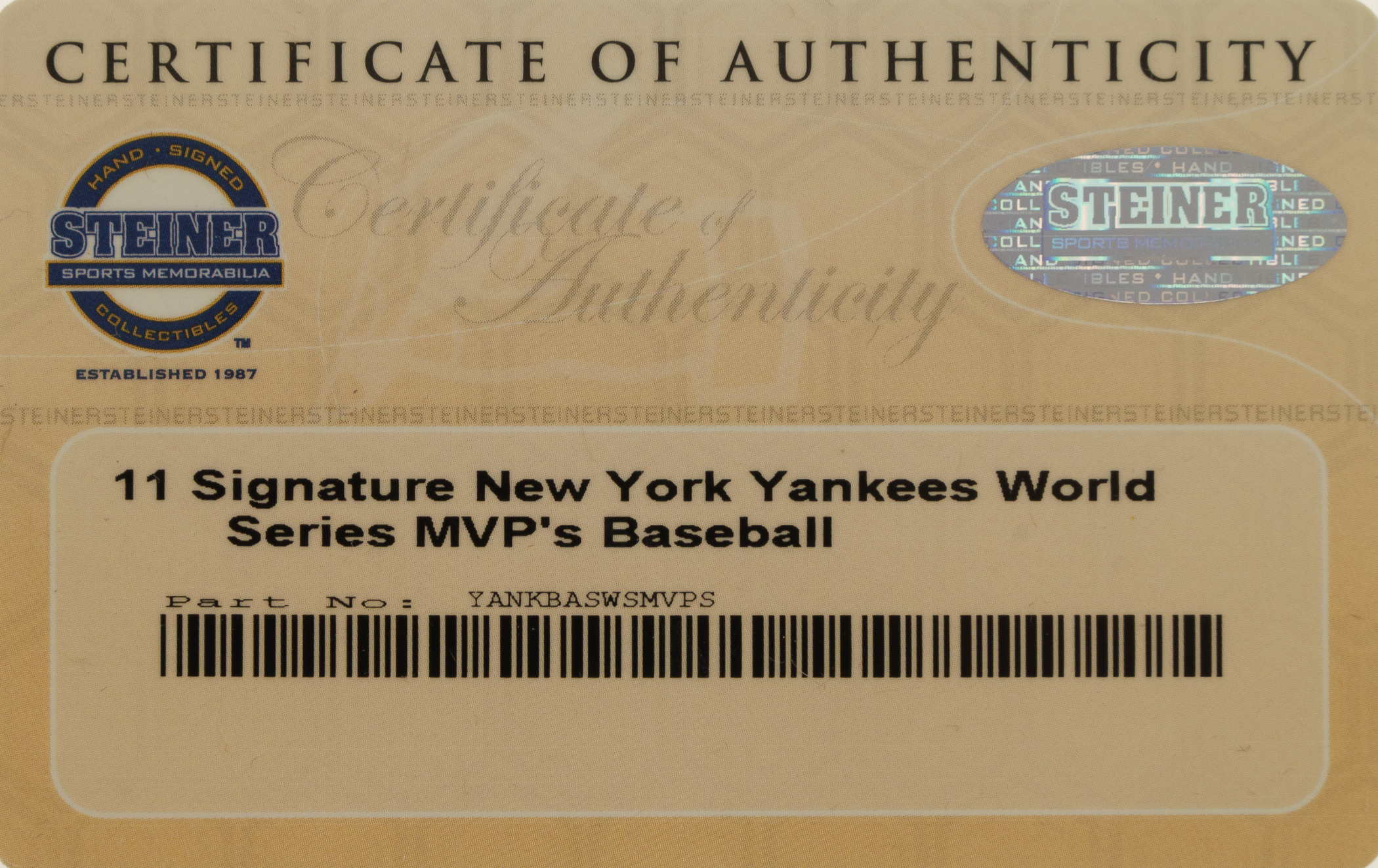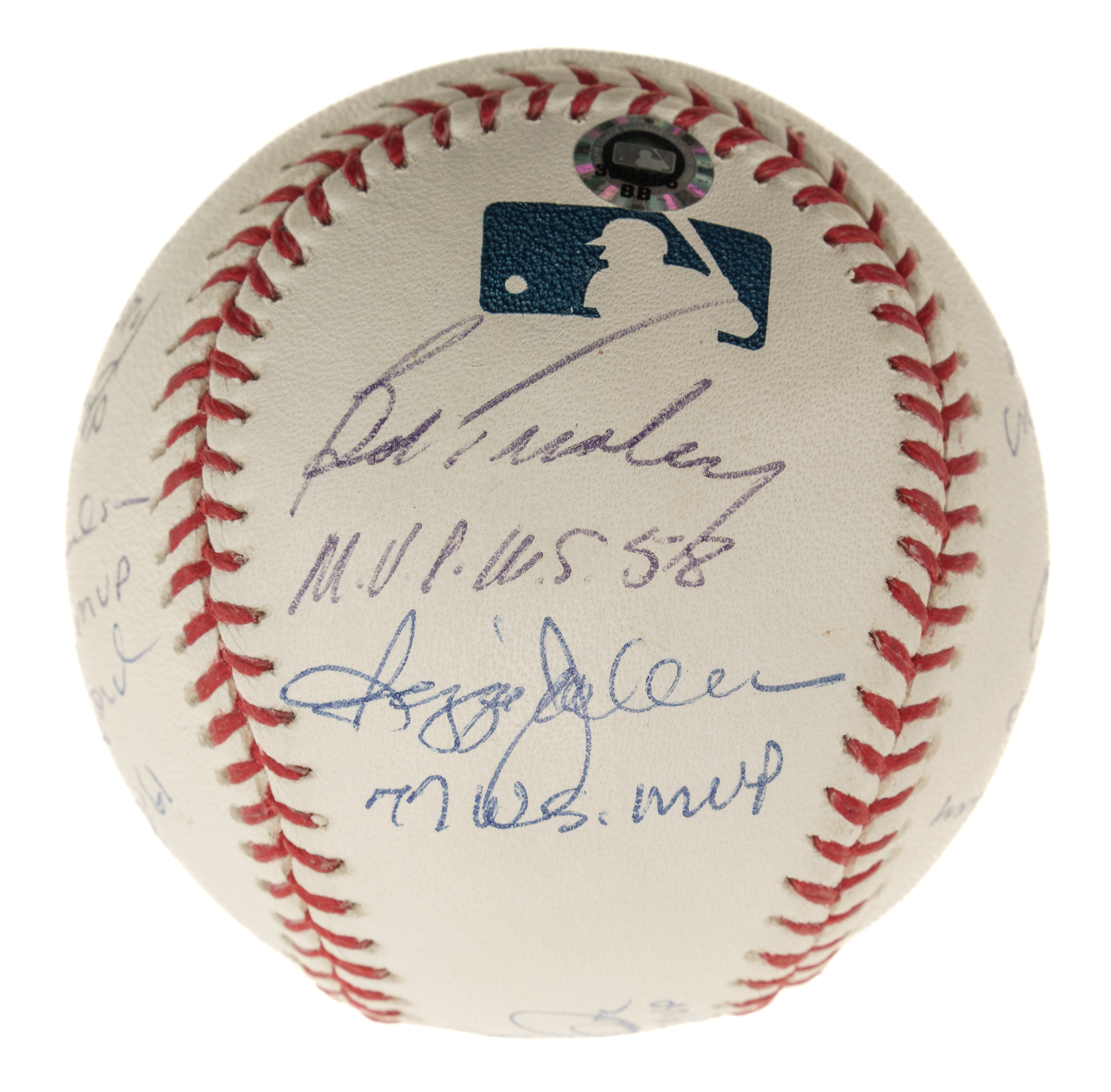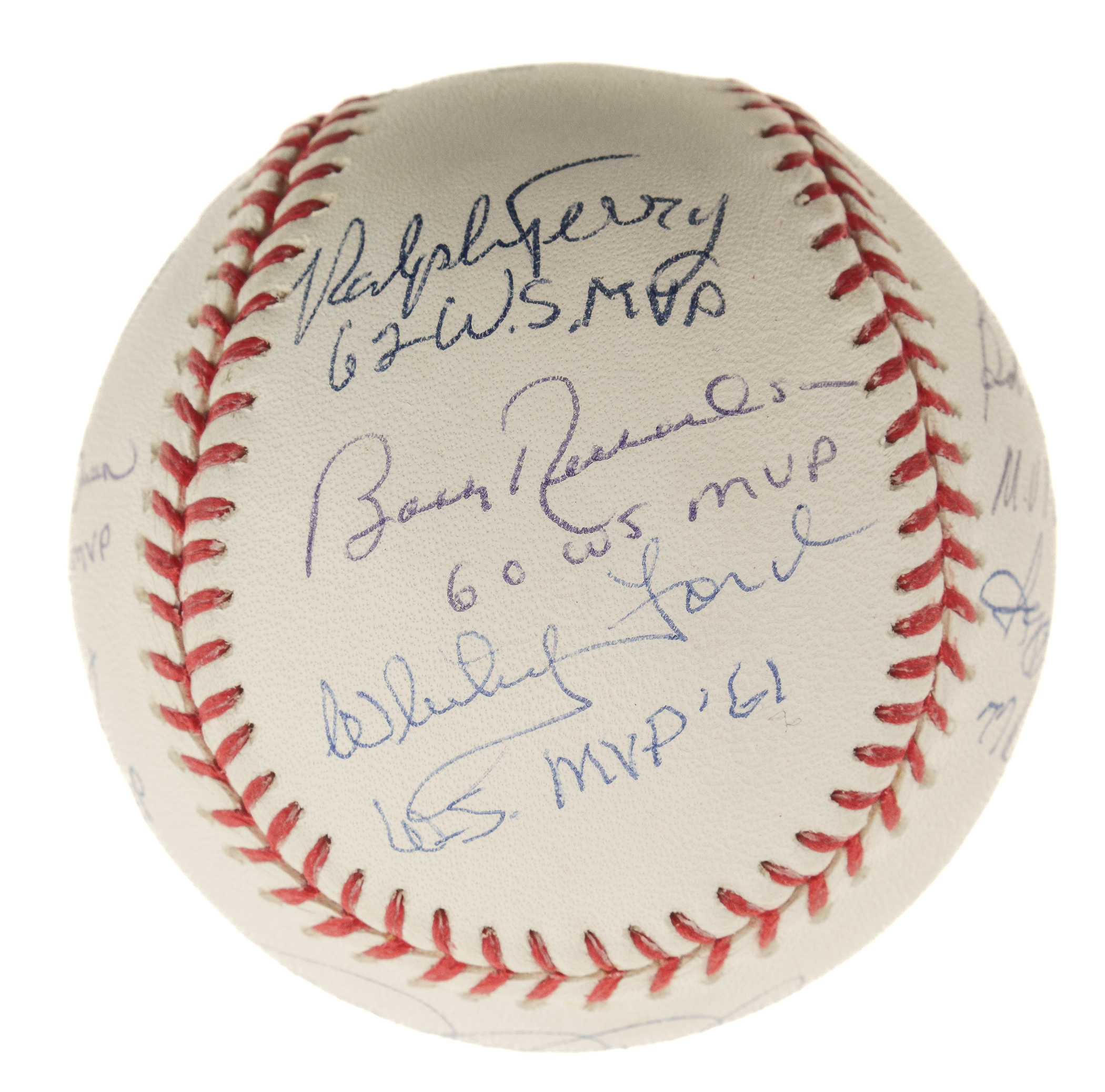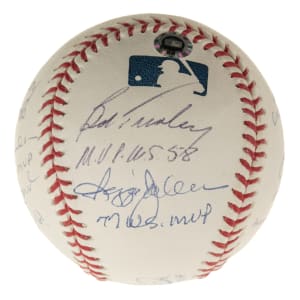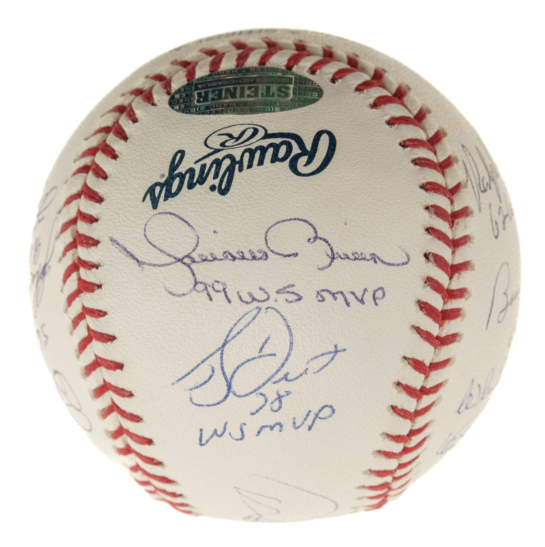 Official Major League baseball (Selig) signed in blue ink by 11 New York Yankees World Series MVPs. The signatures are paired with inscriptions that note what year the player won the award. The ball is signed by Derek Jeter (sweet spot), Bob Turley, Reggie Jackson, Mariano Rivera, Bucky Dent, Don Larsen, John Wetteland, Scott Brosius, Ralph Terry, Bobby Richardson, and Whitey Ford. Near Mint condition overall. Steiner and MLB certification stickers are affixed to the ball. Auction LOA from James Spence/JSA.