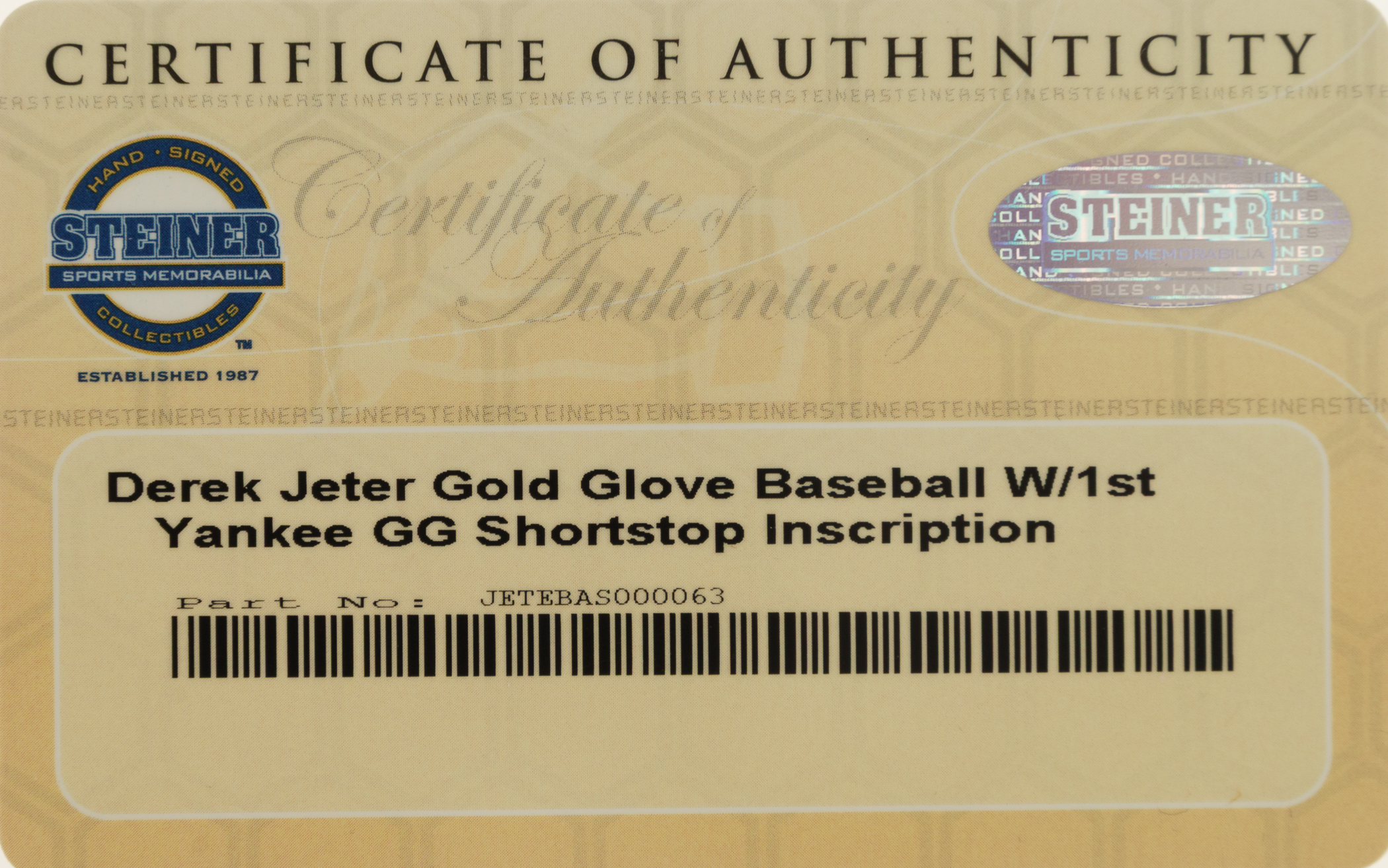 New York Yankees Hall of Famer Derek Jeter signed baseball. MLB certification sticker is affixed to the baseball. COA from Steiner.