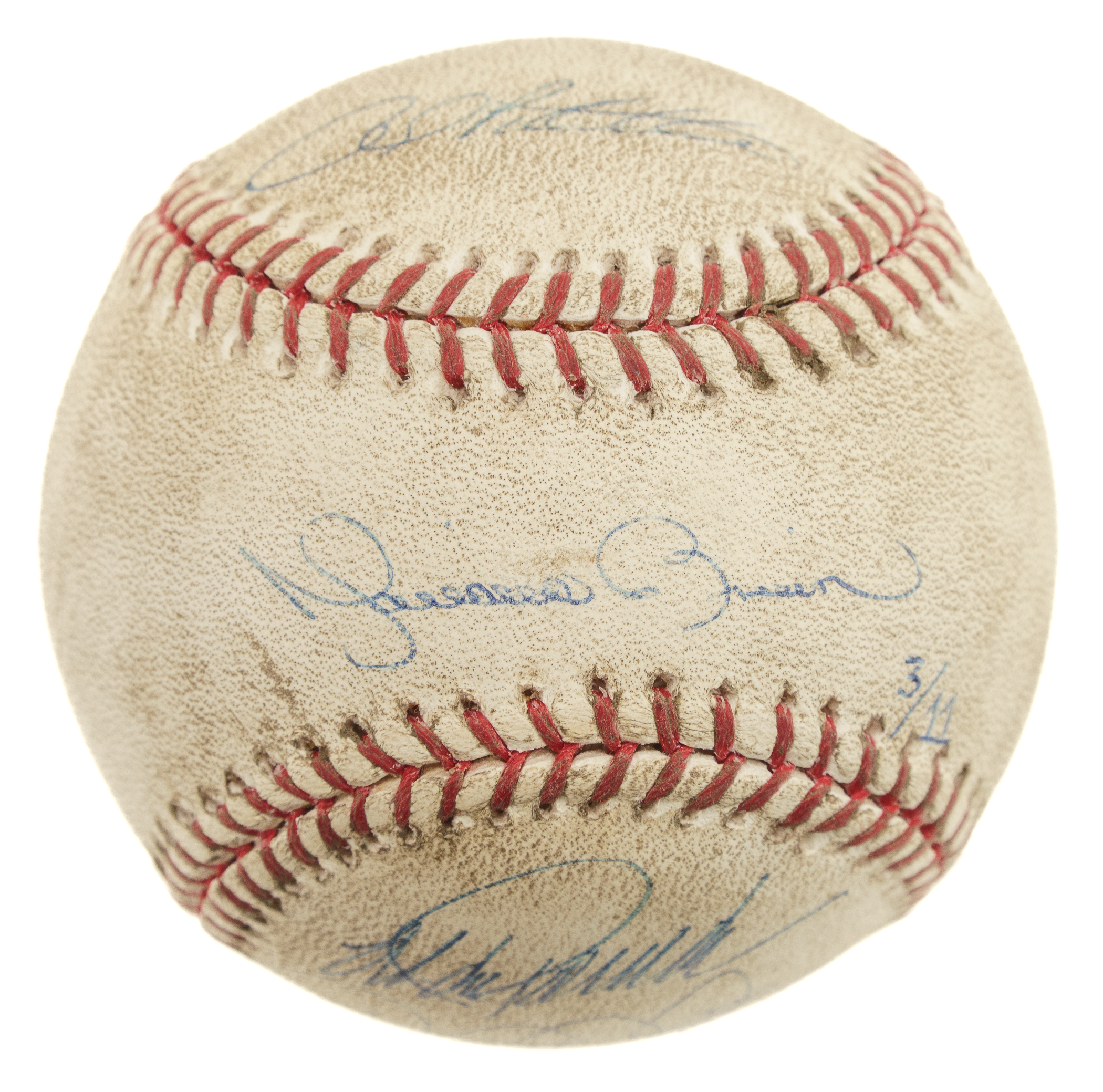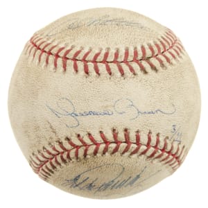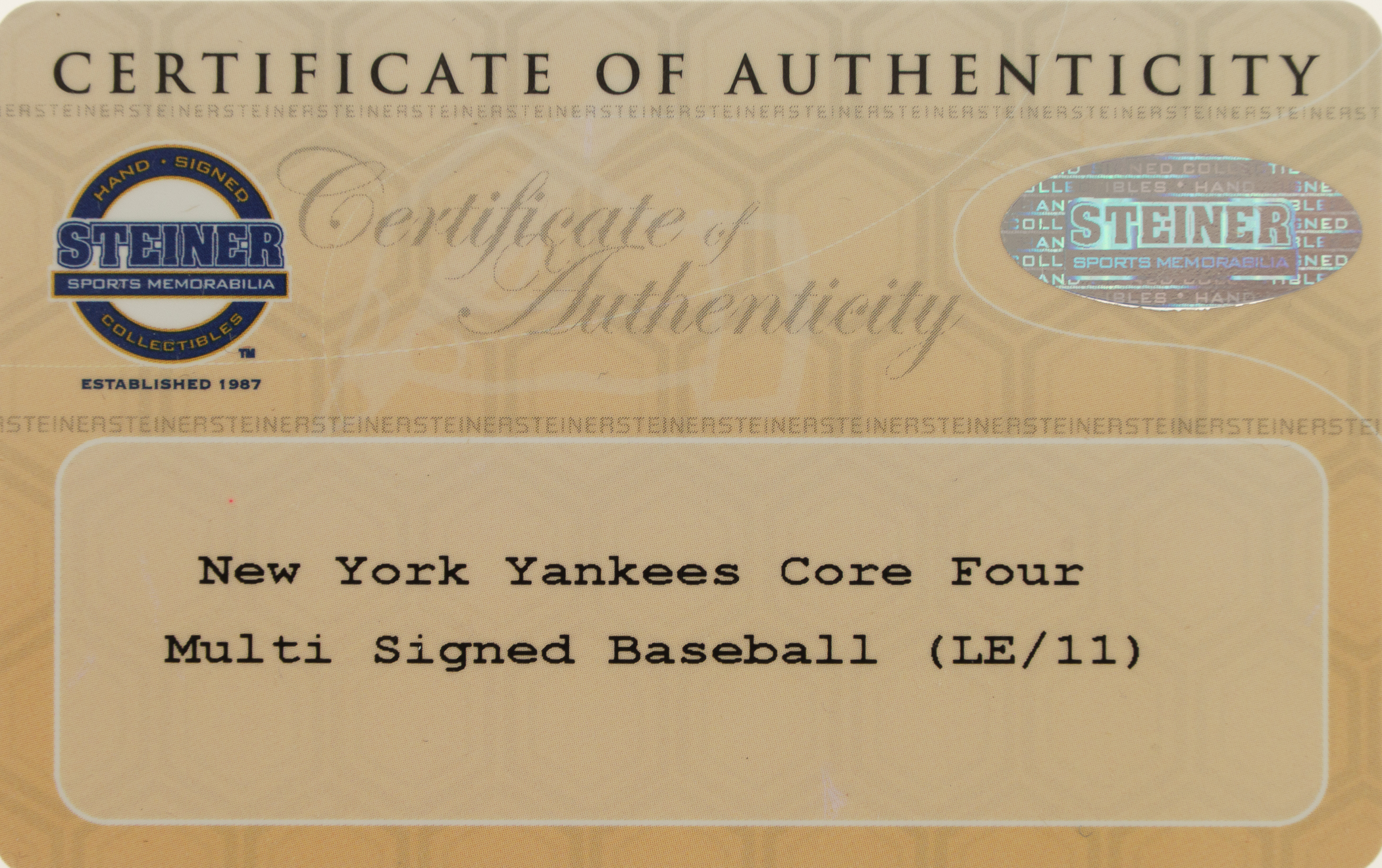 On August 21, 2009, the New York Yankees defeated the Boston Red Sox 20-11 at Fenway Park in the highest-scoring game ever played between these ancient rivals. Offered is a game-used baseball from that historic contest, signed by the Yankees' famed "Core Four" of Mariano Rivera (sweet spot), Jorge Posada, Derek Jeter, and Andy Pettitte. The ball, which bears a "3/11" limitation number, is moderately soiled, consistent with that of a game-used ball. The ball is affixed with MLB and Steiner certification stickers. Auction LOA from James Spence/JSA.