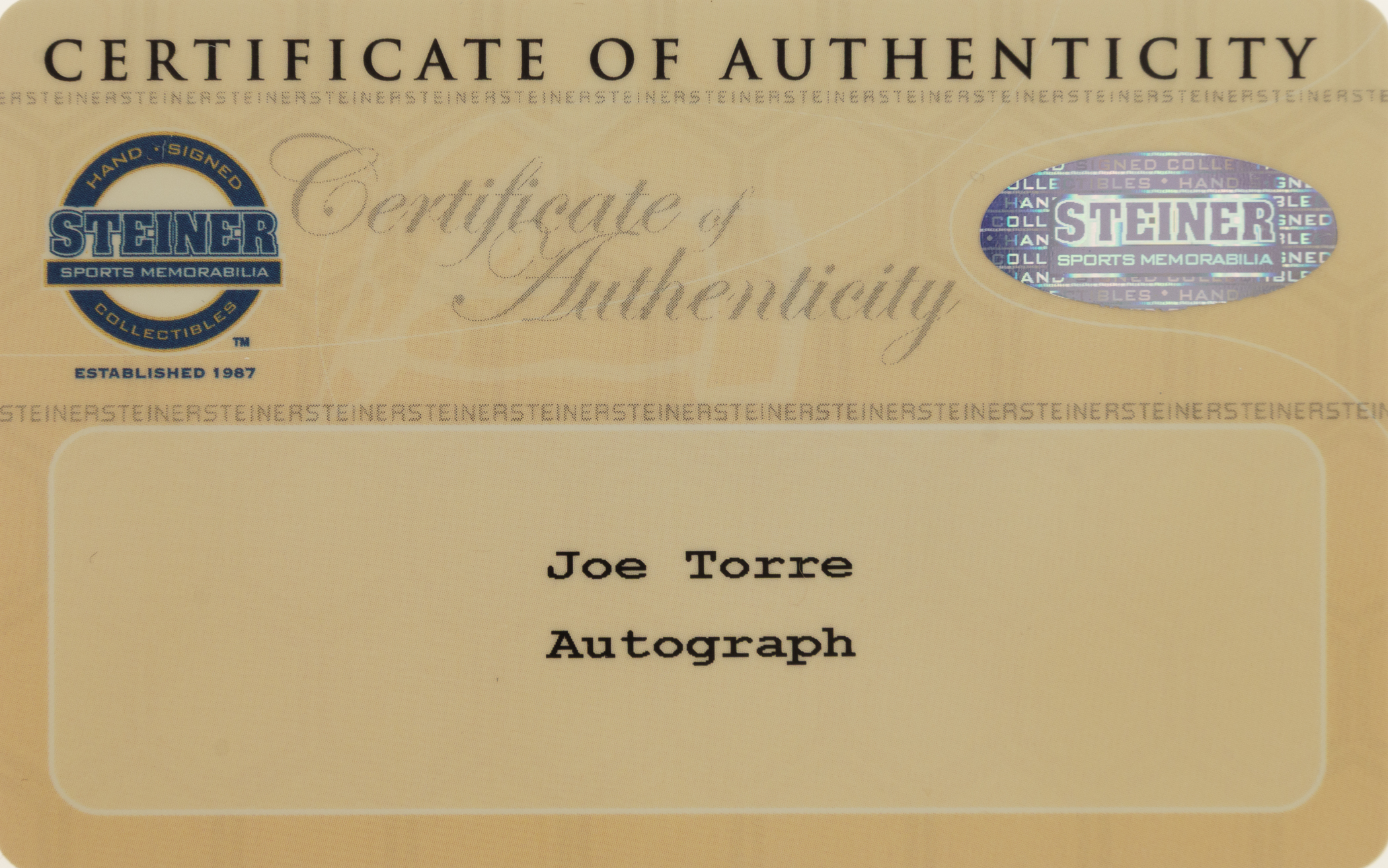 New York Yankees Hall of Famer Joe Torre signed baseball. MLB certification sticker is affixed to the baseball. COA from Steiner.