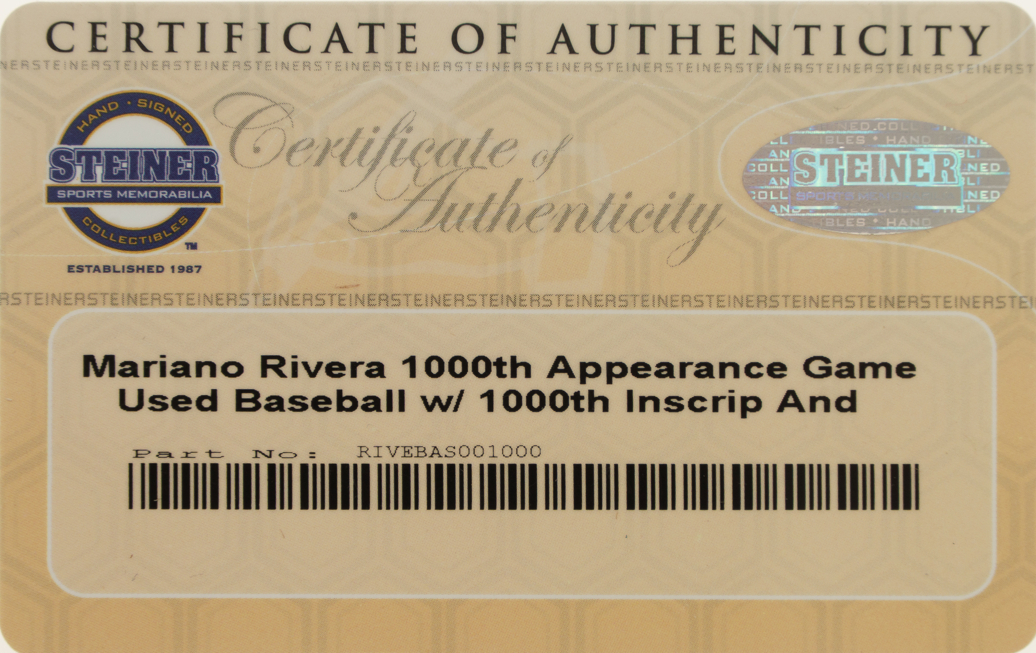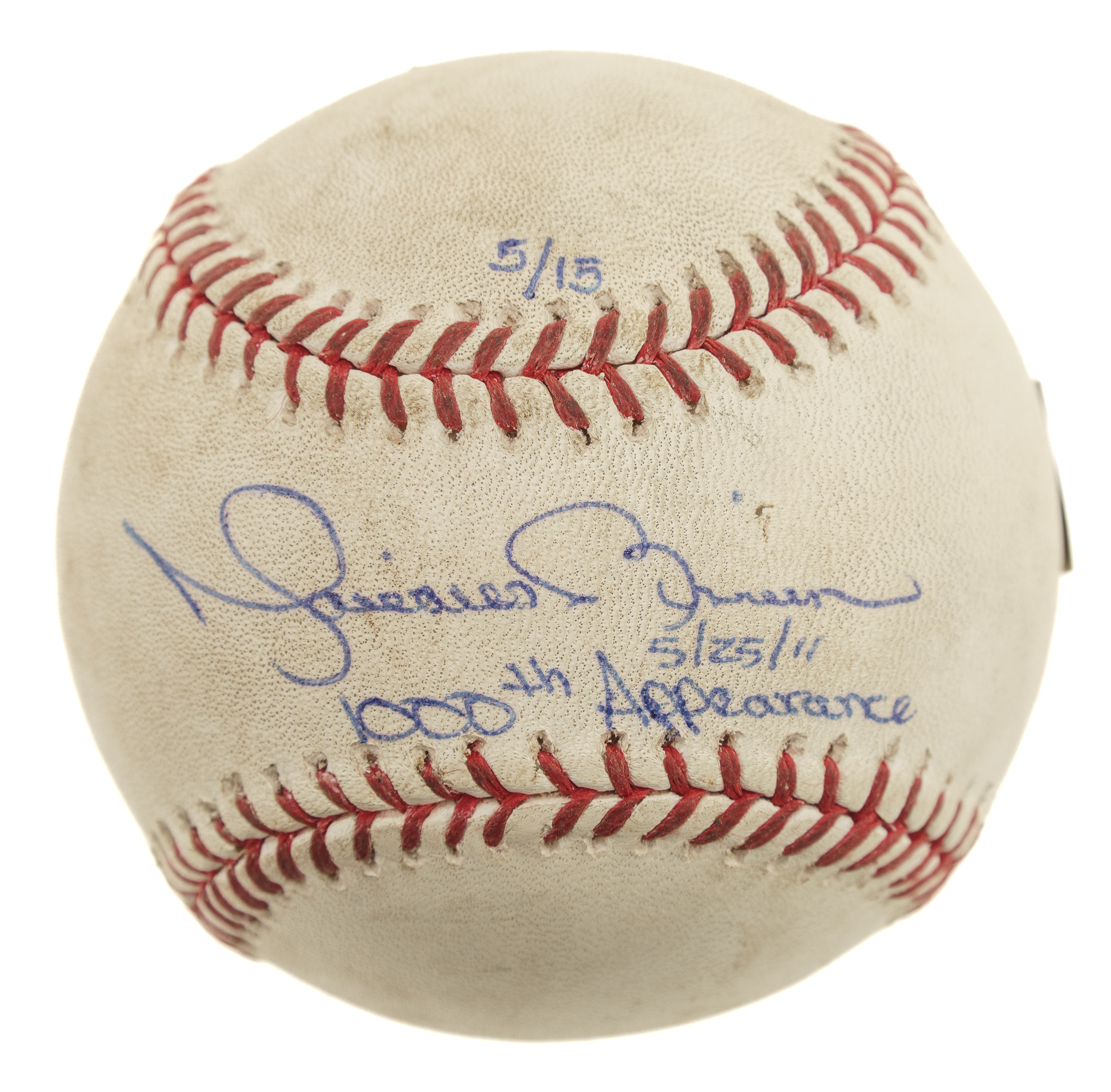 On May 25, 2011, Hall of Fame closer Mariano Rivera appeared in his 1000th career game, pitching a scoreless inning in the New York Yankees' 7-3 win over the Toronto Blue Jays at Yankee Stadium. Offered is a game-used baseball from that contest. Rivera has signed the Official Major League baseball (Selig) "Mariano Rivera/'5-25-'11/1000th Appearance" in blue ink along the sweet spot. The ball, which bears a "5/15" limitation number, is lightly soiled, consistent with that of a game-used ball. The ball is affixed with MLB and Steiner certification stickers. Auction LOA from James Spence/JSA.