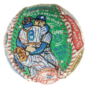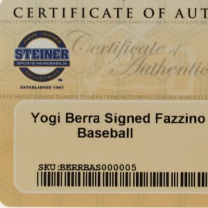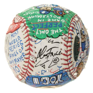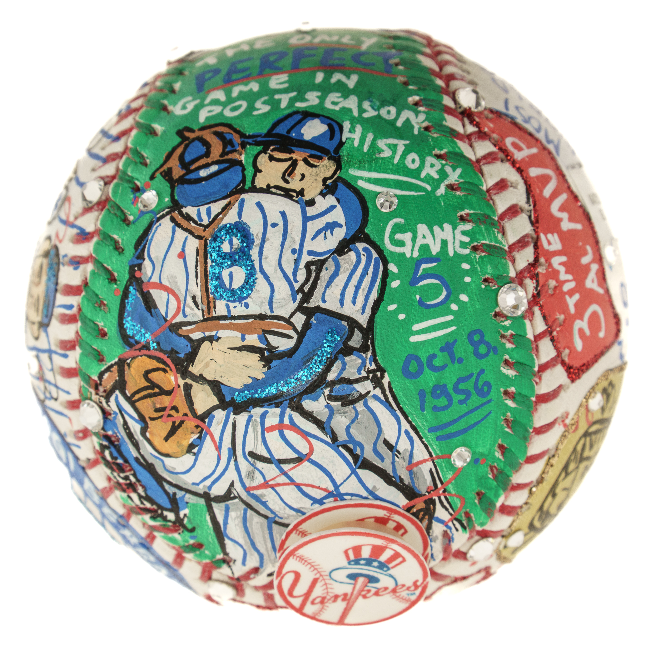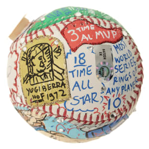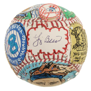 Charles Fazzino mixed-media artwork on a regulation baseball signed by Yogi Berra. Also signed by Fazzino on a separate panel. This is one of the most unusual Yogi Berra signed pieces we have seen, and it is accompanied by a COA from Steiner Sports. The colorful 3D artwork on the ball commemorates Berra's Hall of Fame career both in pictures and words and has been signed by Berra in blue ink on the sweet spot. Charles Fazzino is a world-renowned pop artist who is best known today for his stunning 3D giclees. All of Fazzino's 3D artworks are meticulously pieced together by the artist and then hand embellished with the application of acrylic paint glitter and often crystals. This is one of five Fazzino baseballs featured in this auction, and it truly has to be seen in person to appreciate the meticulous craftsmanship that has gone into its production. Near Mint condition. The ball is affixed with certification stickers from MLB and Steiner.