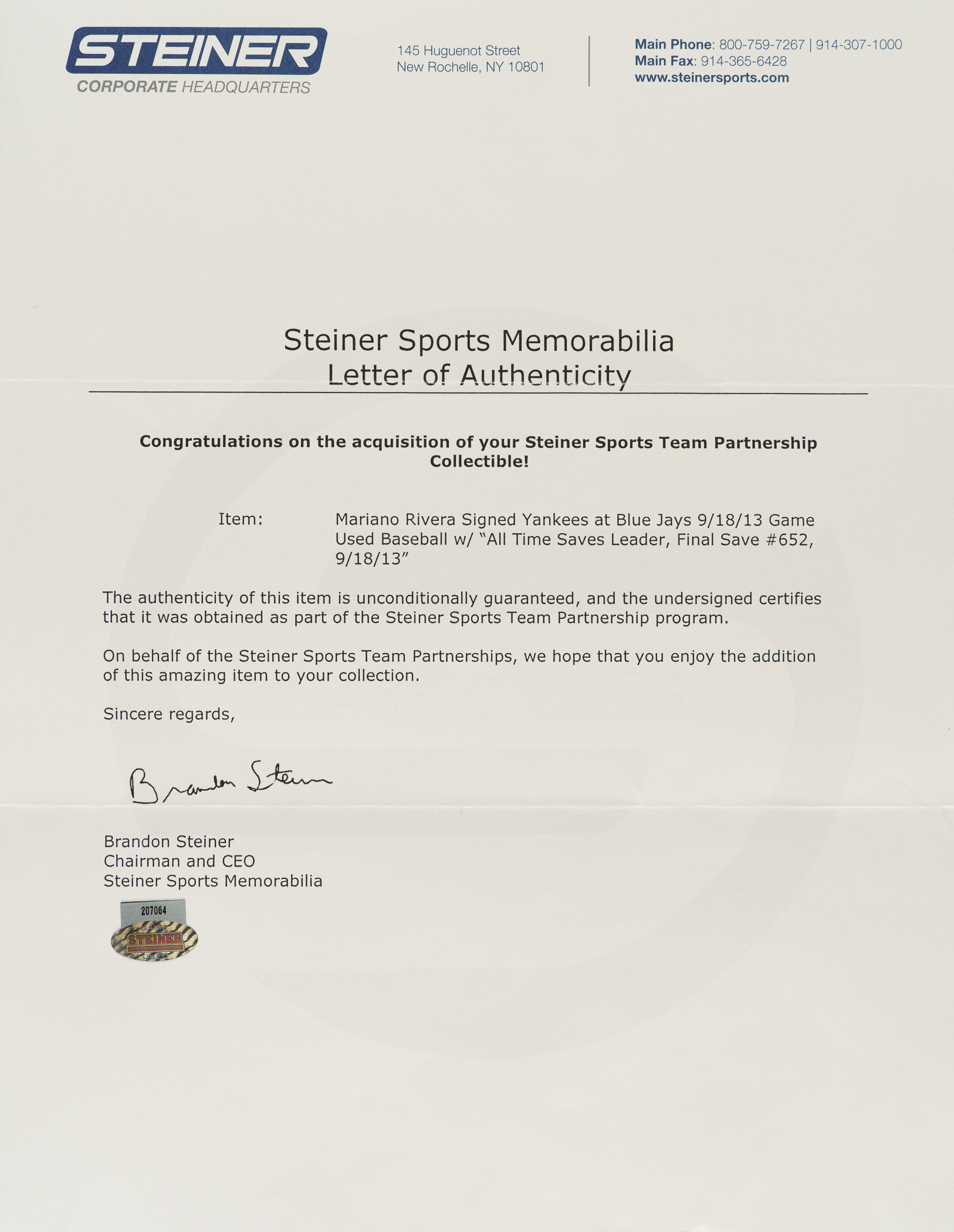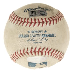 On September 18, 2013, Hall of Fame closer Mariano Rivera recorded his 652nd and final career save in the New York Yankees' 4-3 win over the Toronto Blue Jays at the Rogers Centre. Offered is a game-used baseball from that contest. Rivera has signed the Official Major League baseball (Selig) "Mariano Rivera/All Time Savers Leader/Final Save #652/9-18-'13" in blue ink along the sweet spot. The ball is lightly soiled, consistent with that of a game-used ball. The ball is affixed with MLB and Steiner certification stickers. Auction LOA from James Spence/JSA.