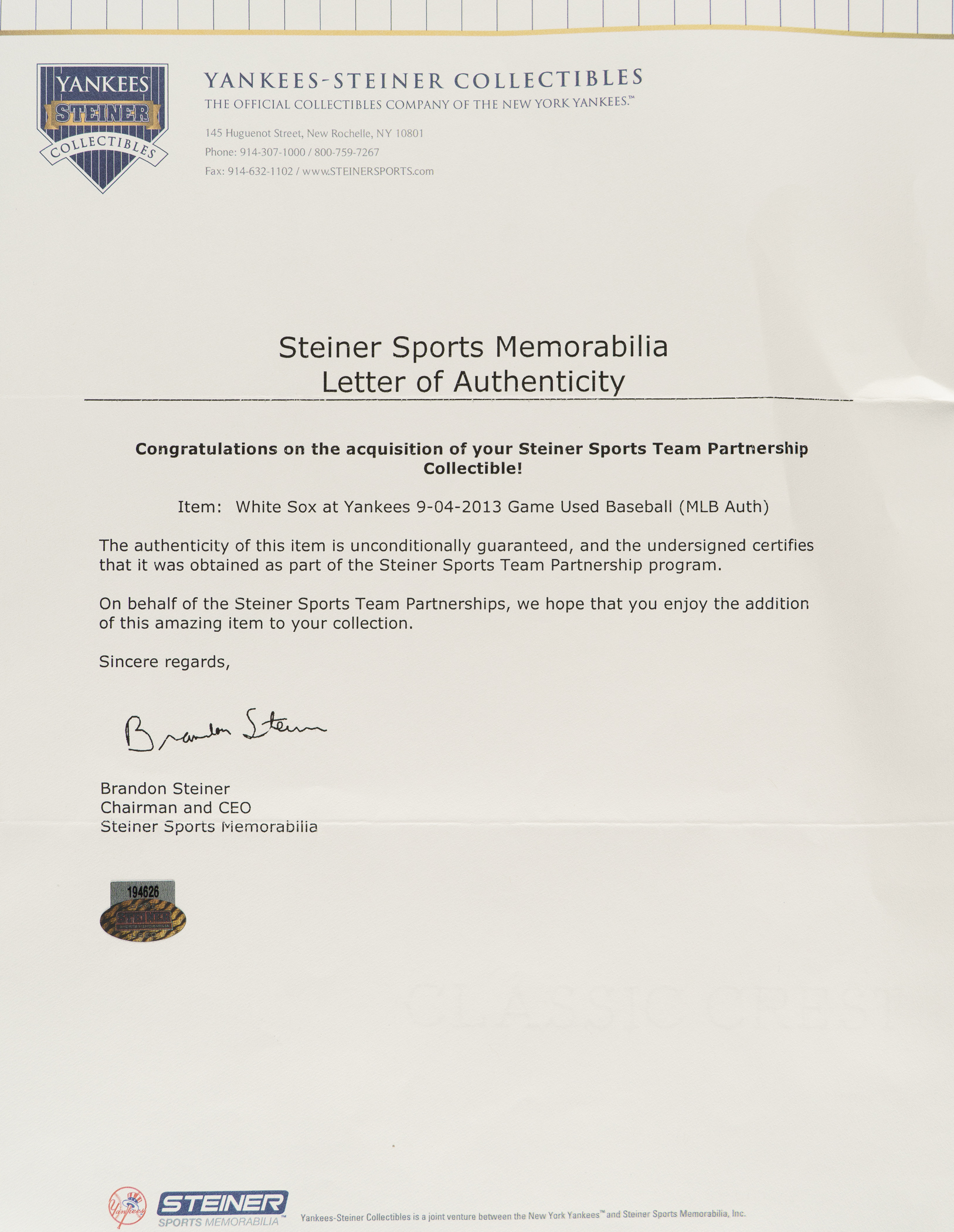 On September 4, 2013, Hall of Fame closer Mariano Rivera recorded his final career save at Yankee Stadium in the New York Yankees' 6-5 win over the Chicago White Sox. Offered is a game-used baseball from that contest. Rivera has signed the Official Major League baseball (Selig) "Mariano Rivera/Save 649/Last Save at Home" in blue ink along the sweet spot. The ball is moderately soiled, consistent with that of a game-used ball. The ball is affixed with MLB and Steiner certification stickers. Auction LOA from James Spence/JSA.