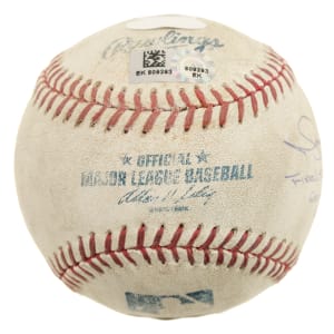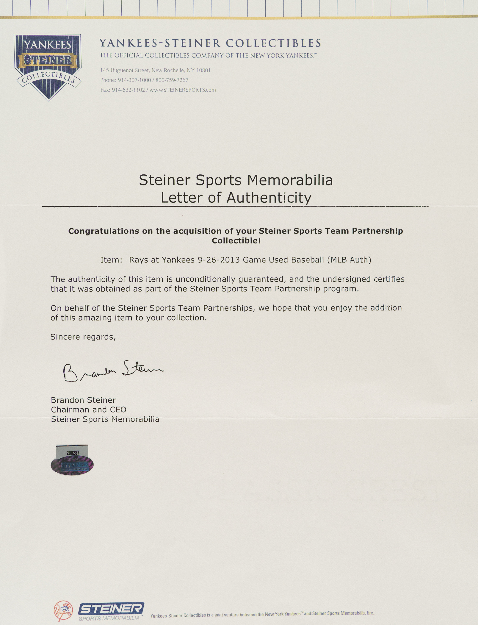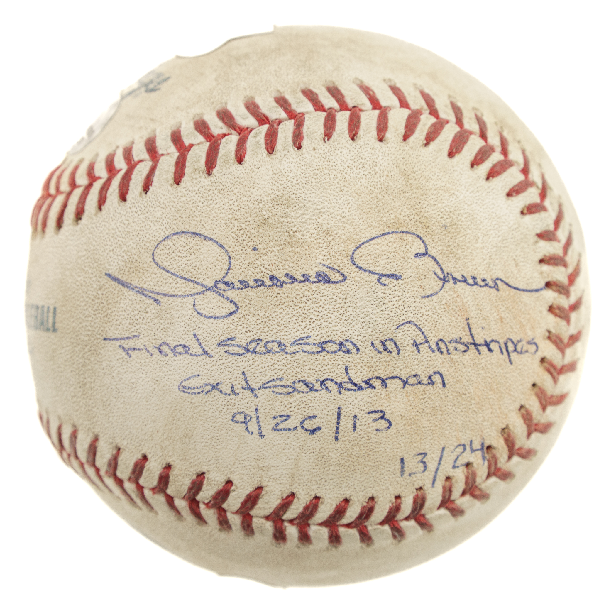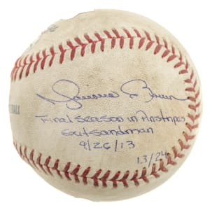 On September 26, 2013, Hall of Fame closer Mariano Rivera appeared in his final career game, pitching 1 1/3 scoreless innings in the New York Yankees' 4-0 loss to the Tampa Bay Rays at Yankee Stadium. Offered is a game-used baseball from that contest. Rivera has signed the Official Major League baseball (Selig) "Mariano Rivera/Final Season in Pinstripes/Exit Sandman/9-26-'13" in blue ink along a side panel. The ball, which bears a "13/24 limitation number, is lightly soiled, consistent with that of a game-used ball. The ball is affixed with MLB and Steiner certification stickers. Auction LOA from James Spence/JSA.