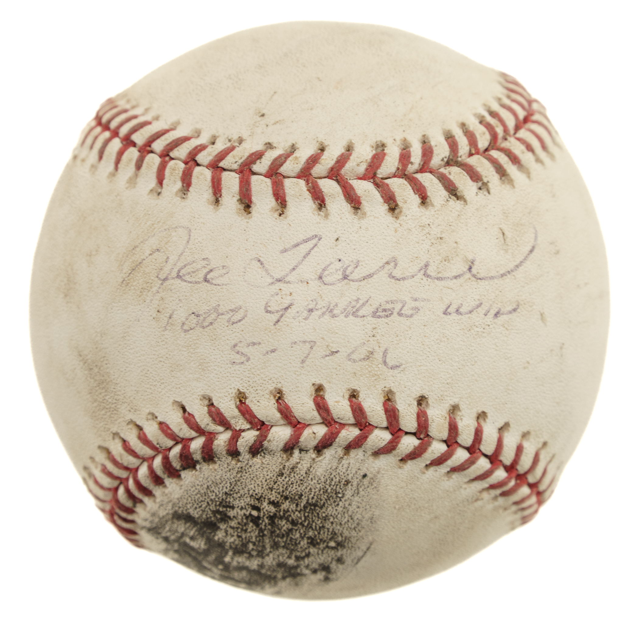 On May 7, 2006, Hall of Famer Joe Torre became just the fourth manager to win 1,000 games with the New York Yankees, reaching the milestone in a 6-4 victory over the Texas Rangers at Ameriquest Field. Offered is a game-used baseball from that contest. Torre has signed the Official Major League baseball (Selig) "Joe Torre/1000 Yankee Win/5-7-'06" in blue ink along the sweet spot. The ball is lightly soiled, consistent with that of a game-used ball. The ball is affixed with MLB and Steiner certification stickers. Auction LOA from James Spence/JSA.