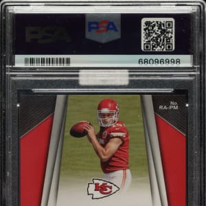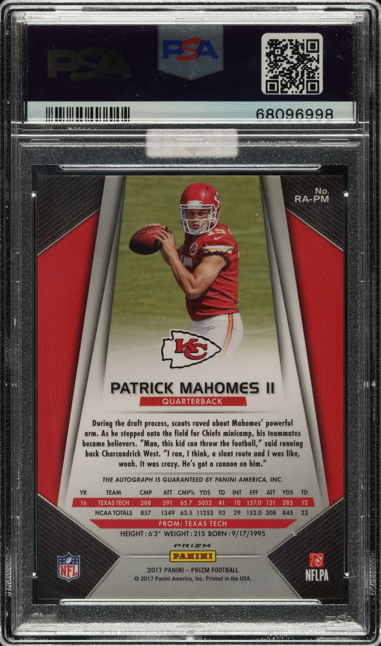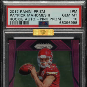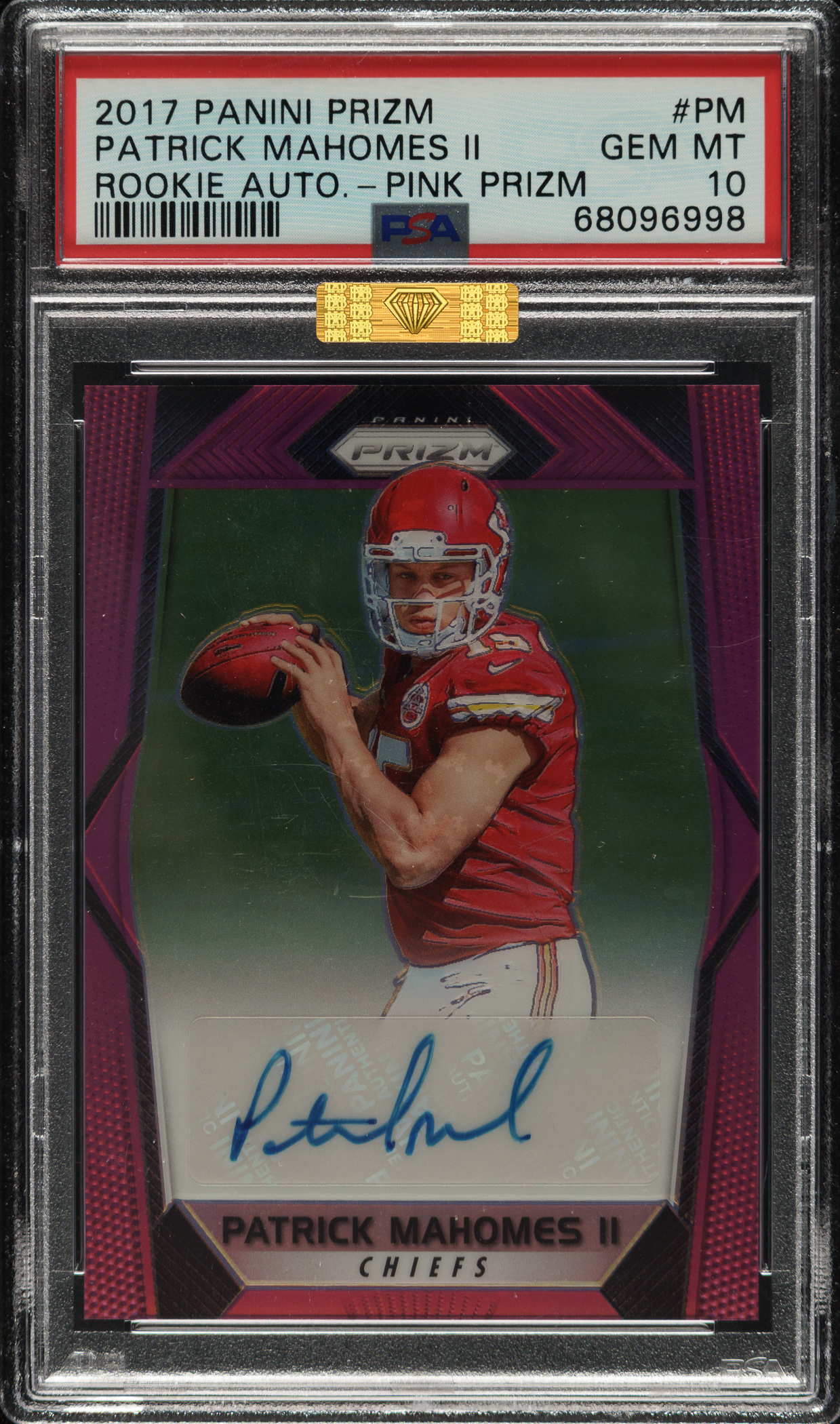 Graded GEM MINT 10 by PSA. Exceptional signed rookie card of Kansas City Chiefs superstar Patrick Mahomes from the 2017 Panini Prizm Rookie Autographs series. This Pink Prizim insert card boasts a clean surface, sharp corners, and excellent centering. The signature is penned boldly on the front in blue marker. An extremely desirable signed rookie card of future Hall of Famer Patrick Mahomes. Awarded an MBA Gold Diamond by Mike Baker Authenticated for high-end eye appeal. A corresponding MBA sticker is affixed to the front of the holder.