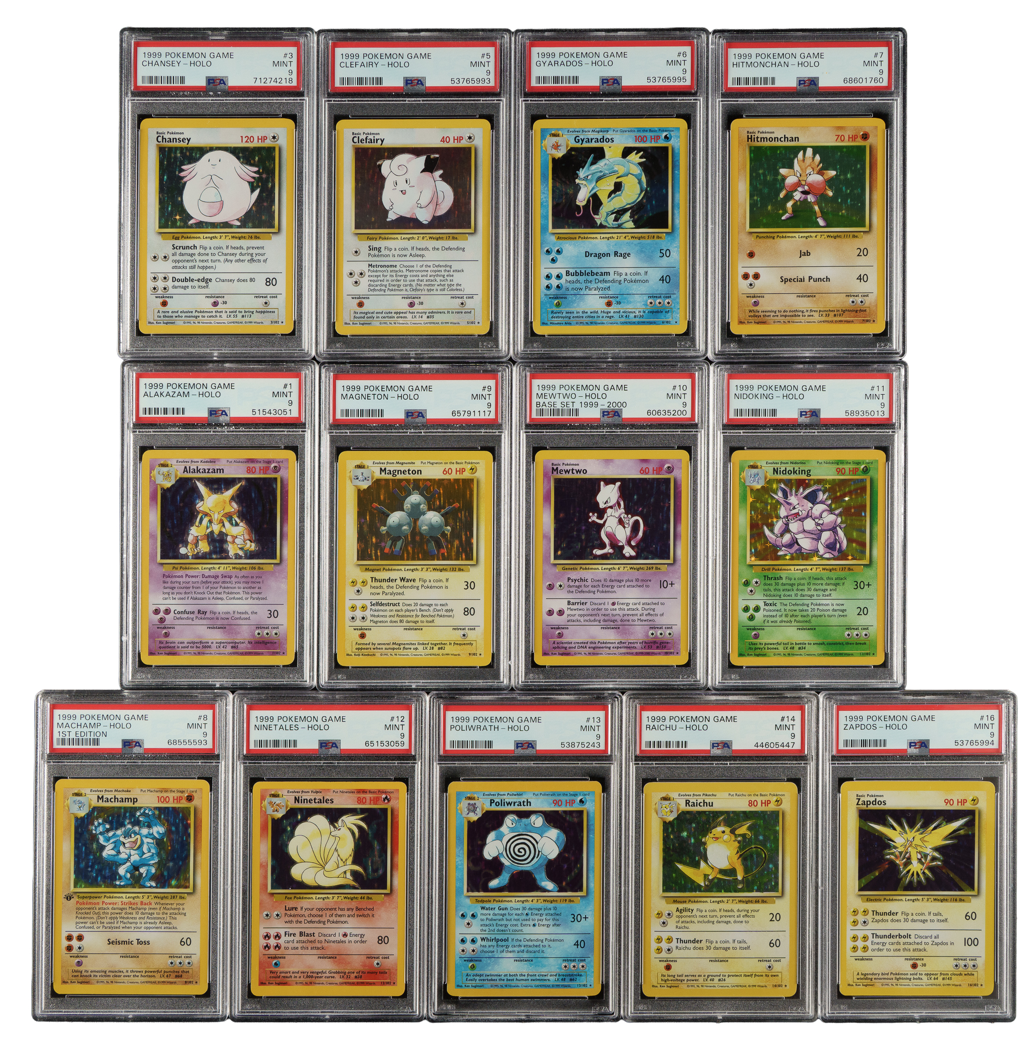 Collection of thirteen 1999 Pokemon Base Set Holographic cards, each professionally graded and encapsulated MINT 9 by PSA. This collection consists of the following: #1 Alakazam, #3 Chansey, #5 Clefairy, #6 Gyarados, #7 Hitmonchan, #8 Machamp 1st Edition, #9 Magneton, #10 Mewtwo, #11 Nidoking, #12 Ninetales, #13 Poliwrath, #14 Raichu, and #16 Zapdos. Total 13 cards. The size/weight of this item requires that there will be an additional shipping charge for this lot.
