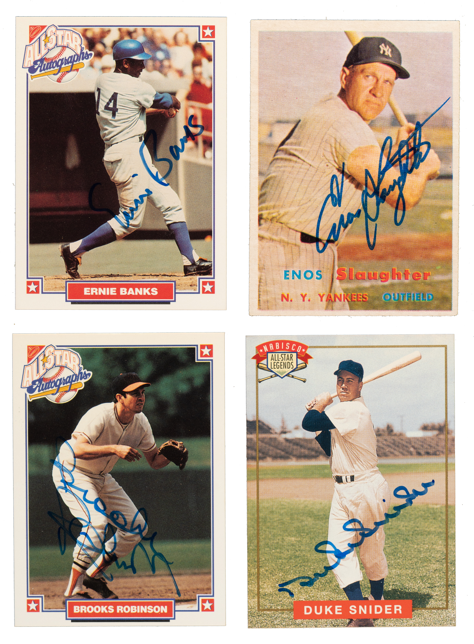 Sizeable collection of seventy-two signed baseball cards, including sixteen Hall of Famers, consisting of various issues (mostly Topps) spanning the years 1955 to 1994. The signatures are scripted on the front in various inks. This collection consists of the following: 1) 1955 Bowman (1 card): #129 Naragon (Gd+). 2) 1957 Topps (6 cards): #63, 75 Piersall, 92, 143 Pafko, 215 Slaughter (Ex), and 257. 3) 1958 Topps (6 cards): #9 Bauer (Vg-Ex+), 14 Repulski, 223 Pafko, 351 Braves' Fence Busters (Gd, signed by Mathews), 368 Colavito (Vg), and 419 Shantz. 4) 1960 Topps (3 cards): #153 Thomson (Ex-Mt), 369, and 544. 5) 1961 Topps (1 card): #539. 6) 1962 Topps (2 cards): #110 Skowron (Ex, green tint) and 467 Schilling AS. 7) 1964 Topps (4 cards): #170, 264, 267, and 399. 8) 1965 Topps (6 cards): #74 Petrocelli RC (Vg-Ex), 172 Piersall (personalized), 243 Helms RC (Vg), 295, 451, and 573 Lonborg RC (Ex-Mt). 9) 1966 Topps (3 cards): #23, 287, and 301. 10) 1967 Topps (2 cards): #75, and 495 (personalized). 11) 1968 Topps (4 cards): #43, 155 WS Gm. 5 (signed by Lonborg), 450 Kaat (Vg), and 593. 12) 1969 Topps (1 card): #640 Jenkins (Pr). 13) 1972 Topps (2 cards): #258 and 525 (personalized). 14) 1973 Topps (1 card): #21. 15) 1974 Topps (1 card): #640. 16) 1975 Topps (1 card): #244 Buckner. 17) 1976 Topps (1 card): #430. 18) 1977 Topps (1 card): #620 Sutton (Gd). 19) 1978 Topps (1 card): #310 Sutton (Vg). 20) 1979 Topps (1 card): #653. 21) 1981 Topps (5 cards): #91, 321 Durham ("Bull #10" inscription), 331, 395, and 718. 22) 1981 Fleer (1 card): #112 Sutton (Gd+). 23) 1982 Topps (2 cards): #23 and 111 Fisk IA (Ex). 24) 1983 Topps (1 card): #217. 25) 1985 Topps (2 cards): #432 and 616. 26) 1986 Donruss (1 card): #44. 27) 1986 Topps Traded (1 card): #54T. 28) 1987 Topps (1 card): #289. 29) 1989 Fleer (1 card): #7 Eckersley (Vg-Ex). 30) 1990 Fleer (1 card): #645 Derrick May RC. 31) 1991 Donruss (1 card): #36. 32) 1993 Nabisco All-Star Autographs (3): Banks (Nr/Mt-Mt), B. Robinson (Nr/Mt), and Stargell (Vg-Ex). 33) 1994 Nabisco All-Star Legends Autographs Complete Set (4): Gibson (Ex+), Palmer (Nr/Mt-Mt), F. Robinson (Ex-Mt), and Snider (Mint). Includes all four COAs. Condition of the forty-eight cards not graded individually above: 18% Nr/Mt to Nr/Mt-Mt, 40% Ex to Ex-Mt, and 42% Vg to Vg-Ex (including three lesser). Total: 72 signed cards. Auction LOA from James Spence/JSA.