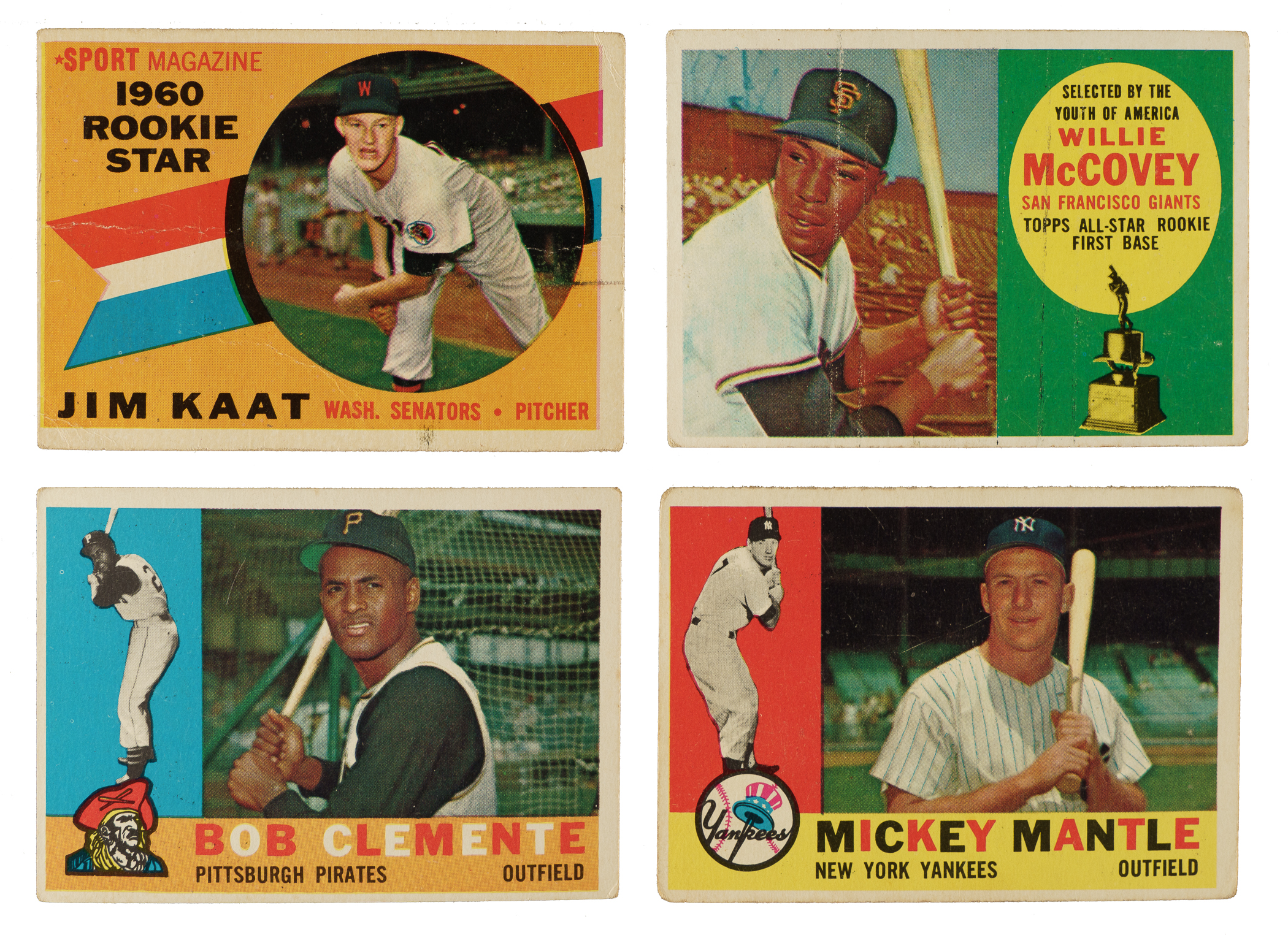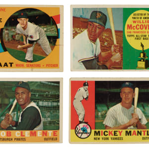 Presented is a substantial collection of 579 assorted 1960 Topps cards (including 440 different). The collection is highlighted by 49 Hall of Famers, including Mickey Mantle, Hank Aaron, Roberto Clemente, and Willie McCovey (rookie). Condition is 11% Vg-Ex (including a few Ex), 78% Gd to Vg, and 11% lesser. Includes the following three high numbers (#507-572): #518, 527, and 539. Keys: Three #1 Wynn (Fr, Pr-Fr, and Pr), two 7 Mays/Rigney (both Gd), 10 Banks (Vg+), 28 B. Robinson (Gd), 35 Ford (Vg), 50 Kaline (Vg), two 55 Mazeroski, 73 Gibson (Vg+), 100 Fox, 115 Face/Wilhelm, 136 Kaat RC (Pr), 160 Mantle/Boyer (Vg), 173 Martin, 210 Killebrew (Vg), 212 Alston, four 227 Stengel, 230 Mound Magicians w/ Spahn, 240 Aparicio, 250 Musial (Vg+), two 295 Hodges, 300 Aaron (Gd+), 305 Ashburn (Vg-Ex), 316 McCovey RC (Vg), two 326 Clemente (Vg and Pr), 332 Yankees Team (Vg), 335 Schoendienst, 343 Koufax (Vg-Ex+), 350 Mantle (Gd+), 352 Cincy Clouters, three 365 Minoso, 377 Maris (Gd+), 395 Wilhelm, 420 Mathews (Gd), 429 Fox/Kuenn, 445 Spahn (Gd), 475 Drysdale (Gd), 490 F. Robinson (Vg), 493 Snider (Pr), and 502 Bunning. This assemblage provides an impressive collection of mostly mid-grade cards from this popular 1960s Topps issue. Total: 579 cards.