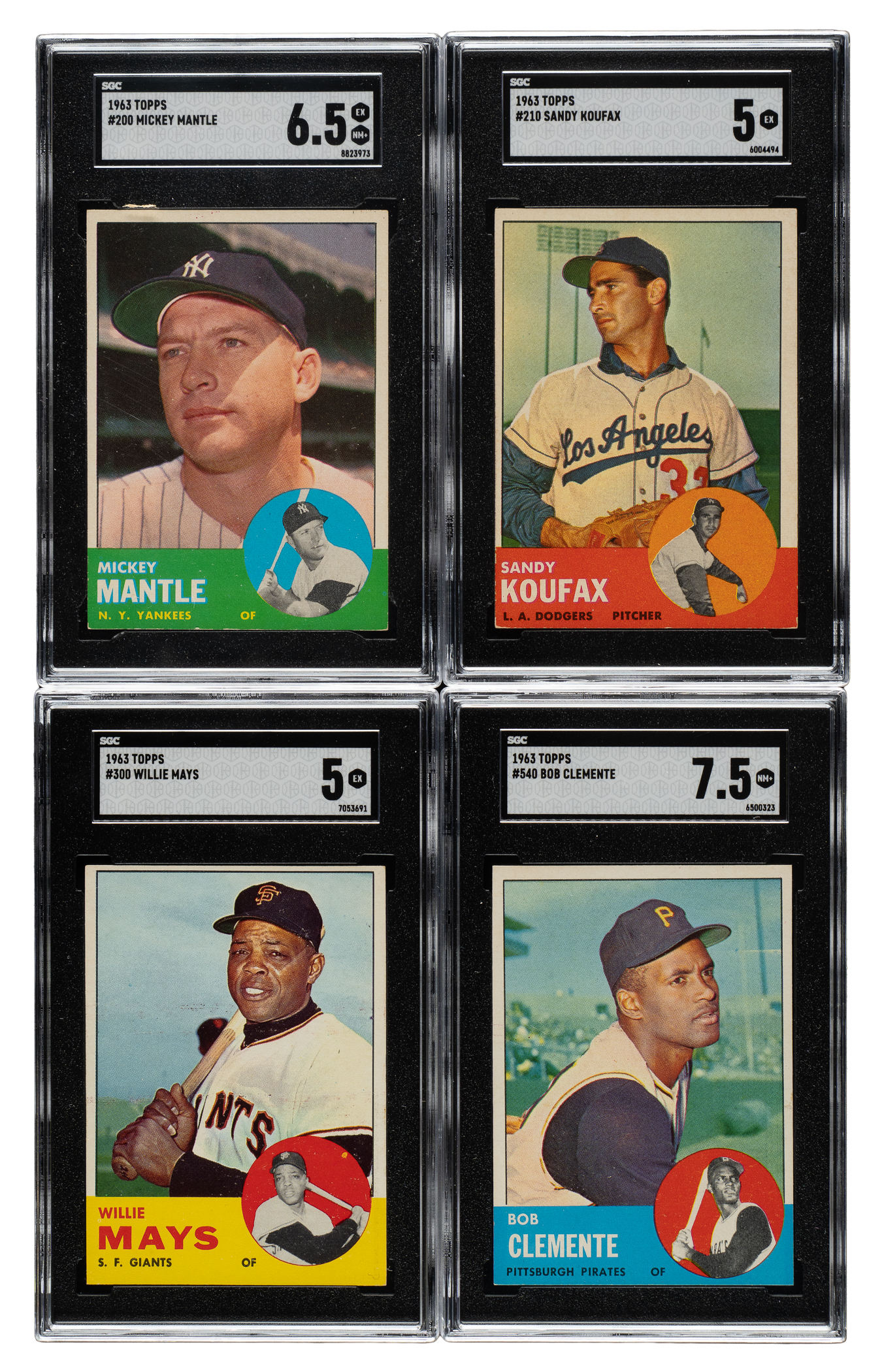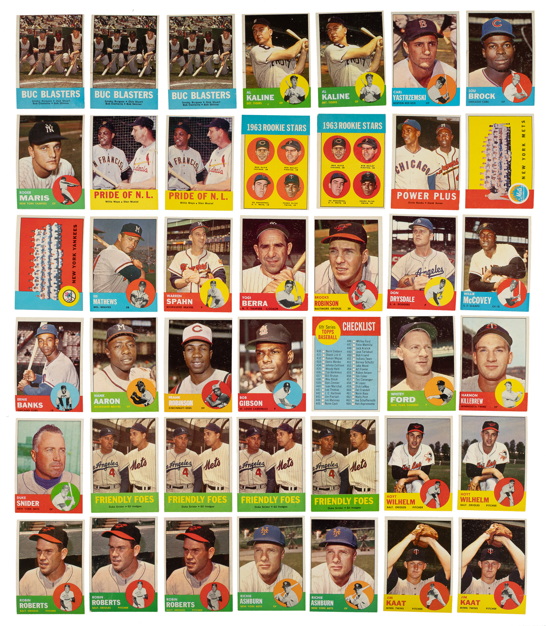 Presented is a very attractive collection of 957 cards from the 1963 Topps set, consisting of a near-complete set of 507 different cards (out of 576 in the set) plus 450 duplicates. The collection is highlighted by more than 50 Hall of Famers, including Mickey Mantle, Willie Mays, Roberto Clemente, and Sandy Koufax. Condition is 24% Ex-Mt to Nr/Mt (approximately two-thirds Ex-Mt), 64% Vg-Ex to Ex, and 12% Gd to Vg. We have selected four cards for grading and encapsulation by SGC. Keys: Three #18 Buc Blasters (Ex-Mt, Ex and Vg due to centering), two 25 Kaline (both Vg-Ex+), four 54b DeBusschere RC/"1963", four 68 Snider/Hodges, two 108 Wilhelm, 115 Yastrzemski (Vg-Ex), 120 Maris (Ex), three 125 Roberts, two 135 Ashburn, two 138 Mays/Musial (both Ex), five 165 Alston, three 165 Kaat, two 190 Minoso, 200 Mantle (EX/NM+ 6.5), four 205 Aparicio, 210 Koufax (EX 5), two 228 Oliva RC (Ex and Pr), 242 Banks/Aaron (Ex), 247 Yankees Team (Ex), 275 Mathews (Ex), 300 Mays (EX 5), 320 Spahn (Ex), 340 Berra (Ex), 345 B. Robinson (5/95 L/R, otherwise Ex-Mt), 360 Drysdale (Ex-Mt), 380 Banks (98/2 T/B, otherwise Nr/Mt), 390 Aaron (Vg), 400 F. Robinson (100/0 L/R, otherwise Nr/Mt), three 412 Podres/Drysdale/Koufax, 415 Gibson (Ex), 431b Checklist/"Checklist" in white (Ex-Mt), 440 Marichal, 446 Ford (2/98 T/B, otherwise Ex-Mt), 472 Brock (Ex), 473 Mets Team (Ex), 490 McCovey (Ex-Mt), 500 Killebrew SP (Ex-Mt), 520 Cepeda, 540 Clemente (NM+ 7.5), and 550 Snider (Ex-Mt). Missing the following 69 cards for completion: #47, 173 Bombers' Best with Mantle, 227, 232, 250 Musial, 252, 257, 277, 279, 283, 288, 293, 295, 299, 309, 310, 323, 324, 327, 343, 361, 365, 370, 380, 393, 411, 421, 423, 447, 448, 449, 450, 454, 456, 457, 461, 463, 466 Freehan, 467, 469, 474, 482, 485, 486, 487, 489, 491, 494, 497, 498, 499, 503, 504, 505, 507, 533, 536, 537 Rose, 539, 545, 546, 549, 552, 553 Stargell, 555, 556, 557, 569, and 570. This is an outstanding, mostly mid- to high-grade collection of cards from this popular 1960s Topps issue! Total: 957 cards (near-set of 507 plus 450 duplicates).