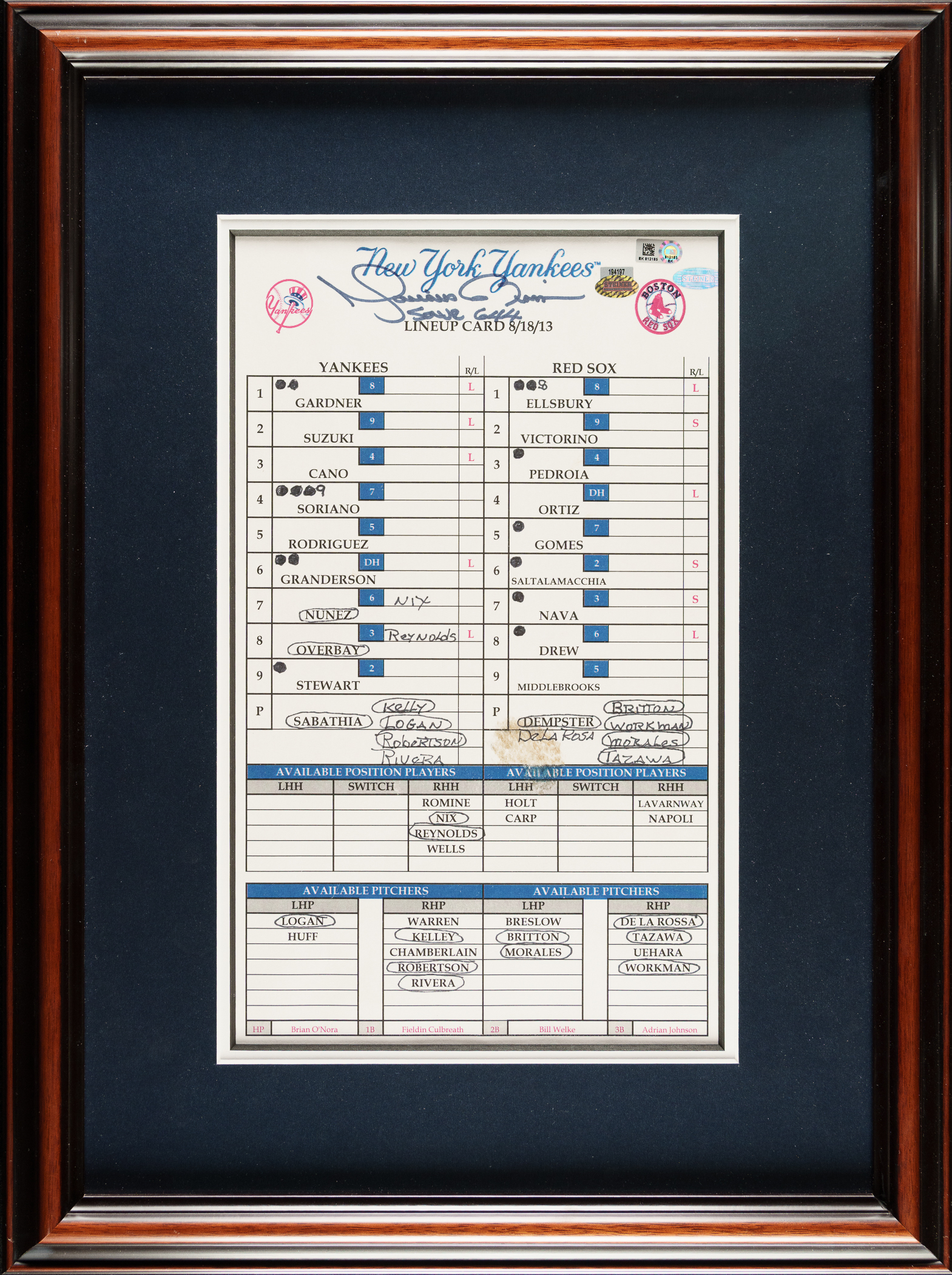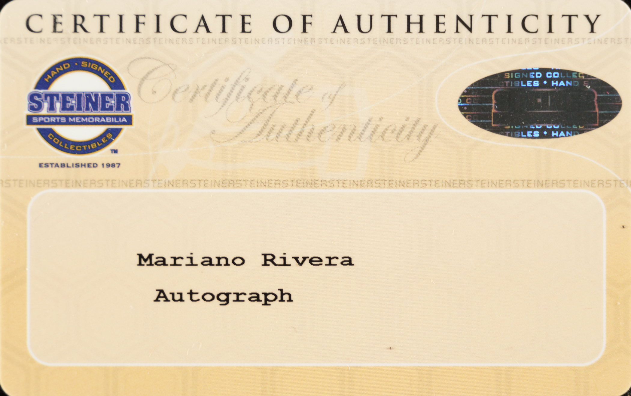 New York Yankees Hall of Famer Mariano Rivera. Total dimensions: 16-1/4 x 21-3/4 Inches. MLB certification sticker is affixed to the card. COA from Steiner. The size/weight of this item requires that there will be an additional shipping charge for this lot.