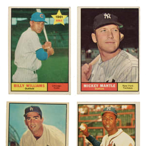 Presented is a partial set of 1961 Topps baseball consisting of 393 different cards (out of 587), plus an additional 361 duplicates. The collection is highlighted by 69 Hall of Famers such as Mickey Mantle, Hank Aaron, Sandy Koufax, Roberto Clemente, and Carl Yastrzemski, plus rookie examples of Billy Williams and Juan Marichal (two). Condition is 8% Ex, 77% Vg to Vg-Ex, and 15% lesser. Keys: Two #10 B. Robinson (5/95 L/R, otherwise Vg-Ex and Fr), four 25 Pinson/Bell/F. Robinson, four 41 NL Batting Ldrs, three 43 NL HR Ldrs, three 44 AL HR Ldrs (Vg-Ex, Vg+, and Vg), two 63 Kaat, two 80 Killebrew (Vg-Ex and Vg+), 120 Mathews (Ex), 141 B. Williams RC (Vg), two 160 Ford (both Vg-Ex), two 200 Spahn (Vg-Ex+ and Vg), two 211 Gibson (Vg+ and Gd+), 228 Yankees Team (Vg), 260 Drysdale (Vg-Ex+), two 287 Yastrzemski (Vg-Ex and Pr), three 290 Musial (two Ex and Vg-Ex), 300 Mantle (Vg+), six 307 Mantle WS Gm. 2 (three Ex and three Vg-Ex), five 311 Ford WS Gm. 6, four 337 Wynn/Lopez/Score, 344 Koufax (Vg-Ex), 360 F. Robinson (Vg-Ex), 388 Clemente (95/5 L/R, otherwise Ex), 401 Ruth Hits 60th (Fr), 406 Mantle Blasts HR (Ex), 409 Johnson Hurls Shoutout (Gd), 415 Aaron (15/85 L/R, otherwise Vg-Ex+), two 417 Marichal RC (Ex and Vg-Ex), 425 Berra (Vg+), 429 Kaline (Vg), 440 Aparicio (Vg), two 443 Snider (10/90 L/R, otherwise Vg-Ex+ and Vg), 472 Berra MVP (Vg-Ex+), and 478 Maris MVP (Ex). Missing the following 194 cards for completion: #1, 2 Maris, 3, 29, 35 Santo, 48, 65, 68, 73, 81, 99, 100, 104, 105, 126, 128, 129, 133, 135, 137, 150 Mays, 161, 164, 165, 183, 193, 196, 204, 210, 217, 219, 236, 245, 249, 253, 257, 266, 268, 278, 283, 333, 334, 349, 350 Banks, 353, 370, 371, 372, 375, 379, 383, 387, 389, 390, 405 Gehrig Benched, 408, 416, 419, 422, 423, 424, 434, 437, 445, 446, 448, 449, 450, 451, 452, 453, 454, 457, 460, 461, 462, 463a, 463b, 464, 465, 466, 467, 468, 469, 473, 474, 475 Mantle MVP, 476, 477, 479, 480, 481, 482 Mays MVP, 483, 484 Aaron MVP, 485, 486, 487, 488, 489, 490, 491, 492, 493, 494, 495, 496, 497, 499, 500, 501, 503, 504, 507-586 (including 517 McCovey, 576 Maris AS, 577 Aaron AS, 578 Mantle AS, and 579 Mays AS), and 589. This is an impressive collection, featuring a partial set that would provide an outstanding foundation for the assembly of a very attractive mid-grade complete set of this very popular 1960s collection. Total: 754 cards (partial set of 393 plus 361 duplicates).
