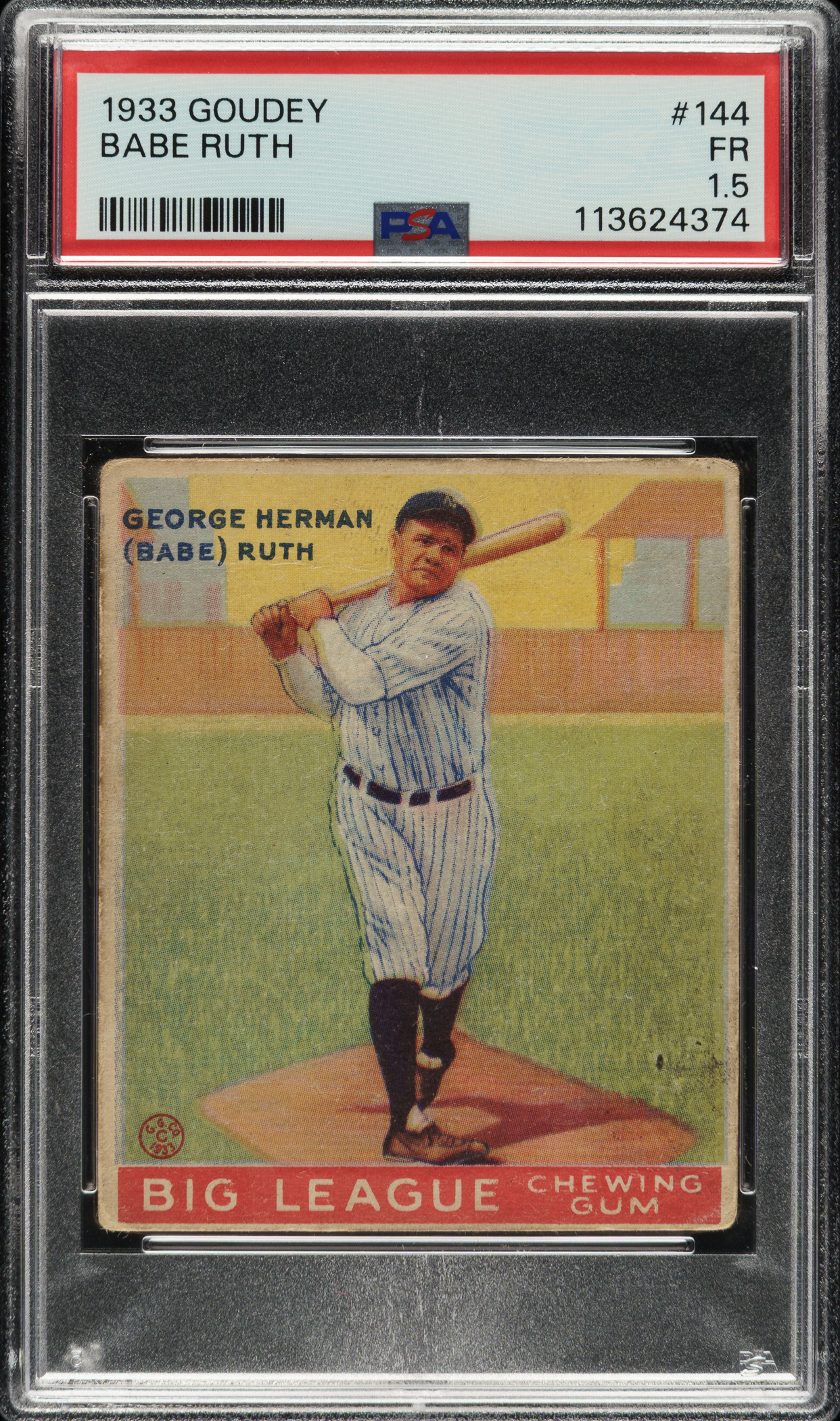 Modestly graded example featuring New York Yankees Hall of Famer Babe Ruth in his classic follow-through batting pose. Goudey must have realized what an iconic pose this was because, of all the cards in the set, this is the one it chose to double print when replacing missing card #106 during production. This continues to be one of Ruth's most popular and recognizable baseball cards. Because of being double-printed (there were exactly twice as many Ruth #144s printed as any other card in the same series), this card also represents the best value among the four Ruth cards in the 1933 Goudey set. The offered card has bright colors and a bold image of Ruth. Graded FAIR 1.5 by PSA due to heavy creasing and corner wear. An excellent opportunity to acquire one of Babe Ruth's classic cards from the popular 1933 Goudey Gum series and one of card-collecting's most iconic cards.
