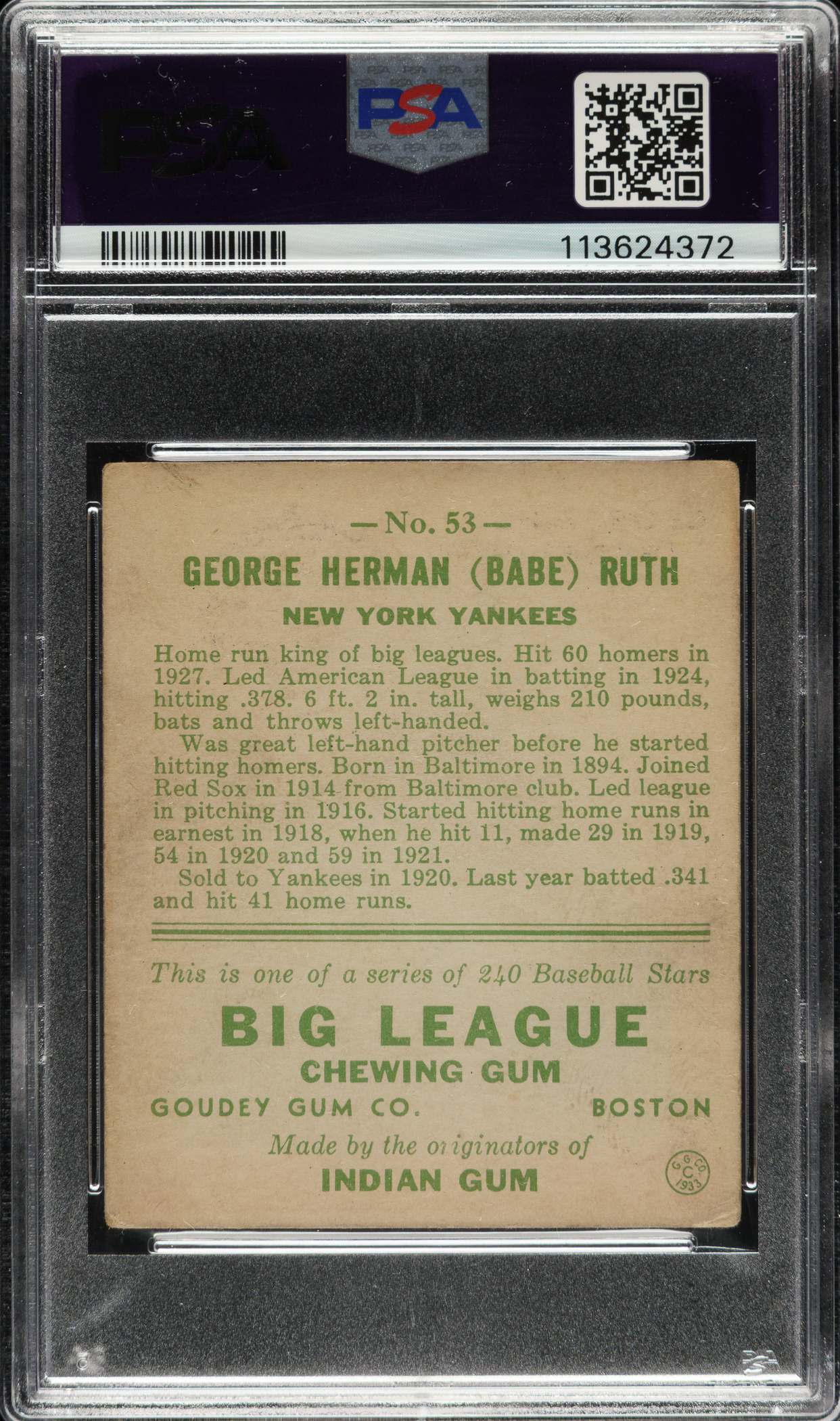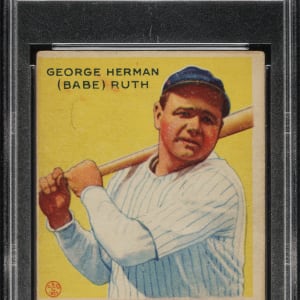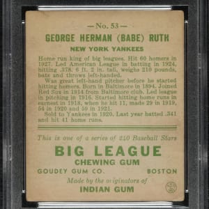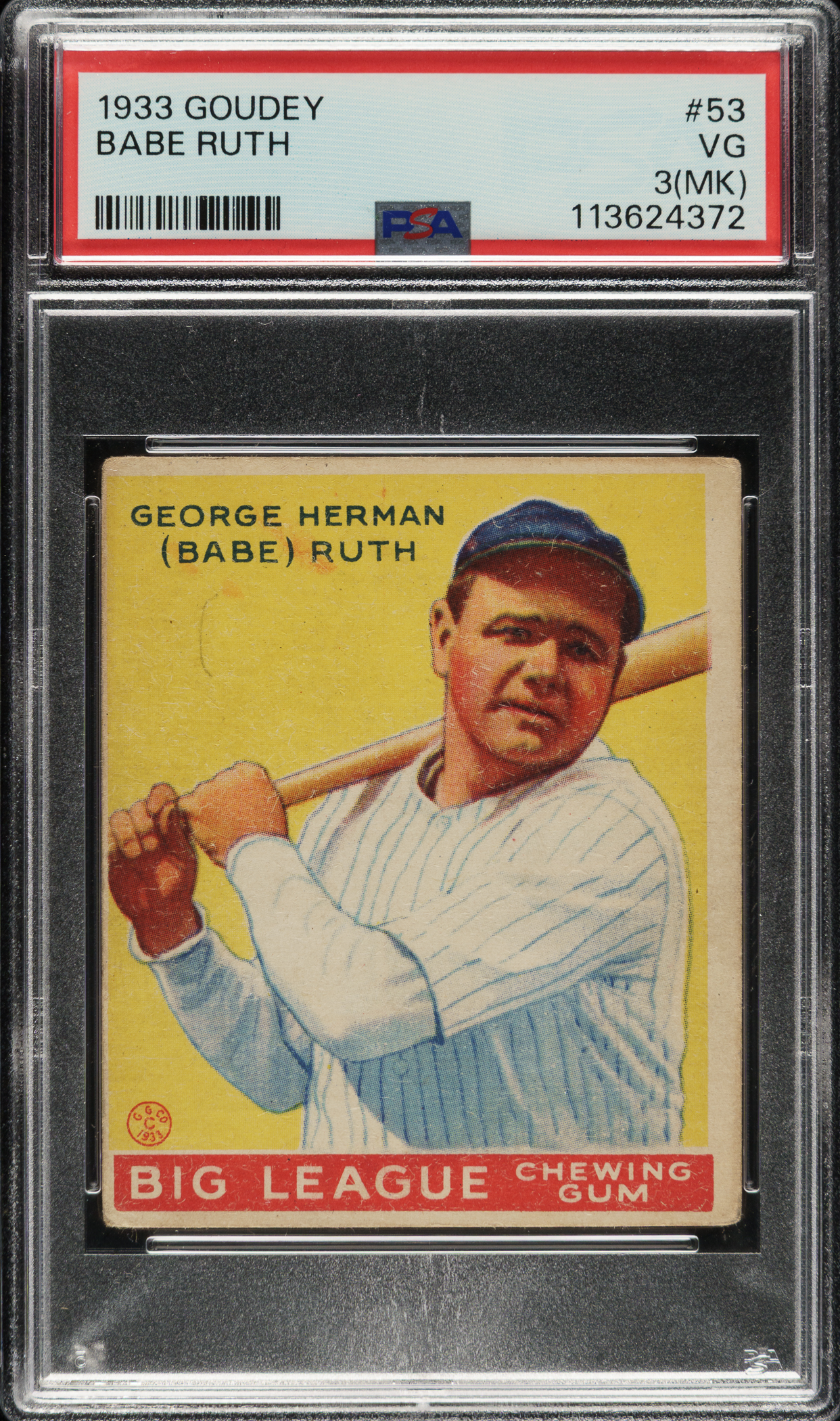 Graded VG 3 (MK) by PSA. Mid-grade example of one of Babe Ruth’s classic cards: #53, yellow background, from the 1933 Goudey series. The "yellow background" pose of Babe Ruth is, without a doubt, his most difficult to obtain and his most sought-after card in the 1933 Goudey set. This example has brilliant colors, a crisp image, and honest corner wear. Clean reverse with bold green text. There is a small ink mark on front, hence the (MK) qualifier. This is a very desirable mid-grade example of one of Babe Ruth's classic cards from the popular 1933 Goudey Gum series.
