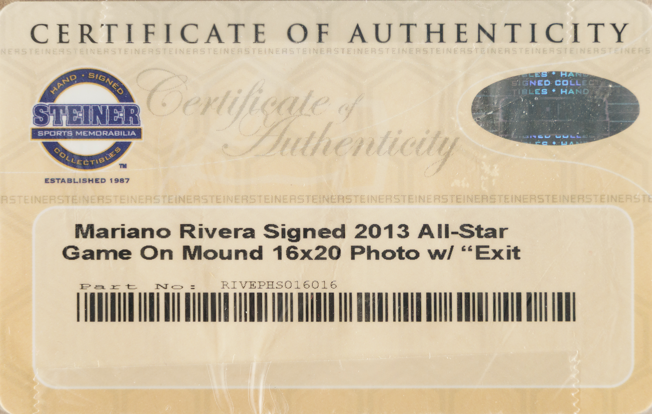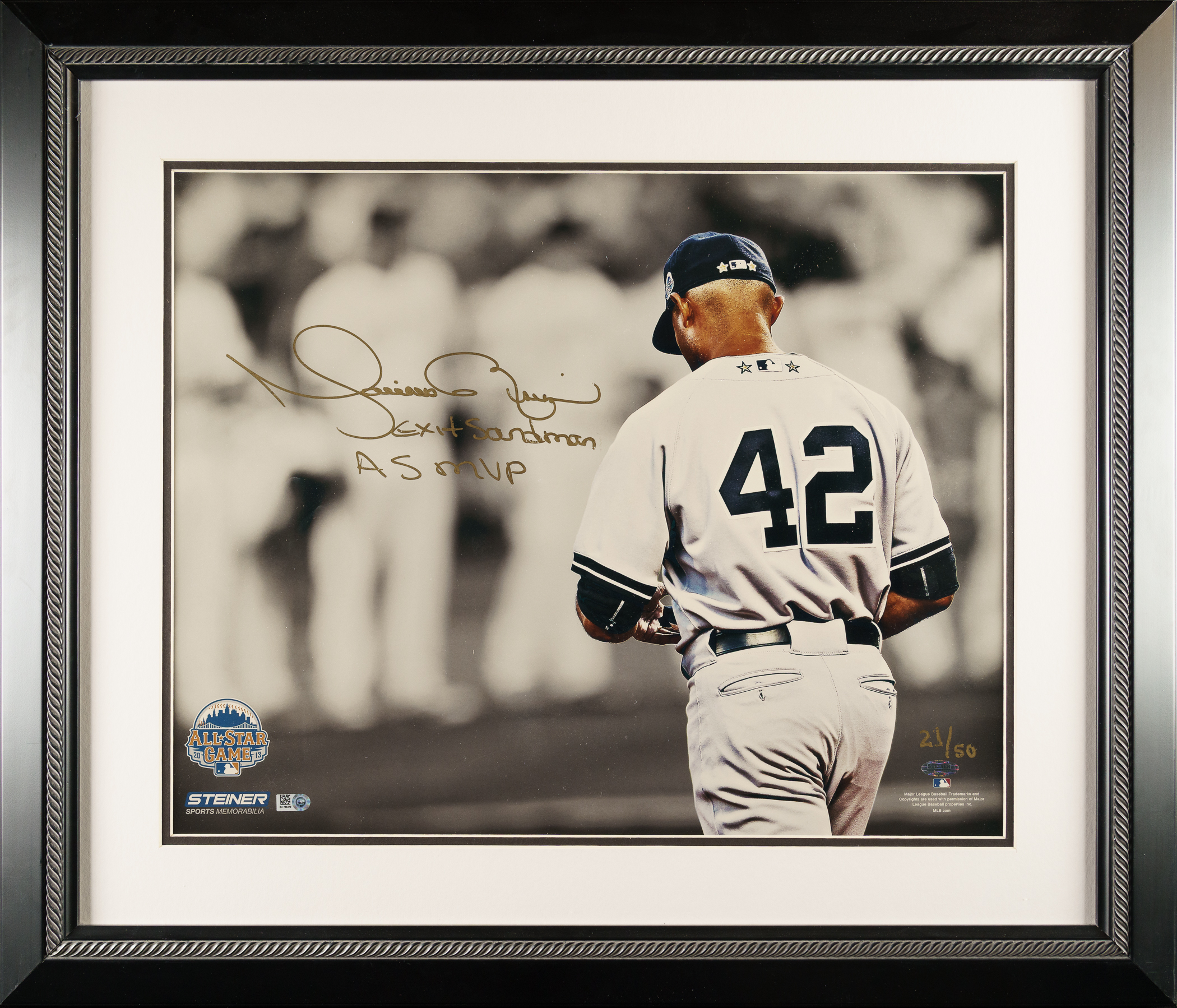 New York Yankees Hall of Famer Mariano Rivera signed photograph in framed display. Total dimensions: 23-3/4 x 27-5/8 Inches. This limited edition photograph is numbered 21 out of 50. MLB certification sticker is affixed to the photograph. COA from Steiner. The size/weight of this item requires that there will be an additional shipping charge for this lot.