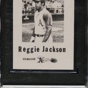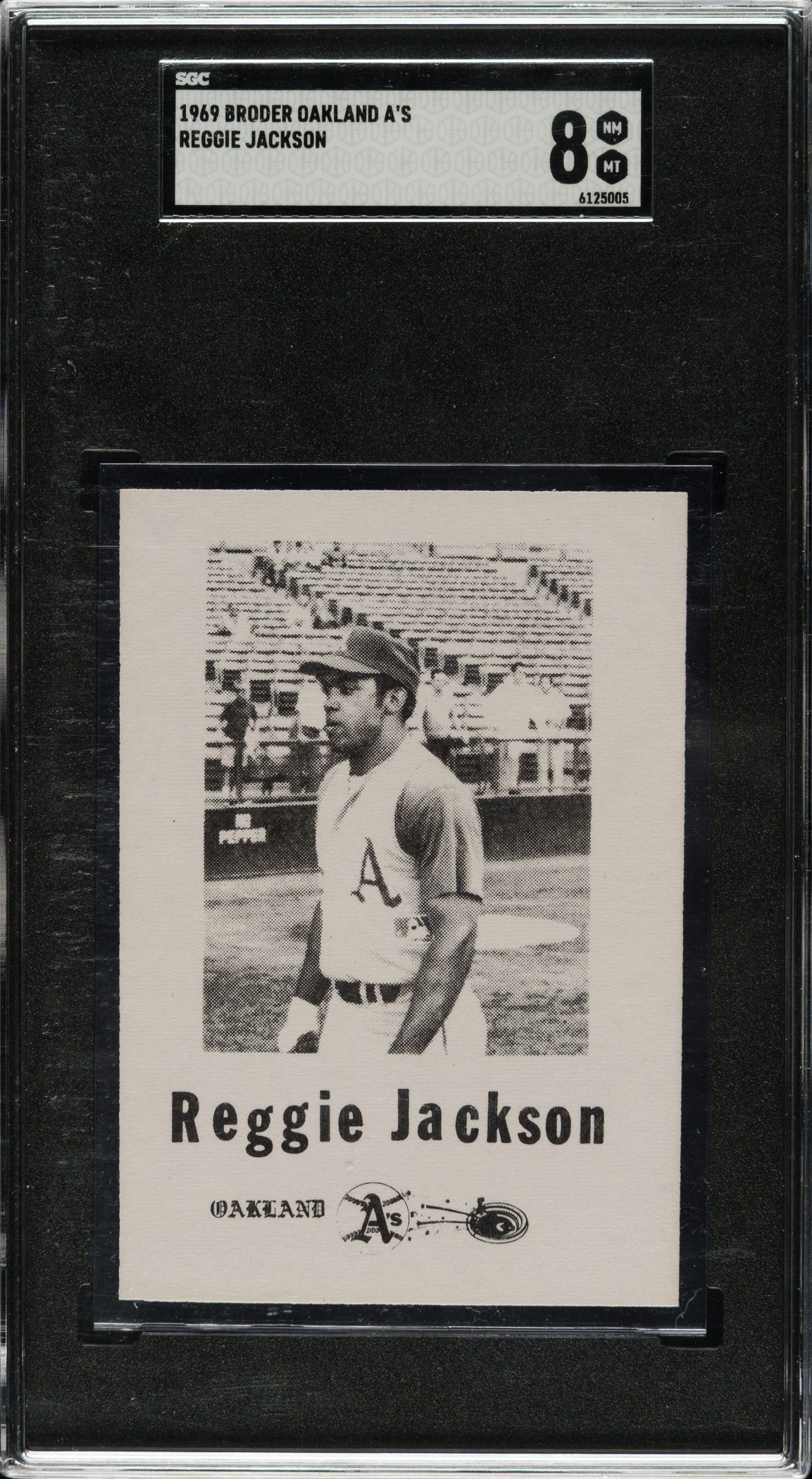Graded NM/MT 8 by SGC. This is the ONLY example graded at this level by SGC with none higher! Outstanding example of Reggie Jackson's rookie card from the scarce 1969 Oakland A's Broder issue. Measuring 2-3/4 x 4 inches, these cards were produced by West Coast collector/dealer Ed Broder. The offered card features superb image quality, bright white borders, and strong corners. A superb example from this rarely seen series.