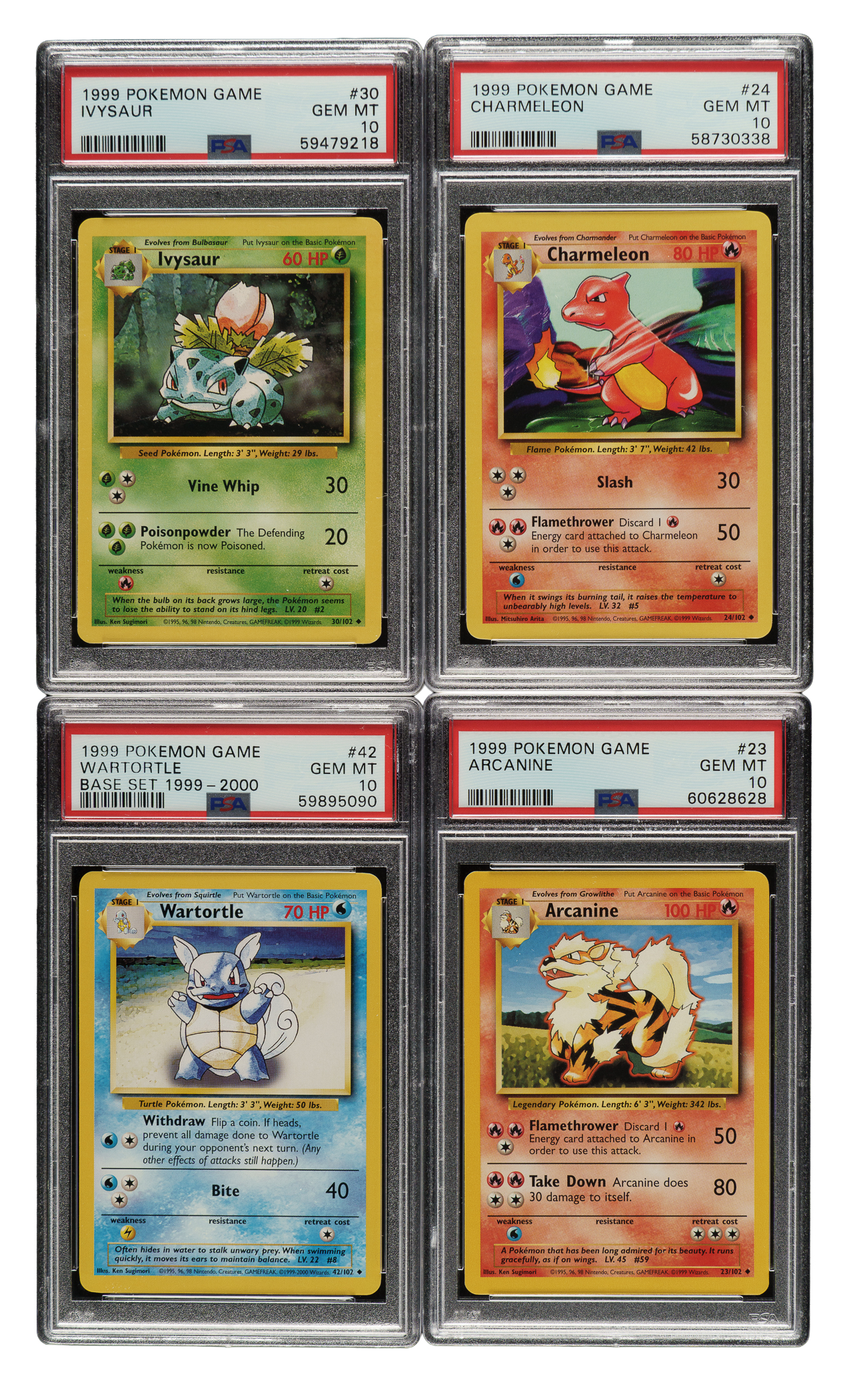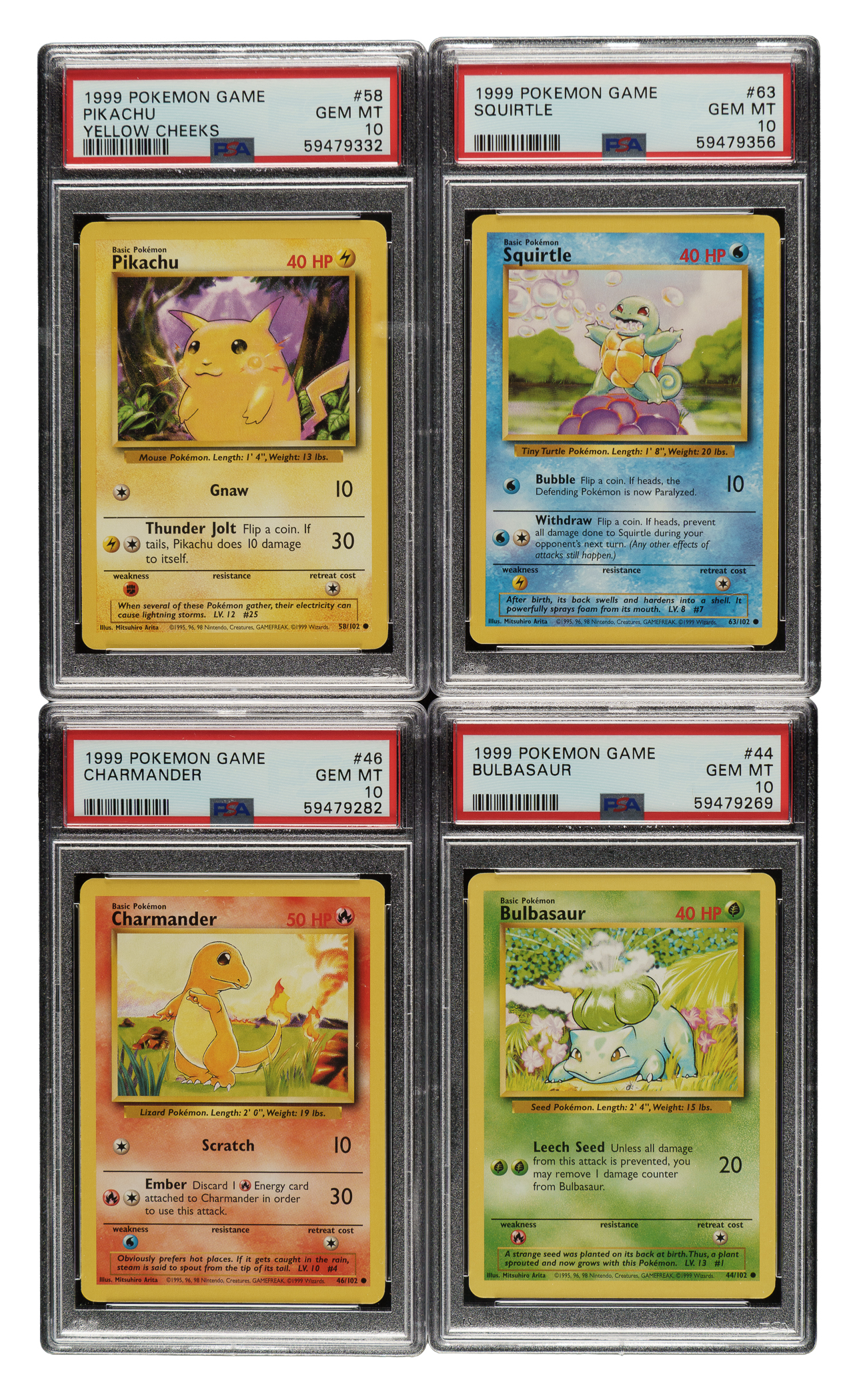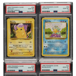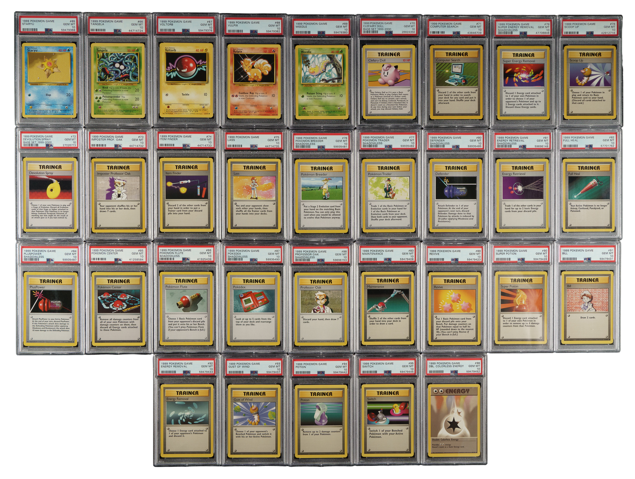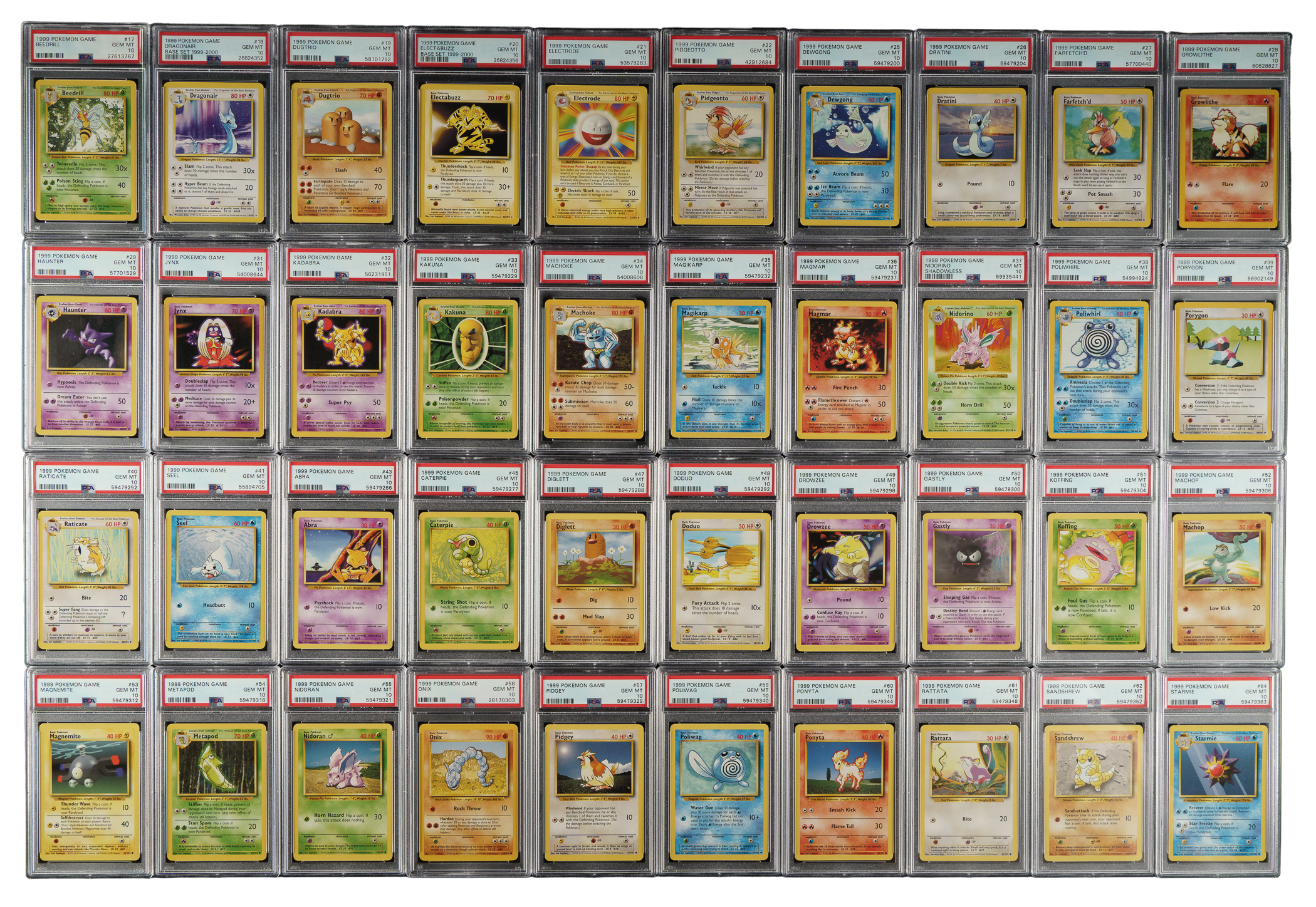 Presented is an incredible near-complete set (86 of 102 cards) of 1999 Pokemon Base, entirely graded and encapsulated GEM MINT 10 by PSA. Only cards #1-16 (holographic Pokemon) are missing for completion. The Base set is arguably the most significant Pokemon set as it represents the first of three series released by Wizards of the Coast in 1999, preceding the release of the Base and Jungle sets, which combine to feature the original 151 Pokemon. The Pokemon characters featured in this set are essentially the equivalent to rookie cards in sports sets. In addition to forming the foundation for the original 151-card "Pokedex" series, the Base set is renowned by collectors for its outstanding artwork. Like the other Pokemon issues, cards in this set feature rounded corners, yellow borders, and a blue reverse that prominently displays the iconic Pokemon logo. The Base set can be identified by the absence of a set symbol, which would be located just under the bottom-right corner of the picture. The offered set is primarily composed of cards from the Unlimited Base set, meaning that they are not 1st Edition cards. However, this set does feature 11 Shadowless cards, which are noted below. The remaining 75 cards are all Unlimited. This collection consists of the following: #17, 18, 19, 20, 21, 22, 23, 24, 25, 26, 27, 28, 29, 30, 31, 32, 33, 34, 35, 36, 37 Shadowless, 38, 39, 40, 41, 42, 43, 44, 45, 46, 47, 48, 49, 50, 51, 52, 53, 54, 55, 56, 57, 58, 59, 60, 61, 62, 63, 64, 65, 66, 67, 68, 69, 70, 71, 72, 73, 74, 75, 76 Shadowless, 77 Shadowless, 78, 79 Shadowless, 80 Shadowless, 81 Shadowless, 82, 83, 84 Shadowless, 85, 86 Shadowless, 87 Shadowless, 88 Shadowless, 89, 90, 91, 92, 93, 94, 95, 96, 97, 98 Shadowless, 99, 100, 101, and 102. Total 86 cards. The size/weight of this item requires that there will be an additional shipping charge for this lot.
