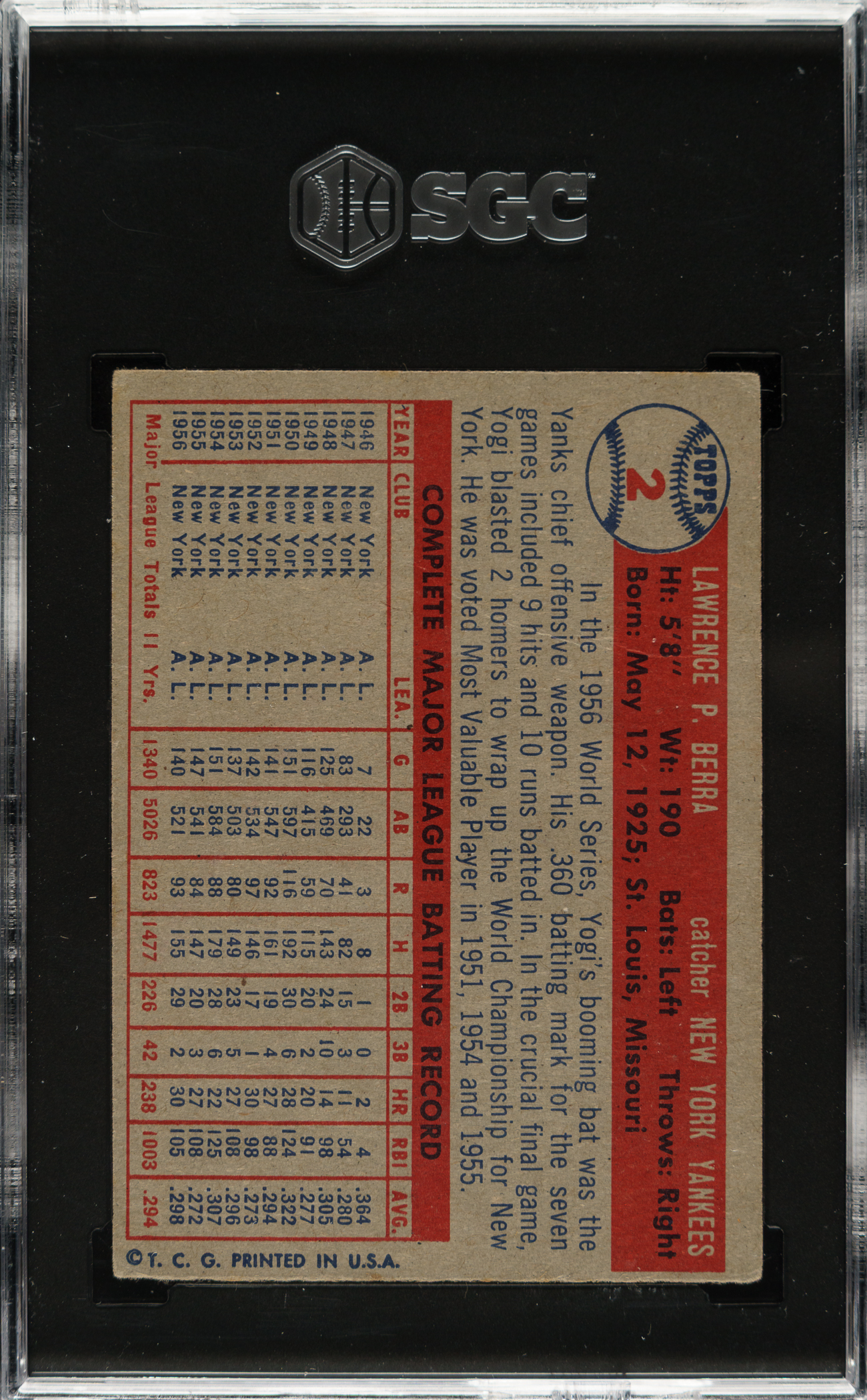 Lot # 1695: 1957 Topps #2 Yogi Berra SGC VG 3