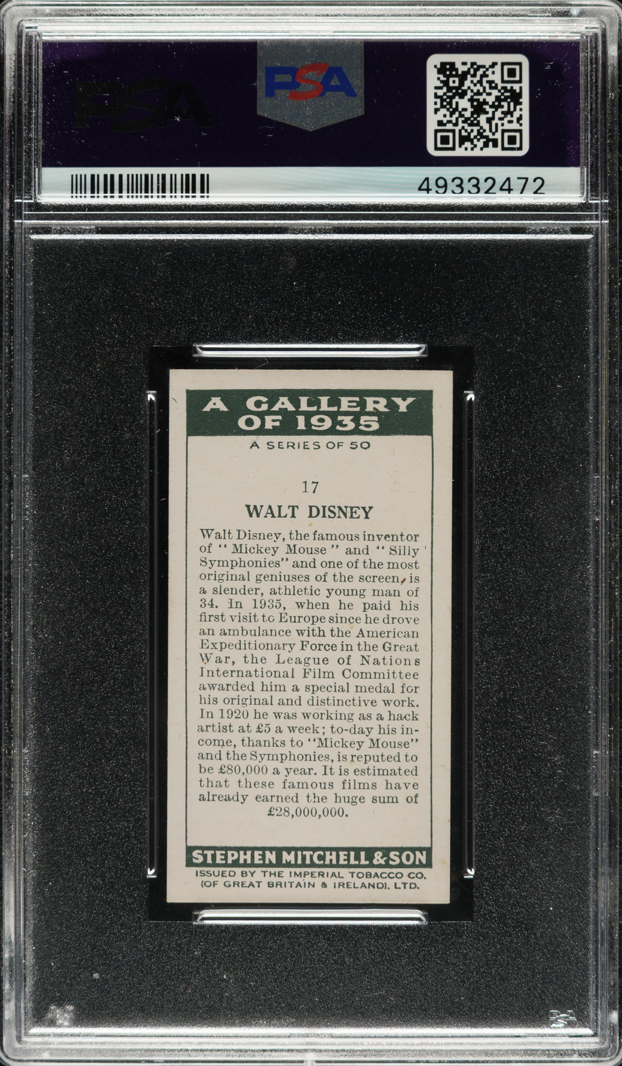 Lot # 3343: 1936 Mitchell & Son "A Gallery of 1935" #17 Walt Disney PSA NM-MT 8