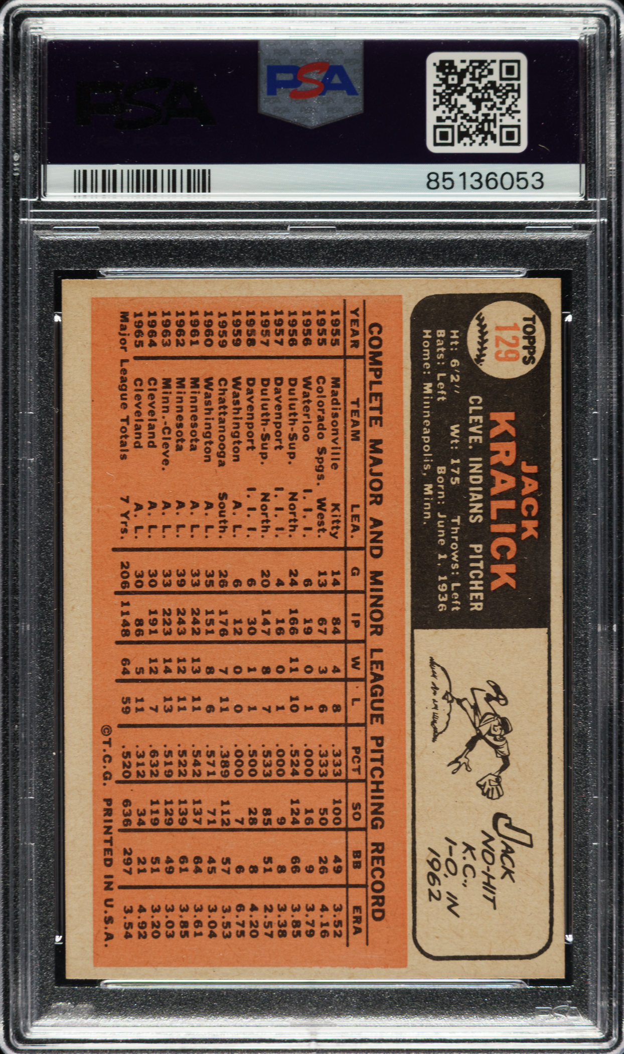 Graded GEM MINT 10 by PSA. Cleveland Indians Hall of Famer Jack Kralick.