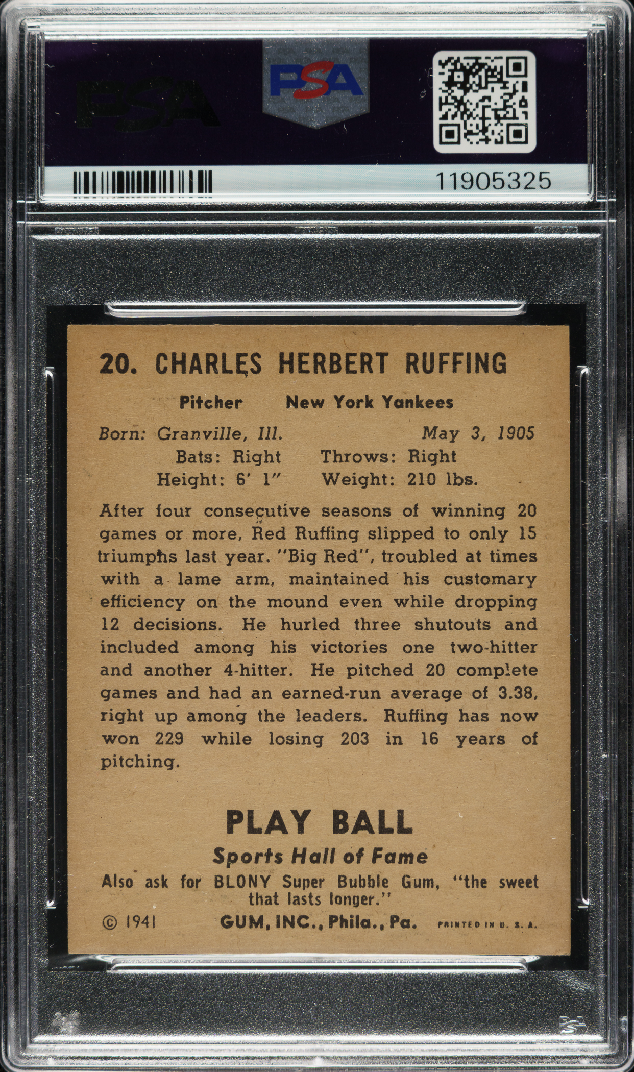 Graded NM 7 by PSA. New York Yankees Hall of Famer Red Ruffing.