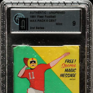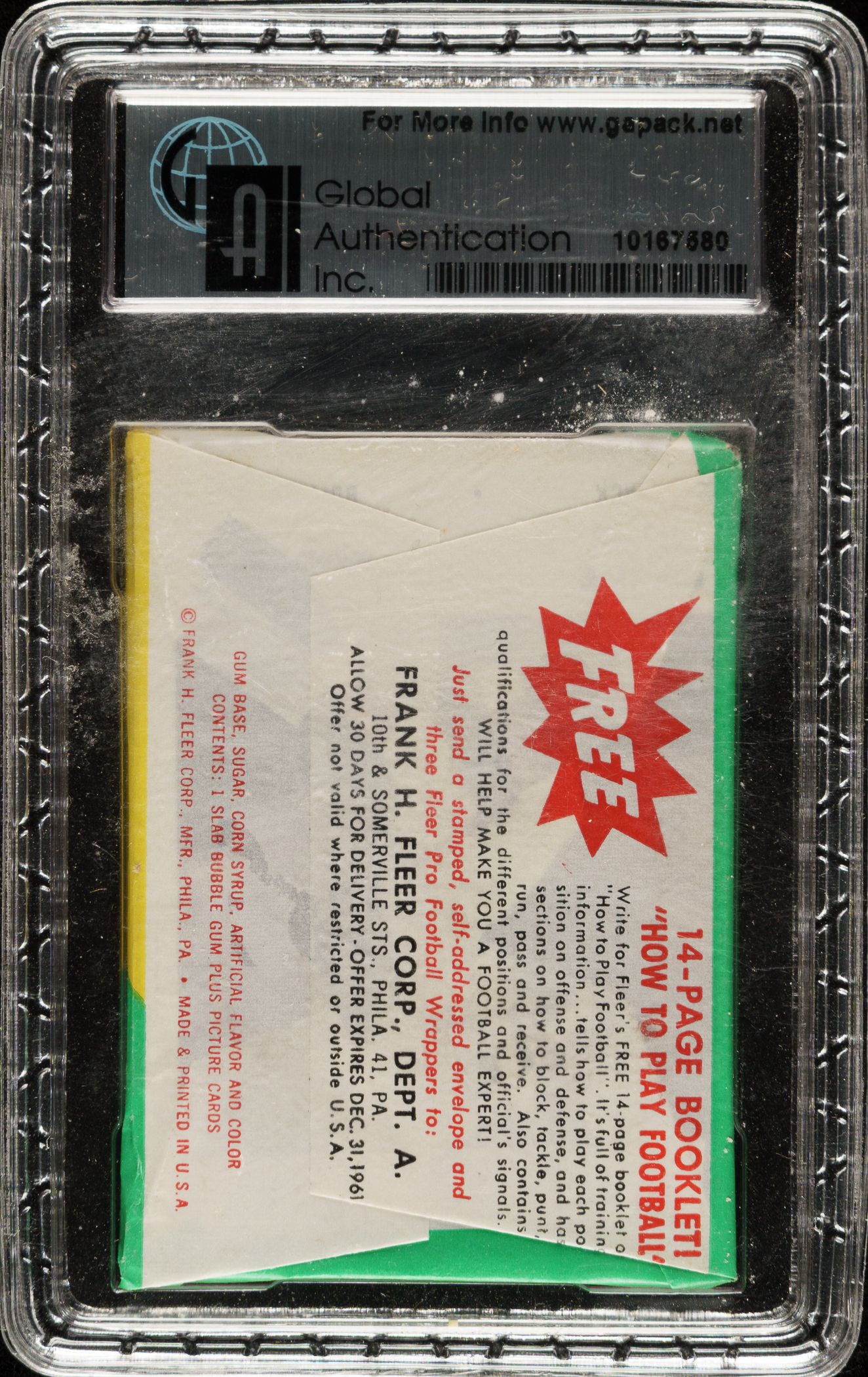 Original unopened wax pack of 1961 Fleer football cards graded MINT 9 by GAI. This is a second-series pack (#133-220), a series that includes Jack Kemp, George Blanda, Tom Flores rookie, Jim Otto rookie, and Don Maynard rookie as well as numerous other stars and Hall of Famers. Steve Hart of the Baseball Card Exchange (the leading authority on unopened material) has personally reviewed this pack, and in his opinion, it is original and unopened.