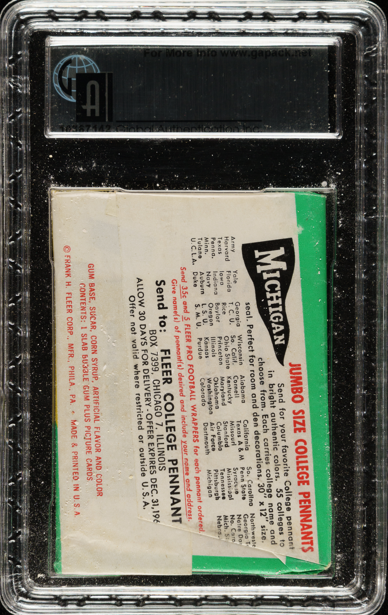 Original unopened wax pack of 1961 Fleer football cards graded NM 7 by GAI. This is a second-series pack (#133-220), a series that includes Jack Kemp, George Blanda, Tom Flores rookie, Jim Otto rookie, and Don Maynard rookie as well as numerous other stars and Hall of Famers. Steve Hart of the Baseball Card Exchange (the leading authority on unopened material) has personally reviewed this pack, and in his opinion, it is original and unopened.