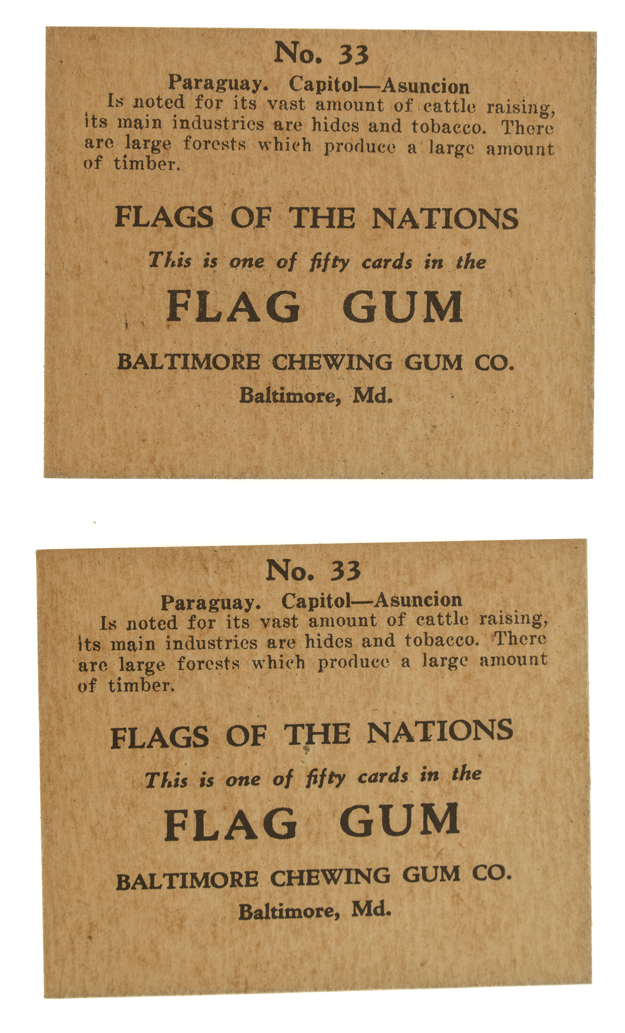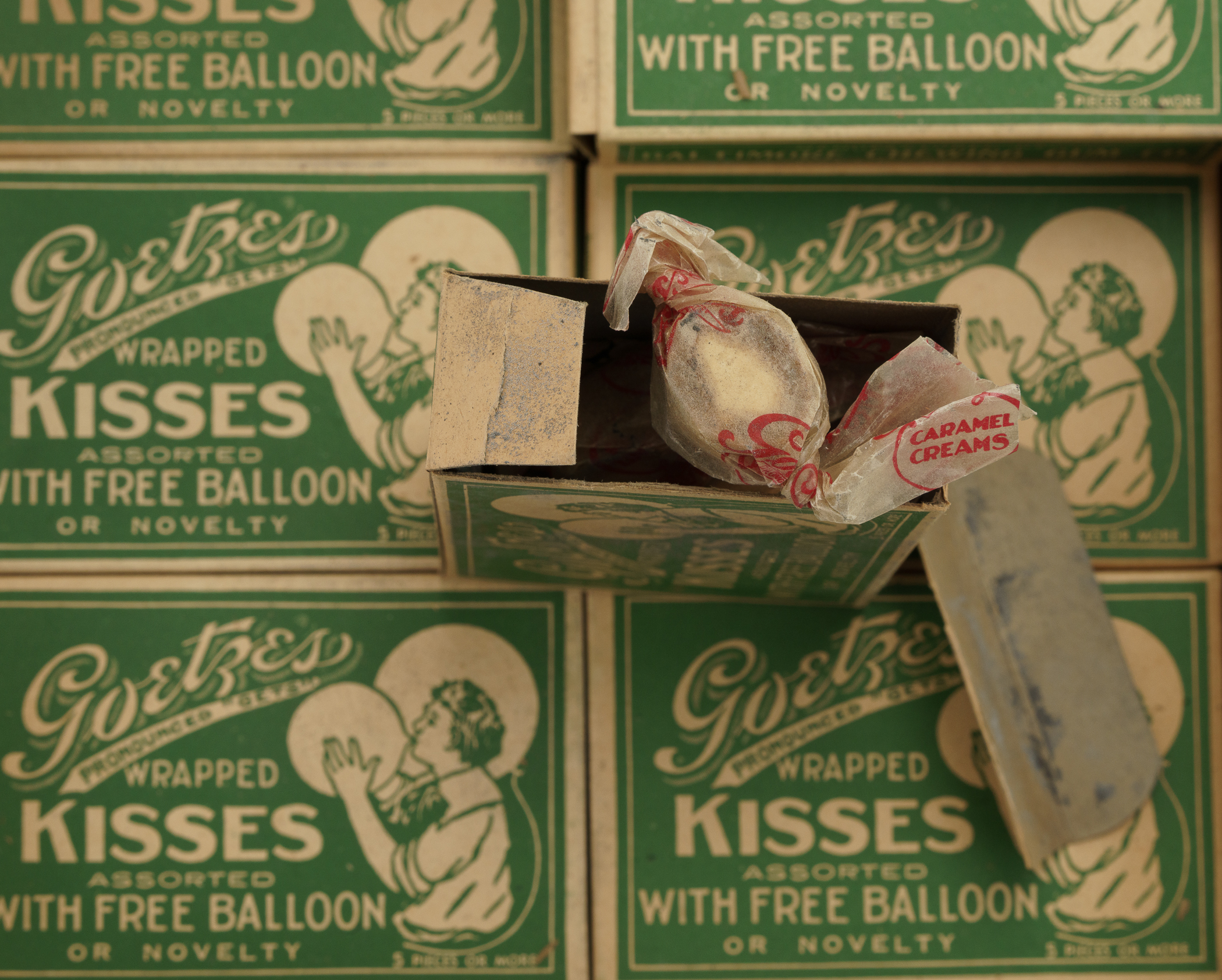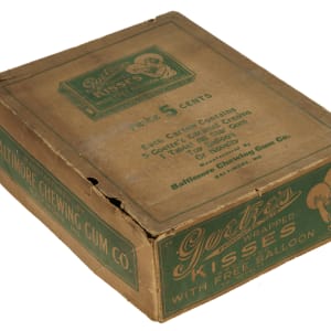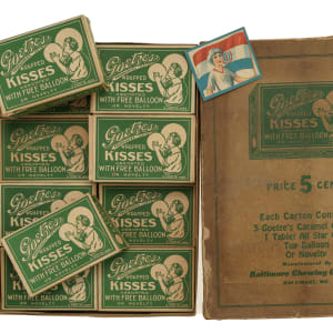 Display box of Goetze's "Wrapped Kisses," issued during the 1930s by the Baltimore Chewing Gum Company of Baltimore, Maryland, containing 20 original complete cardboard cartons of candy. The box originally housed 24 candy cartons. This rare display box and its original contents were initially offered in REA's 2010 auction. As noted directly on the cover of the display box, each candy carton contains five Goetze's caramel creams, one tablet of All Star Gum, and either a toy balloon or a novelty item. The contents, including gum and a variety of novelties (including Sun Pictures self-developing issue packs, which are very "card-like"), are included in each box. The novelties in two of the cartons, however, are identical R52 Flags of the Nation cards (No. 33 Paraguay). According to Christopher Benjamin, author of the definitive work The Sport Americana Price Guide to the Non-Sports Cards 1930-1960, Flags of the Nations cards were distributed in Flag Gum. Benjamin probably made that assumption based upon the printing on the back of each card, which reads "Flags of the Nations - This is one of fifty cards in the Flag Gum," because he later notes that "no wrapper has been seen to date." Since then, R52 wrappers have been discovered, and it is now known that Flags of the Nations cards were distributed in multiple ways including Baltimore Chewing Gum candy cartons as well as packs. Each candy carton (4.5 x 3 x 1.25 inches) is in Excellent to Near Mint condition, appearing almost exactly as they were originally issued. The display box (9.5 x 12.5 x 4 inches) is heavily toned, with a chip in one side flap on the lid (the missing piece is present with the box) and small tears along the edges. In Good condition overall.