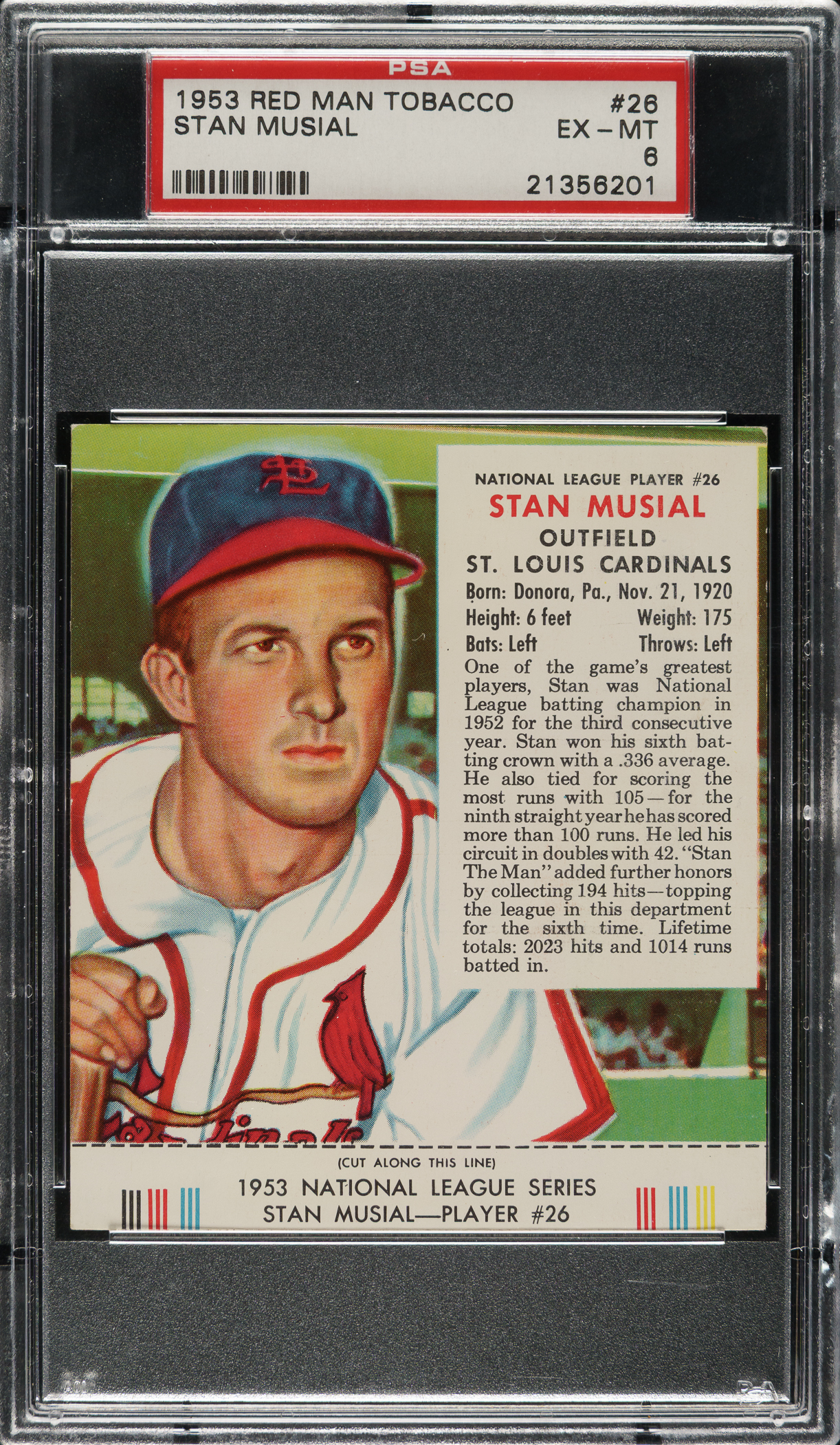 Graded EX-MT 6 by PSA. St. Louis Cardinals Hall of Famer Stan Musial.