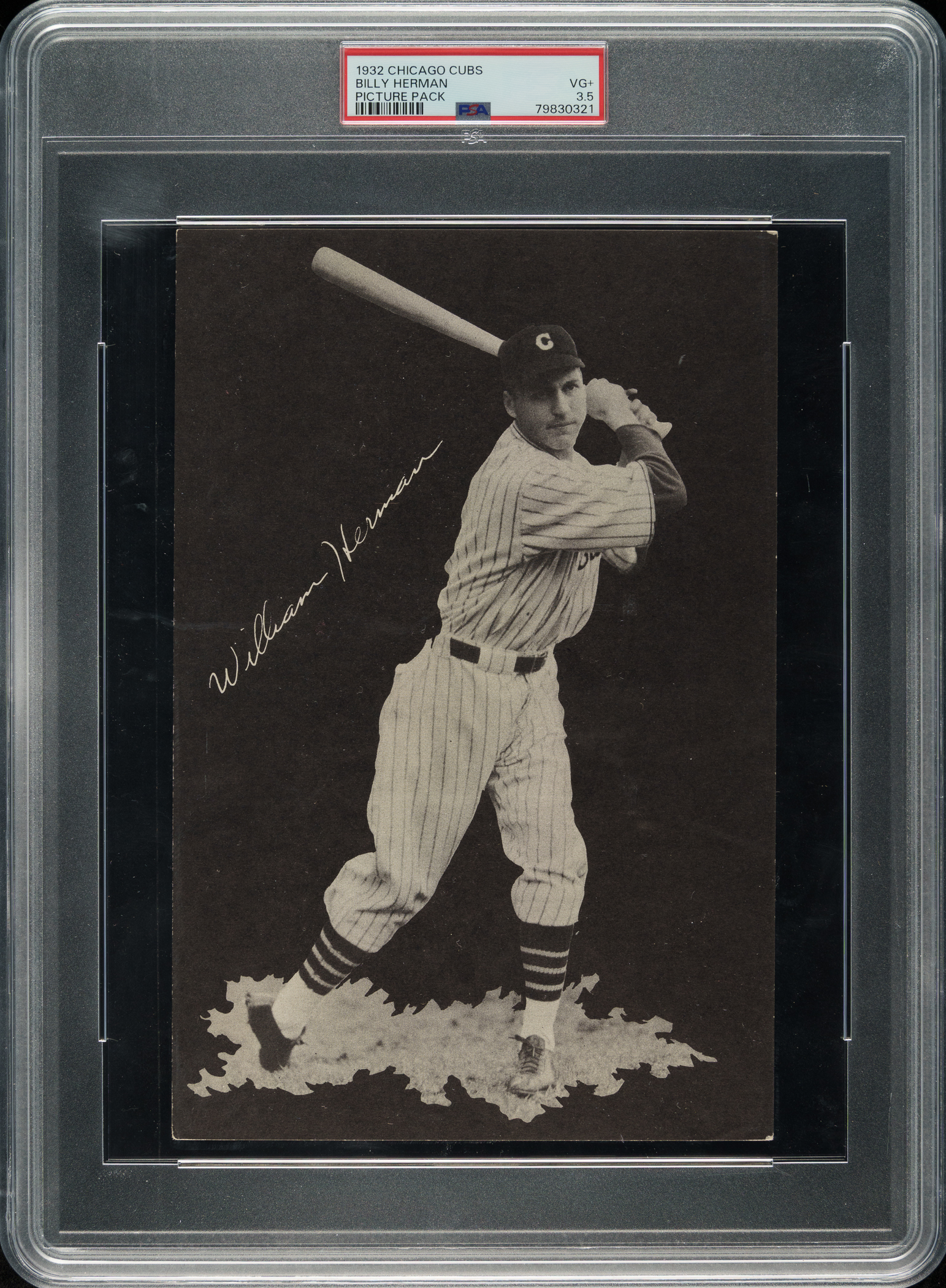 Graded VG+ 3.5 by PSA. Chicago Cubs Hall of Famer Billy Herman. Please note the spots on the back of the card are air bubbles from the PSA holder, not defects.