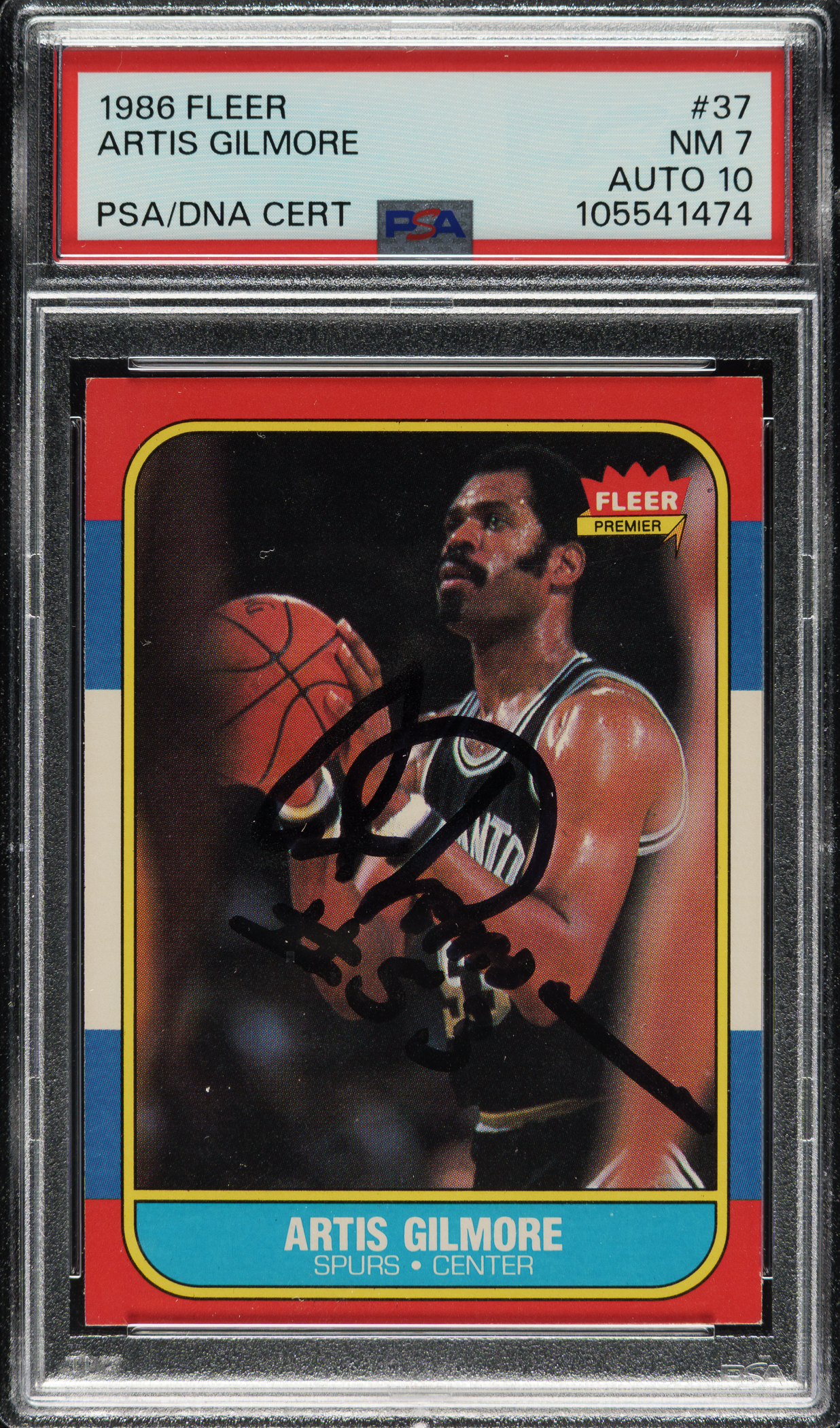 PSA/DNA has encapsulated the card, grading the signature GEM MINT 10 and the card NM 7. San Antonio Spurs basketball Hall of Famer Artis Gilmore.