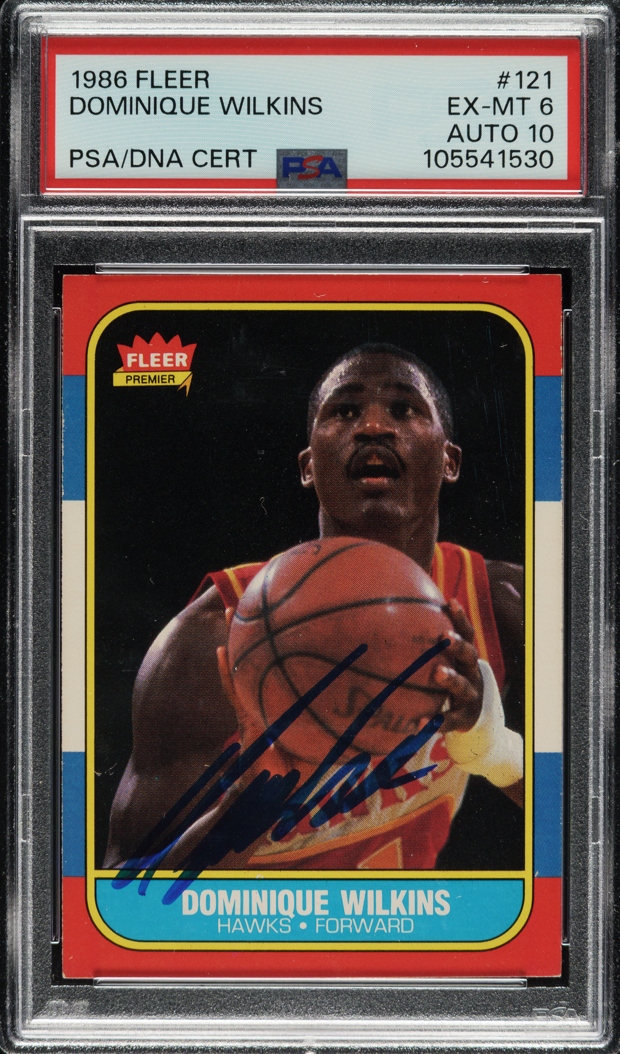 PSA/DNA has encapsulated the card, grading the signature GEM MINT 10 and the card EX-MT 6. Atlanta Hawks basketball Hall of Famer Dominique Wilkins.