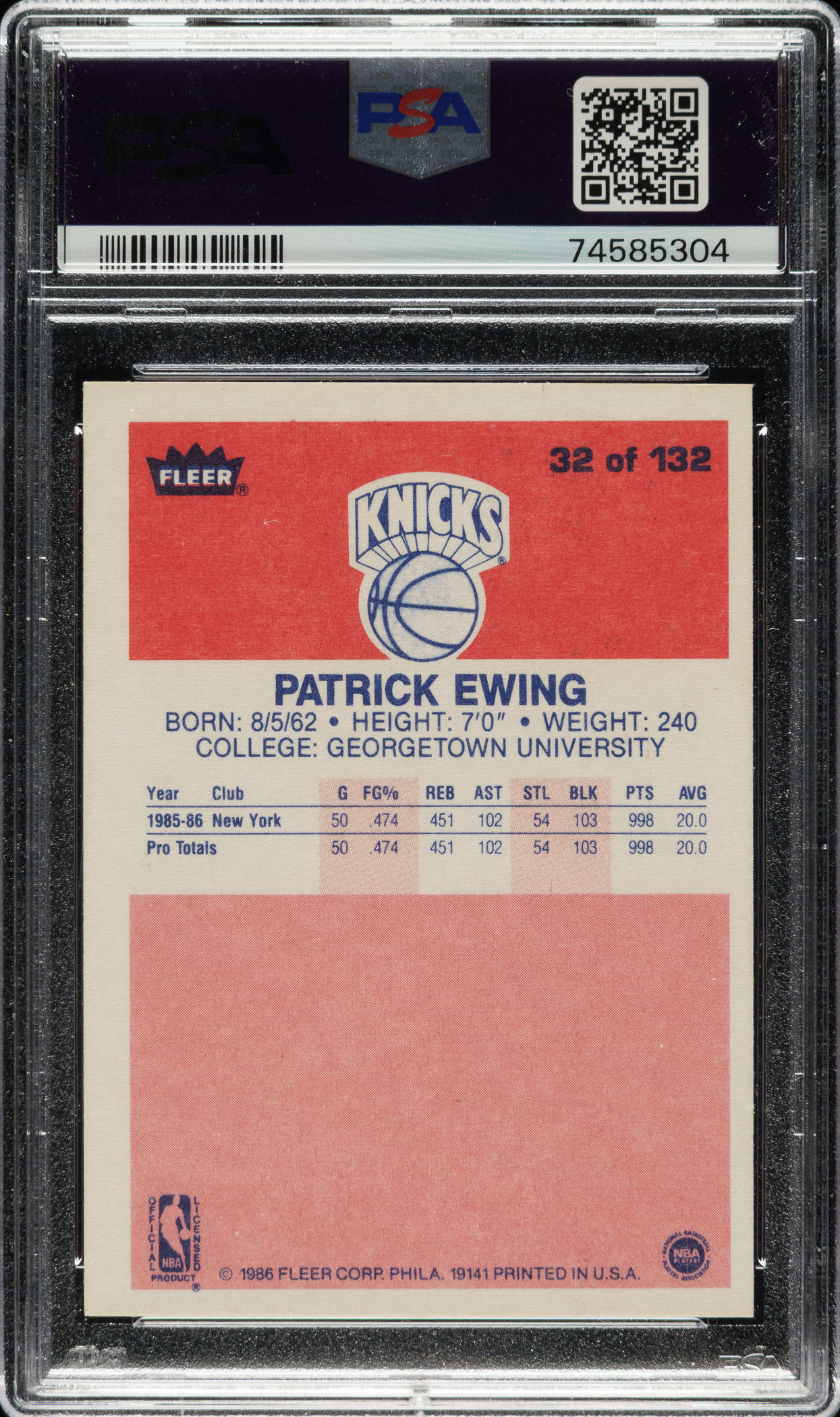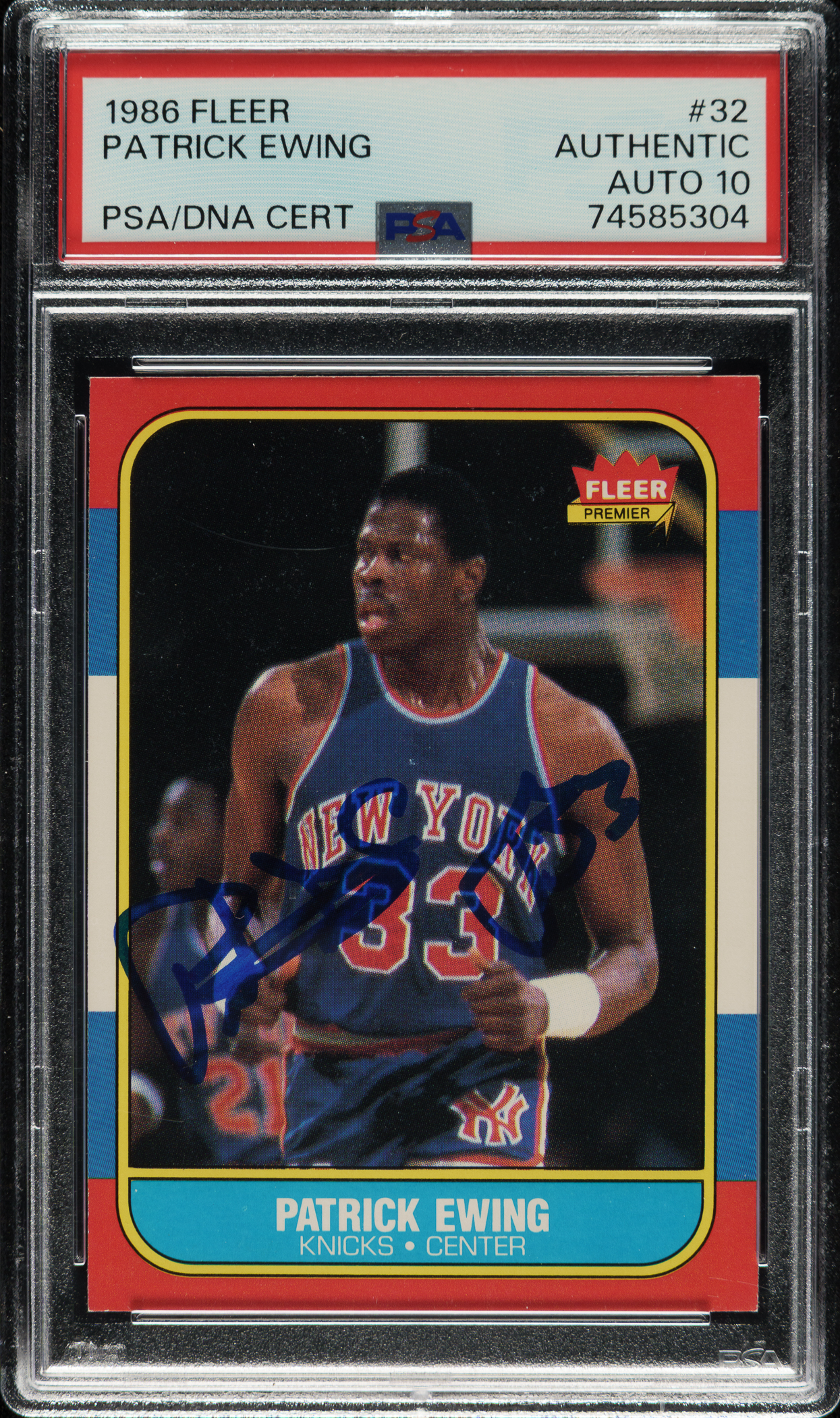 PSA/DNA has encapsulated the card, grading the signature GEM MINT 10. New York Knicks basketball Hall of Famer Patrick Ewing.