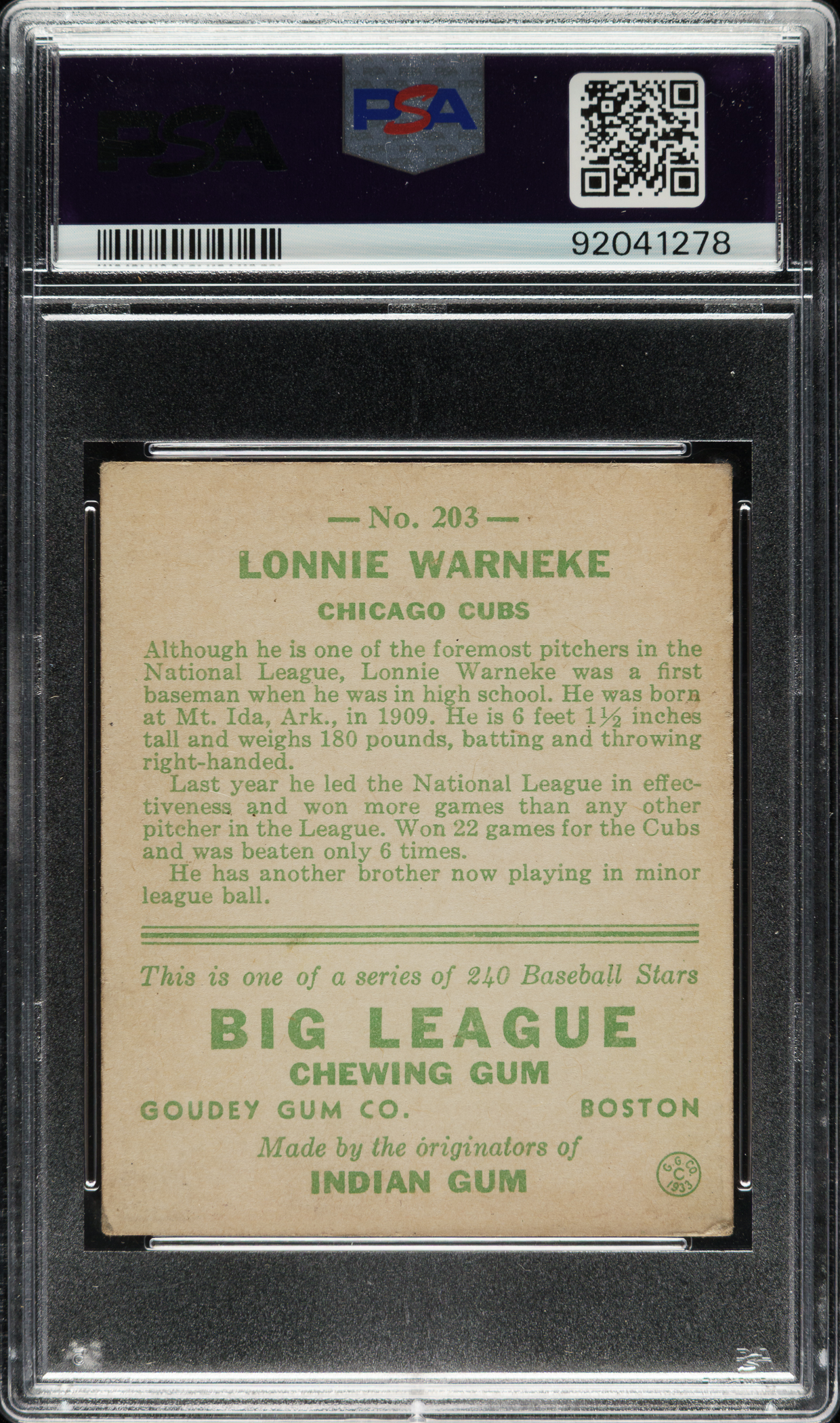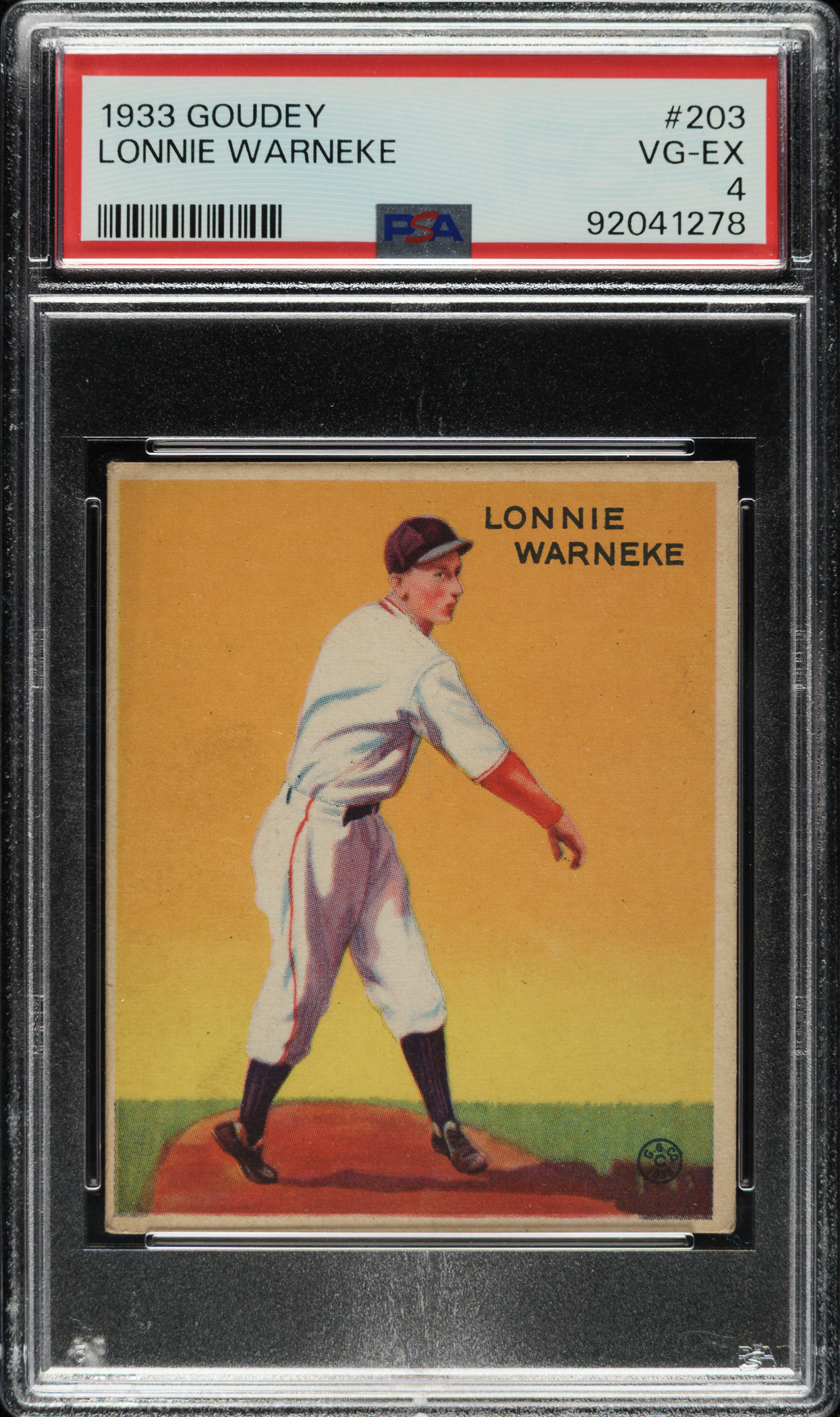 Lot # 1054: 1933 R319 Goudey #203 Lonnie Warneke PSA VG-EX 4