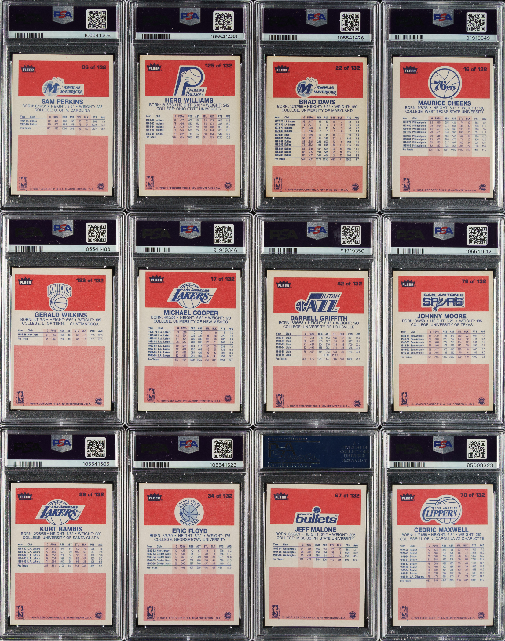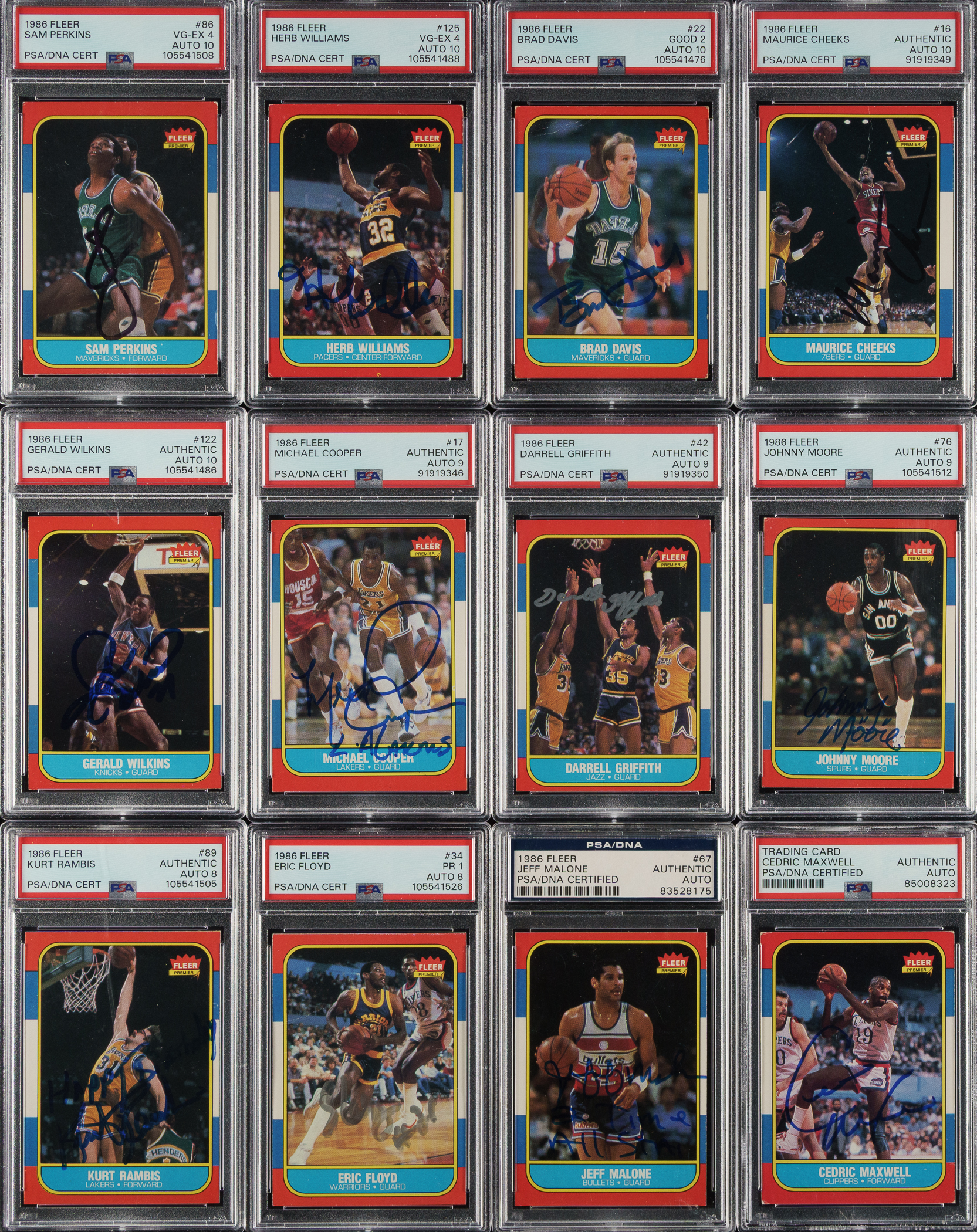Collection of twelve signed 1986-1987 Fleer basketball cards, featuring Philadelphia 76ers and Los Angeles Lakers basketball Hall of Famers Maurice Cheeks and Michael Cooper. Each card has been graded and encapsulated by PSA. PSA Grading Composite: VG-EX 4 with GEM MINT 10 Signature (2 cards): #86 and 125. GOOD 2 with GEM MINT 10 Signature (1 card): #22. POOR 1 with NM-MT 8 Signature (1 card): #34. Authentic with GEM MINT 10 Signature (2 cards): #16 Cheeks and 122. Authentic with MINT 9 Signature (3 cards): #17 Cooper, 42, and 76. Authentic with NM-MT 8 Signature (1 card): #89. Authentic with Authentic Signature (2 cards): #67 and 70. Total: 12 cards. The size/weight of this item requires that there will be an additional shipping charge for this lot.