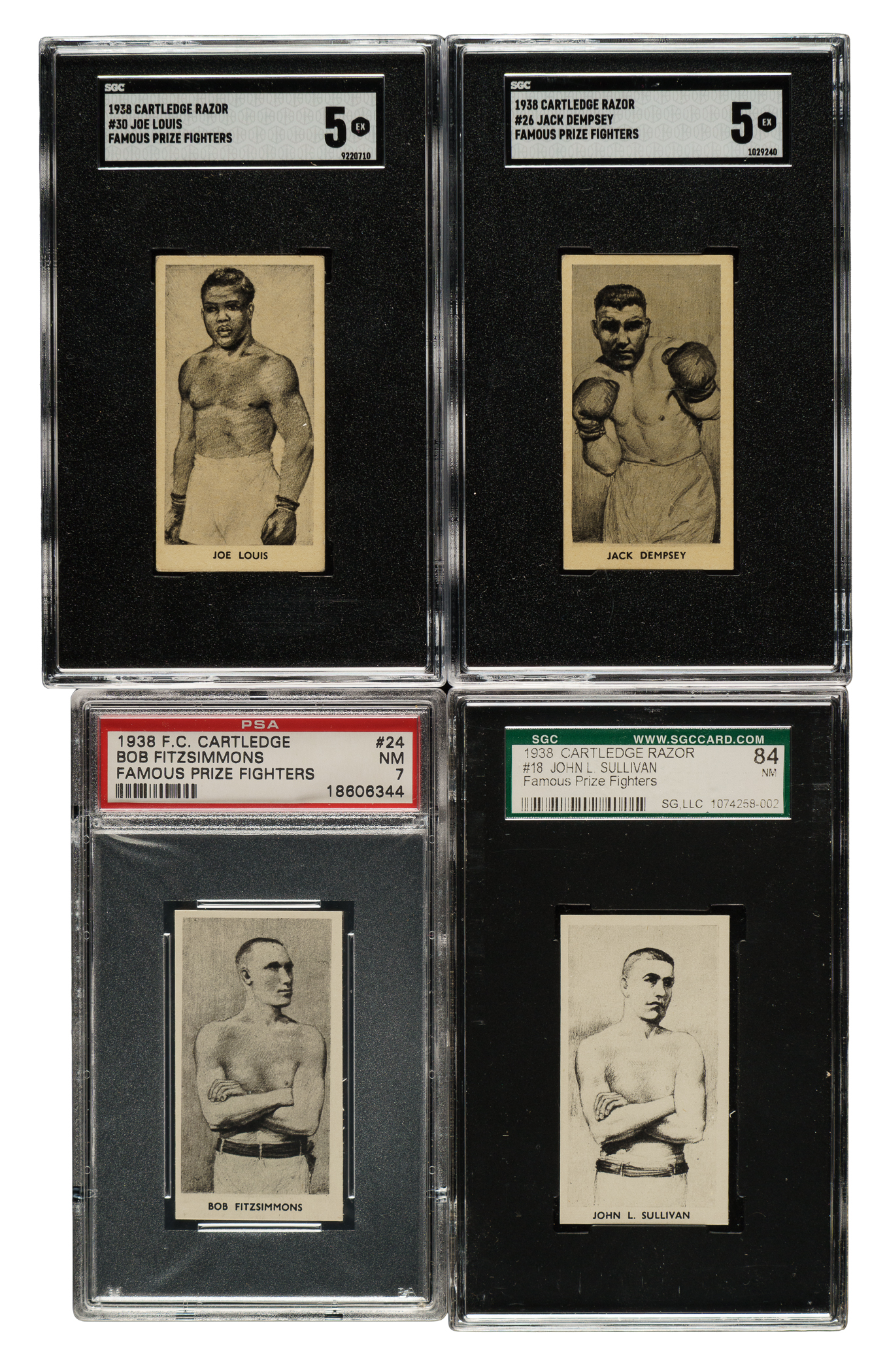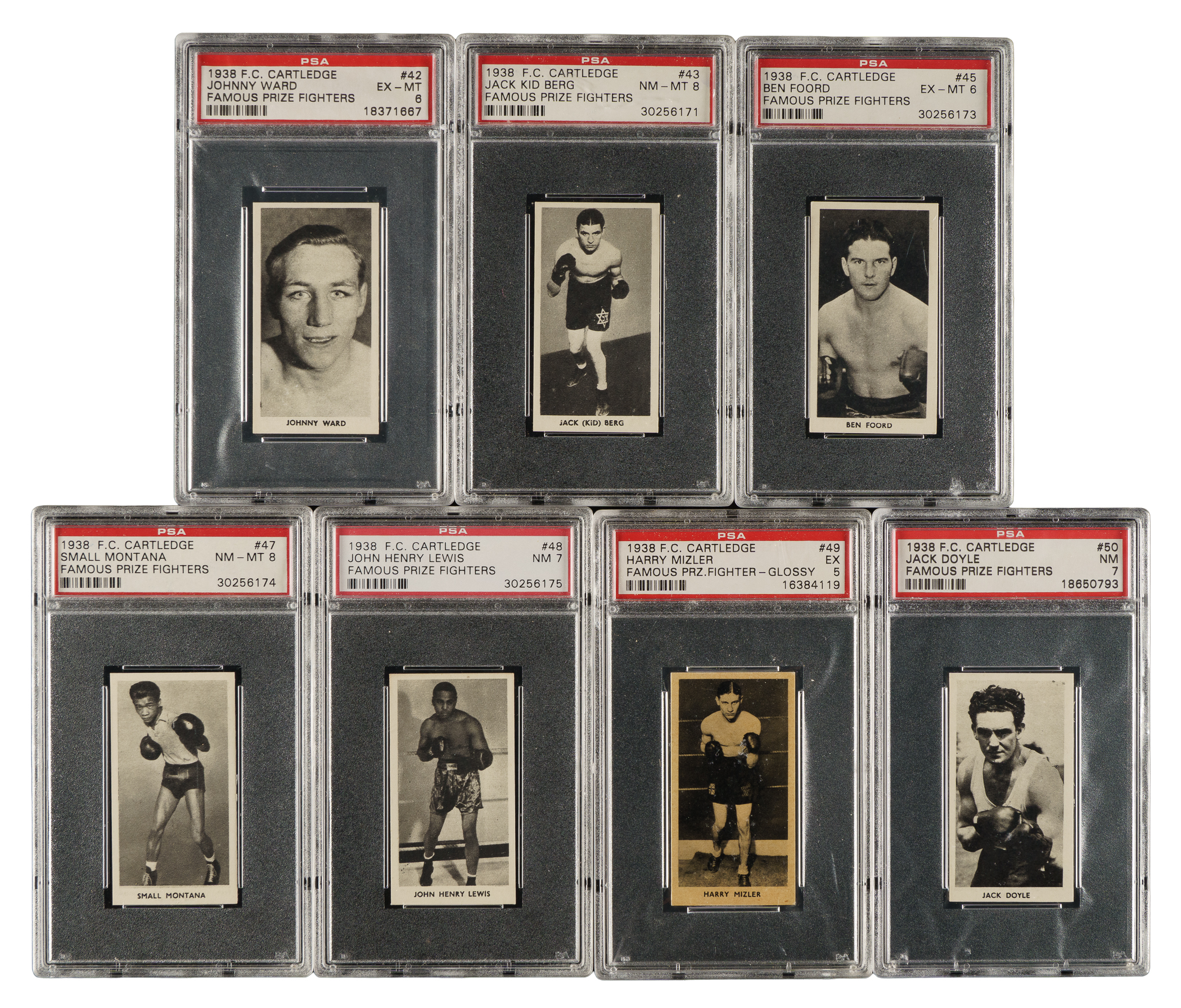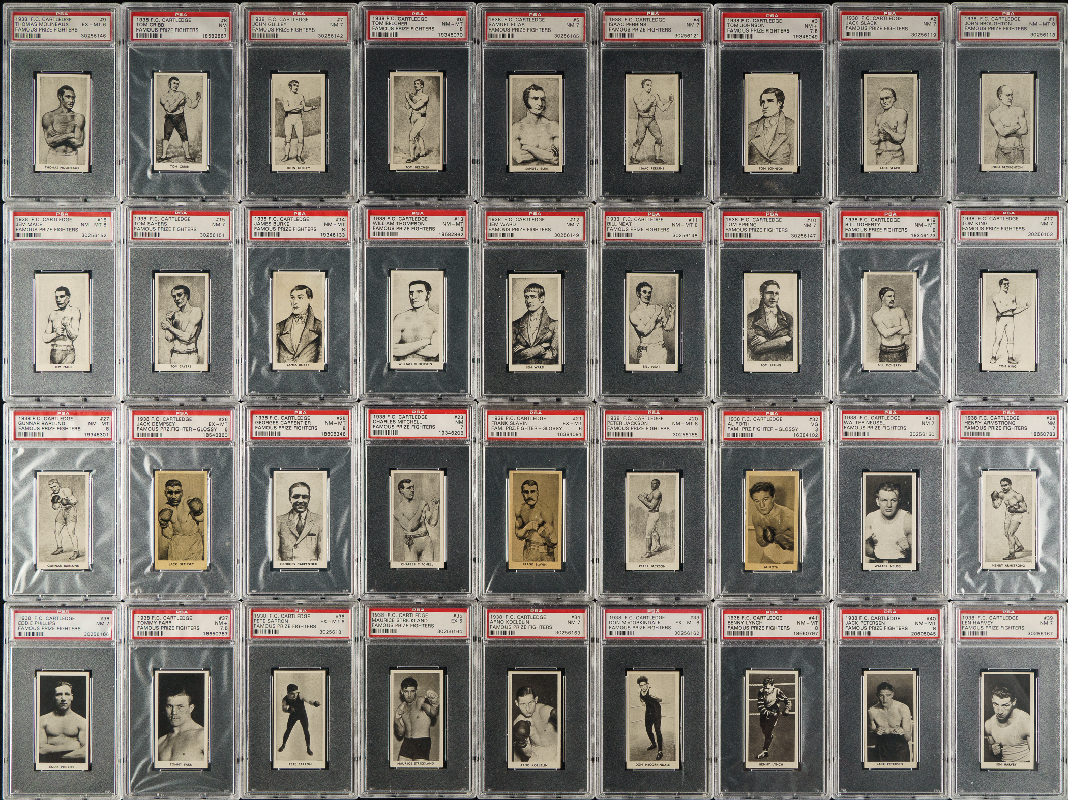 Near-complete set (46/50) of 1938 F.C. Cartledge "Famous Prize Fighters" cards, each graded and encapsulated by PSA (44) or SGC (3). Missing the following four cards for completion: #22, 29 Schmeling, 44, and 46. PSA Grading Composite: NM-MT 8 (14 cards): #1, 6, 11, 13, 14, 16, 19, 20, 25, 27, 40, 41, 43, and 47. NM+ 7.5 (2 cards): #3 and 37. NM 7 (19 cards): #2, 4, 5, 7, 8, 10, 12, 15, 17, 18 (SGC NM 84), 23, 24, 28, 31, 34, 38, 39, 48, and 50. EX-MT 6 (7 cards): #9, 21, 26 Dempsey, 33, 36, 42, and 45. EX 5 (4 cards): #26 Dempsey (SGC), 30 Louis (SGC), 35, and 49. VG 3 (1 card): #32. Total: 47 cards (Near-complete set plus 1 duplicate). The size/weight of this item requires that there will be an additional shipping charge for this lot.