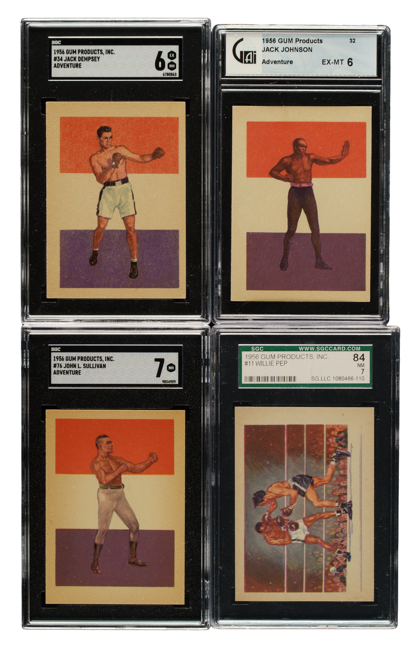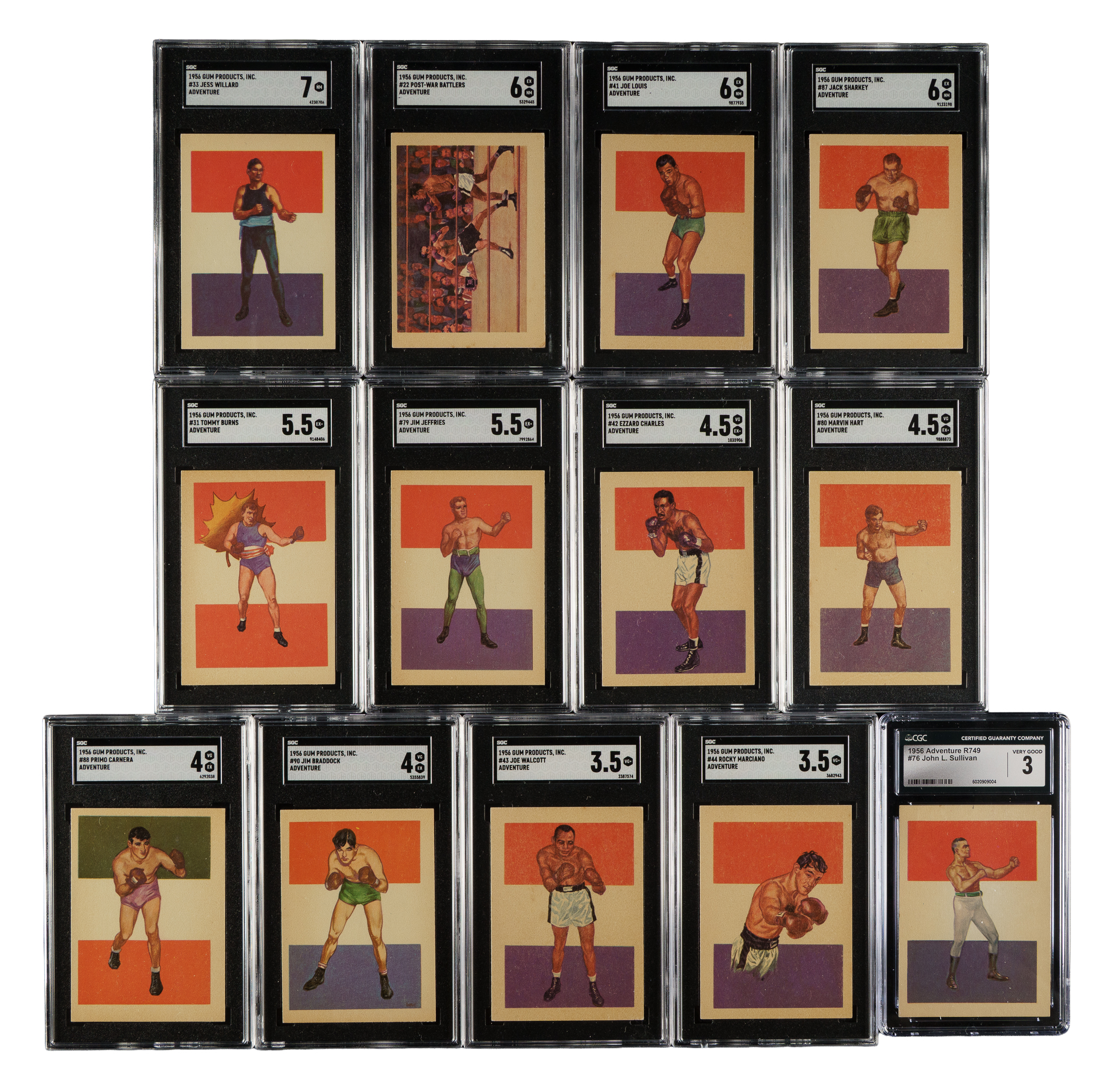 Collection of seventeen 1957 American Gum cards, each graded and encapsulated by SGC (15), CGC (1) and GAI (1). SGC Grading Composite: NM 7 (3 cards): #11 (NM 84), 33, and 76 Sullivan. EX/NM 6 (5 cards): #22, 32 Johnson (GAI), 34 Dempsey, 41 Louis, and 87. EX+ 5.5 (2 cards): #31 and 79. VG/EX+ 4.5 (2 cards): #42 and 80. VG/EX 4 (2 cards): #88 and 90. VG+ 3.5 (2 cards): #43 and 44 Marciano. VG 3 (1 card): #76 Sullivan (CGC). Total: 17 cards. The size/weight of this item requires that there will be an additional shipping charge for this lot.