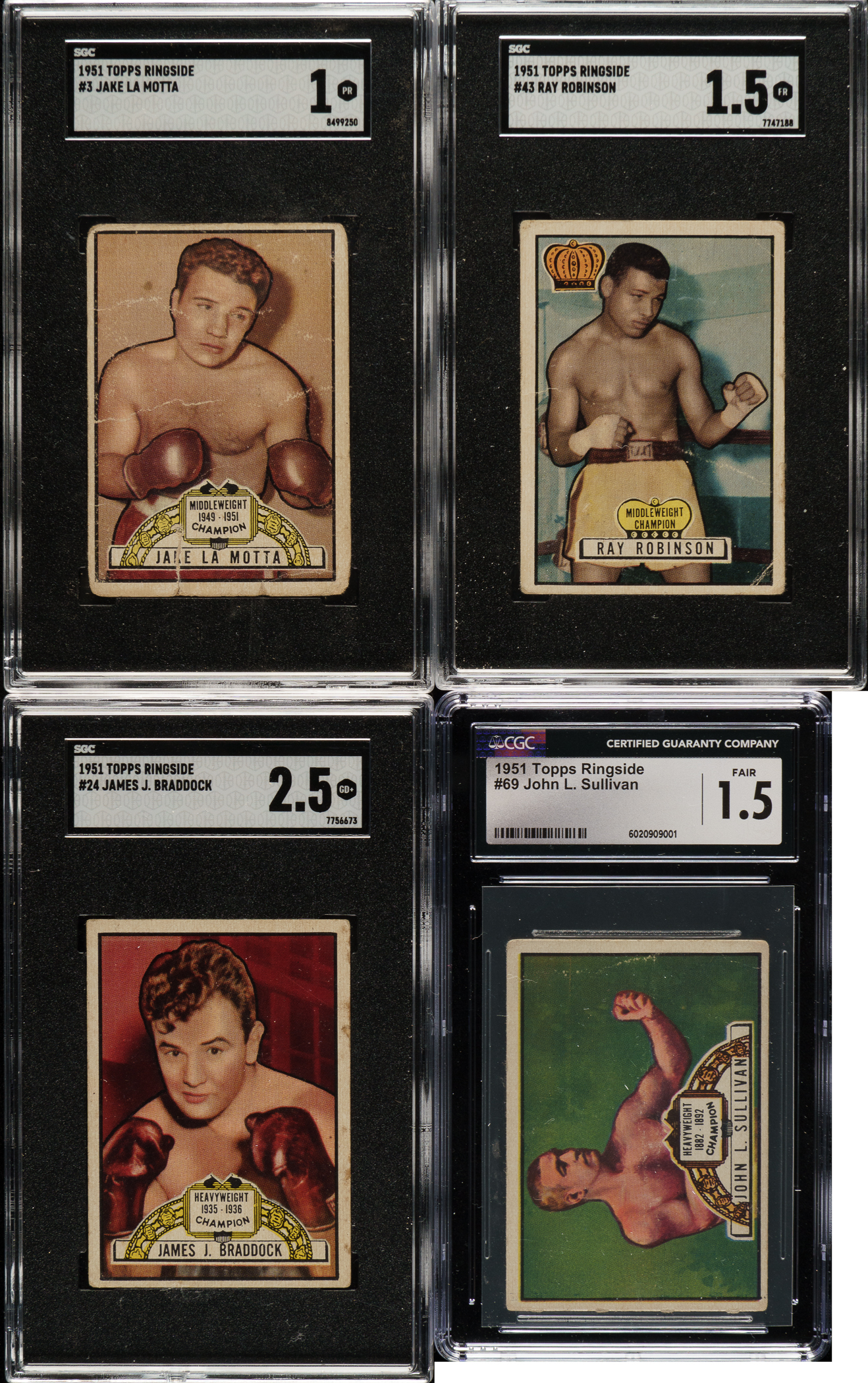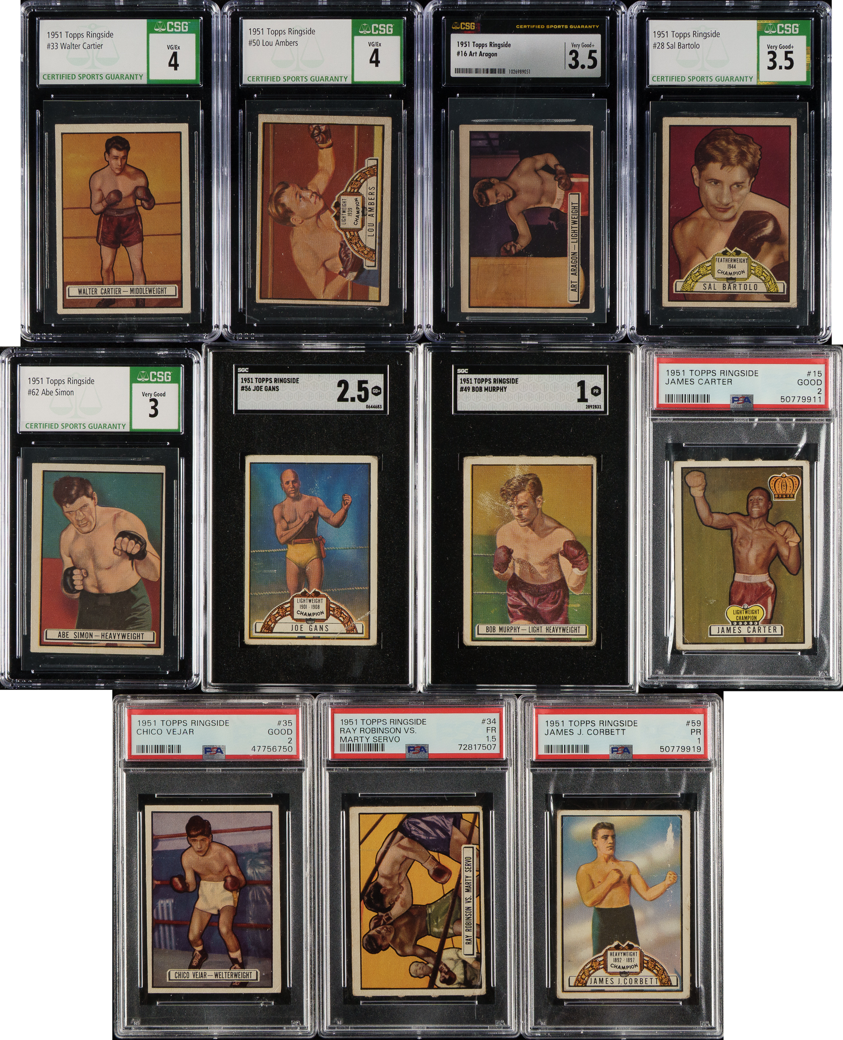 Collection of fifteen 1951 Topps Ringside boxing cards, each graded and encapsulated by SGC (5), PSA (4), or CSG (6). SGC Grading Composite: VG/EX 4 (2 cards): #33 (CSG) and 50 Ambers (CSG). VG+ 3.5 (2 cards): #16 (CSG) and 28 (CSG). VG 3 (1 card): #62 (CSG). GOOD+ 2.5 (2 cards): #24 Braddock and 56 Gans. GOOD 2 (2 cards): #15 Carter (PSA) and 35 (PSA). FAIR 1.5 (3 cards): #34 Robinson/Servo (PSA), 43 Robinson, and 69 Sullivan (CGC). POOR 1 (3 cards): #3 LaMotta, 49, and 59 Corbett (PSA). Total: 15 cards. The size/weight of this item requires that there will be an additional shipping charge for this lot.