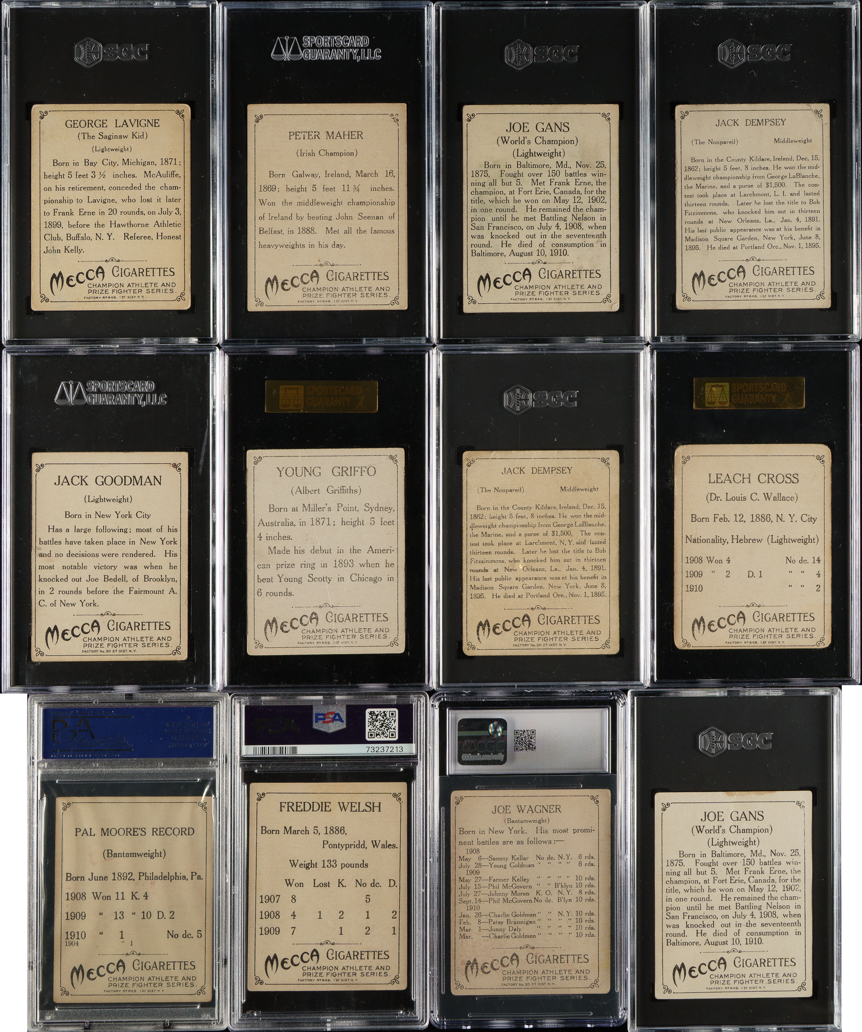 Collection of twelve 1910 T220 Mecca Champions boxing cards, featuring boxing Hall of Famers Jack Dempsey and Joe Gans. Each card has been graded and encapsulated by SGC (9), PSA (2), or CGC (1). SGC Grading Composite: EX 5 (1 card): Maher (EX 60). VG/EX 4 (2 cards): Goodman (VG/EX 50) and Moore (PSA). VG+ 3.5 (1 card): Welsh (PSA). VG 3 (3 cards): Dempsey, Gans and Lavigne/silver border. GOOD 2 (2 cards): Cross (GOOD 30) and Griffo (GOOD 30). FAIR 1.5 (2 cards): Dempsey and Gans. POOR 1 (1 card): Wagner. Total: 12 cards. The size/weight of this item requires that there will be an additional shipping charge for this lot.