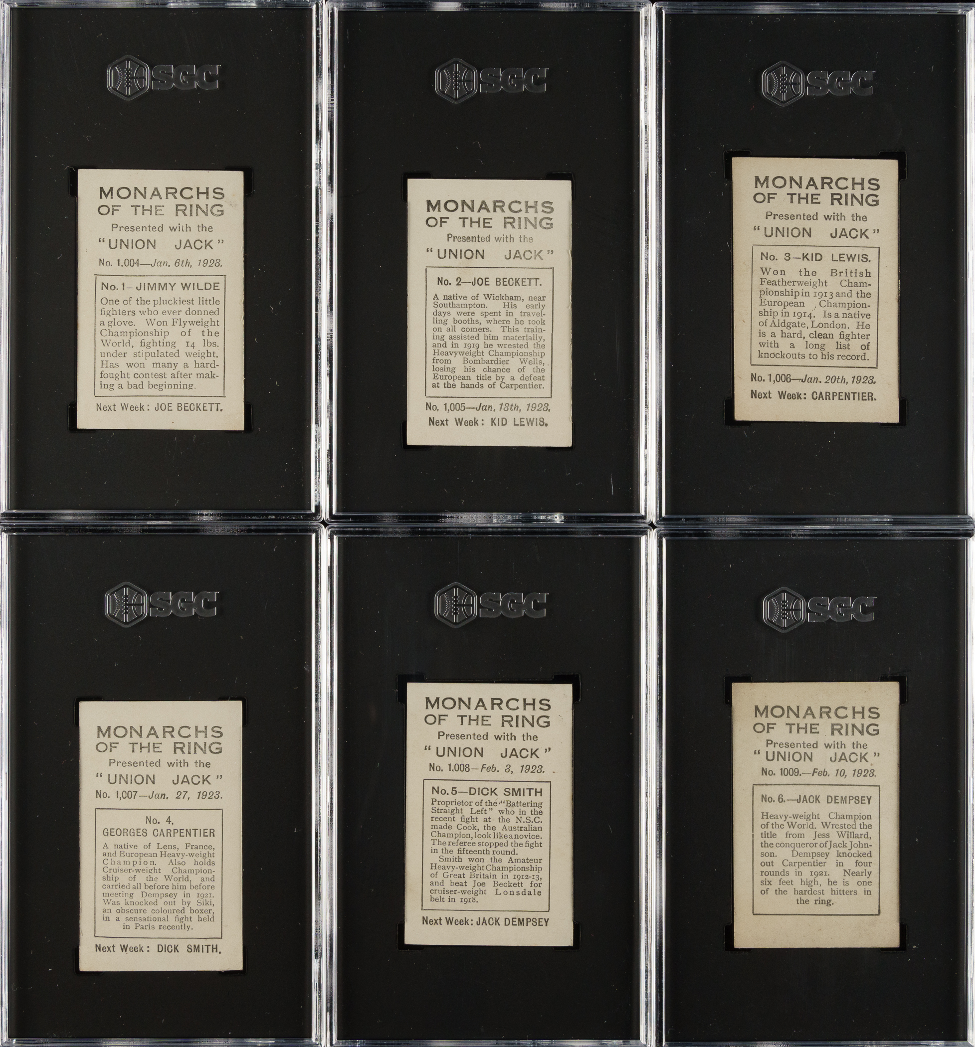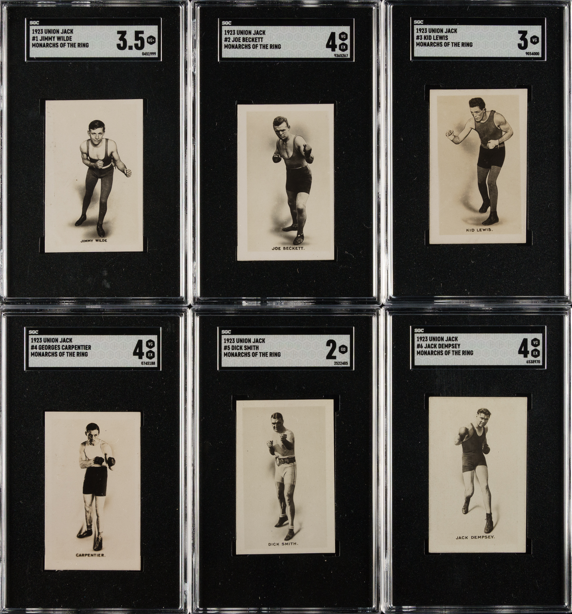 Complete set of 1923 Union Jack "Monarchs Of The Ring" Boxing cards, each graded and encapsulated by SGC. This complete set consists of the following: #1 Wilde (VG+ 3.5), 2 Beckett (VG/EX 4), 3 Lewis (VG 3), 4 Carpentier (VG/EX 4), 5 Smith (GOOD 2), and 6 (VG/EX 4). Total: 6 cards.