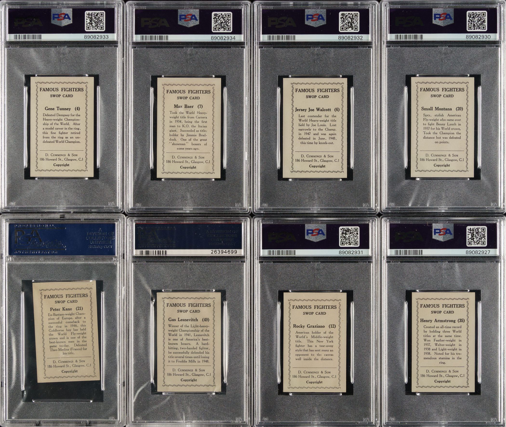 Collection of eight 1947 D. Cummings & Son "Famous Fighters" cards, each graded and encapsulated by PSA. PSA Grading Composite: NM-MT 8 (2 cards): #4 Tunney and 7 Baer. NM 7 (3 cards): #6 Walcott RC, 20, and 21. EX-MT+ 6.5 (1 card): #49. EX-MT 6 (2 cards): #12 Graziano and 35 Armstrong. Total: 8 cards.