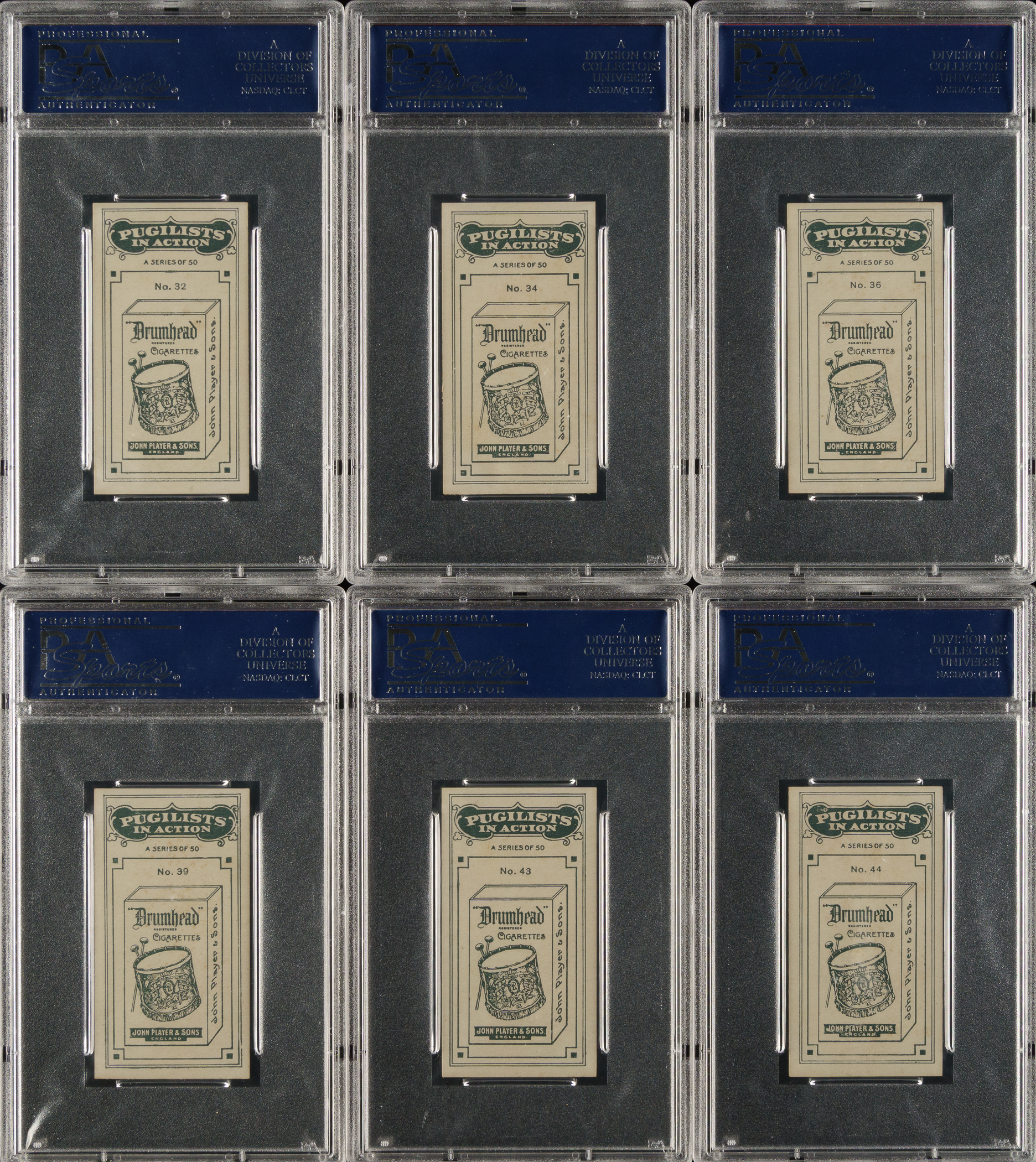 Collection of six 1928 John Player & Son "Pugilists In Action" cards, each graded and encapsulated EX 5 by PSA. This collection consists of the following: #32, 34, 36, 39, 43, and 44. Total: 6 cards.