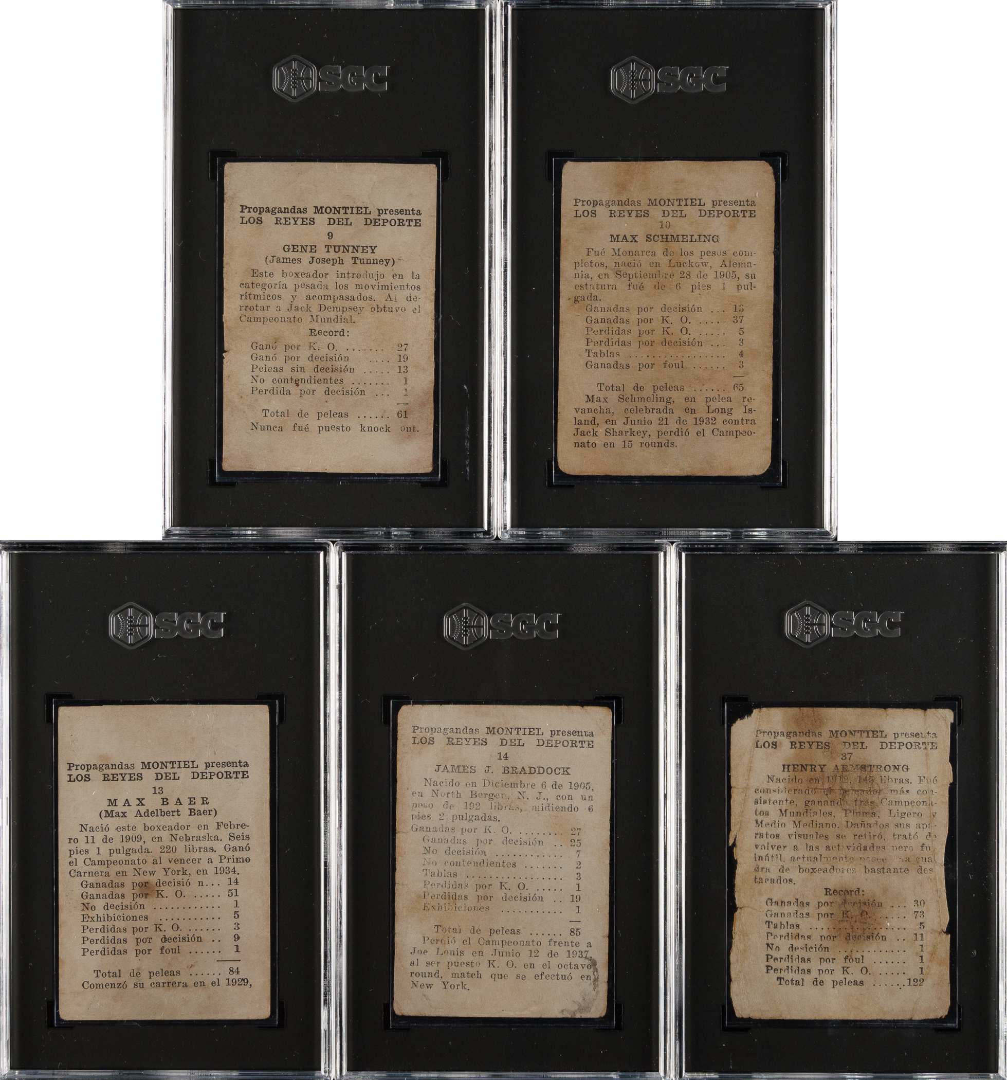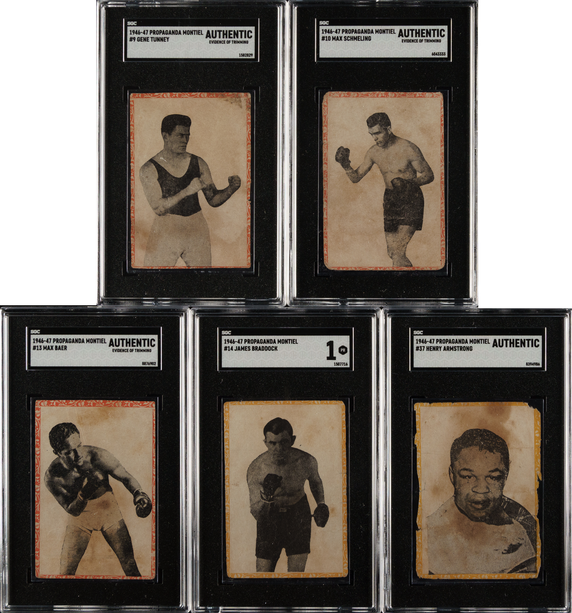 Collection of five 1946-1947 Propaganda Montiel boxing Hall of Fame cards, each graded and encapsulated by SGC. This collection consists of the following: #9 Tunney (Authentic), 10 Schmeling (Authentic), 13 Baer (Authentic), 14 Braddock (POOR 1), and 37 Armstrong (Authentic). Total: 5 cards.