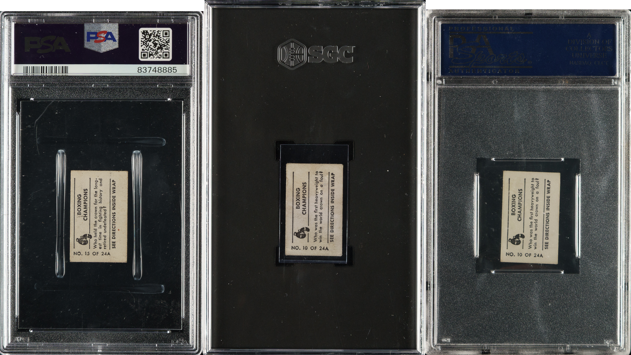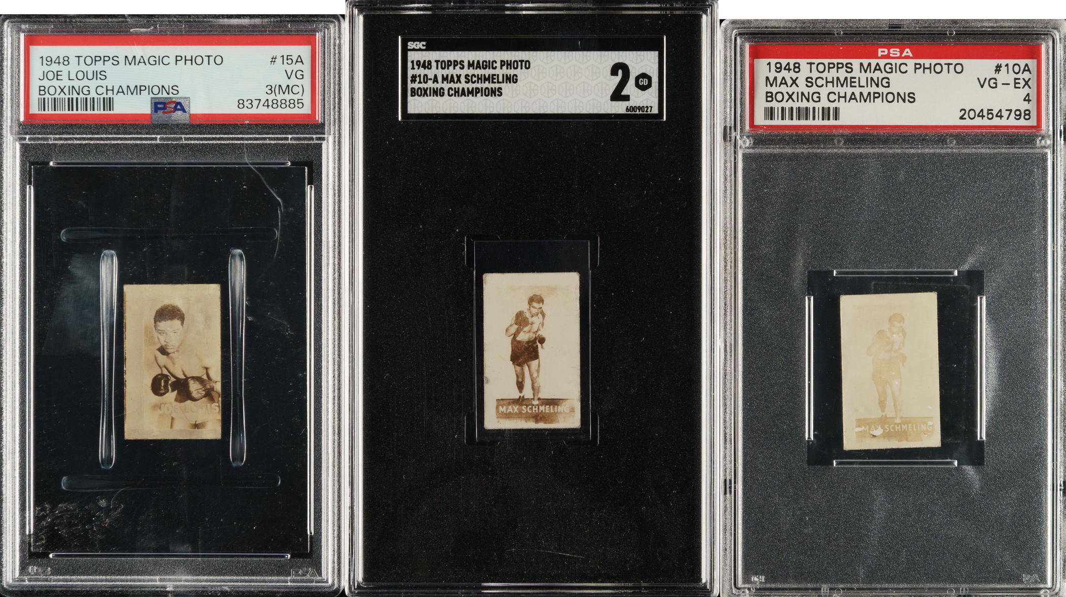 Trio of 1948 Topps Magic Photos boxing cards, featuring boxing Hall of Famers Joe Louis and Max Schmeling. Each card has been graded and encapsulated by PSA or SGC. This trio consists of the following: #15A Louis (VG 3 MC) and two 10A Schmeling (VG-EX 4 and SGC GOOD 2). Total: 3 cards.